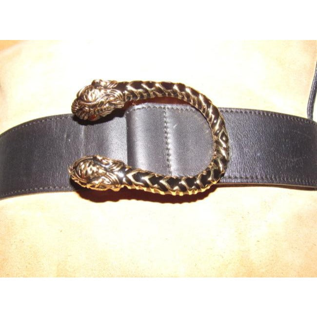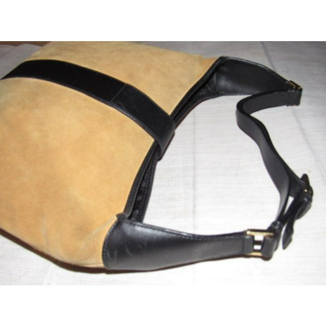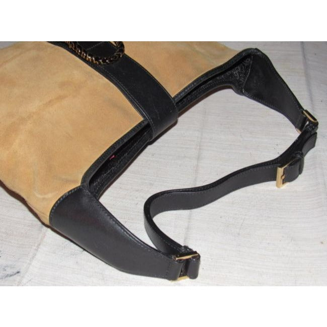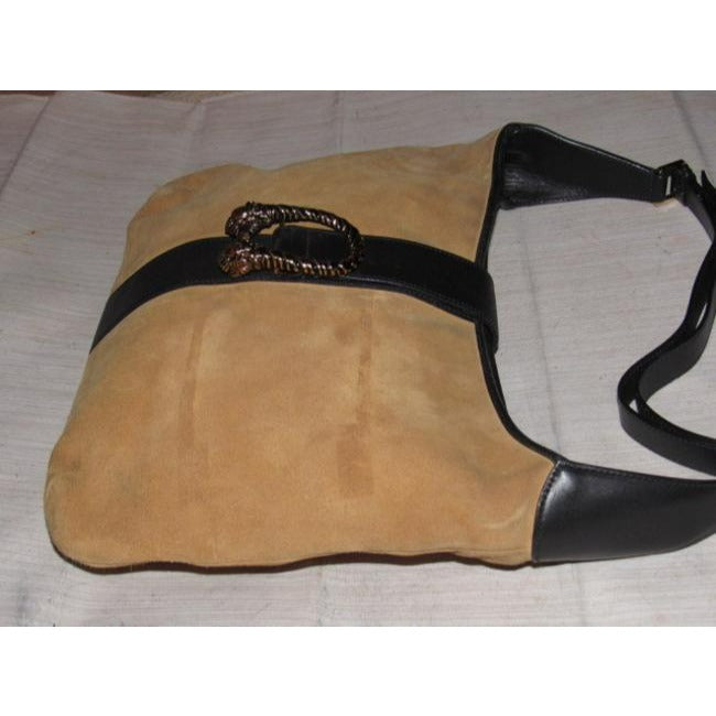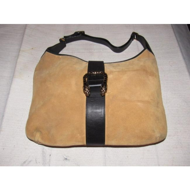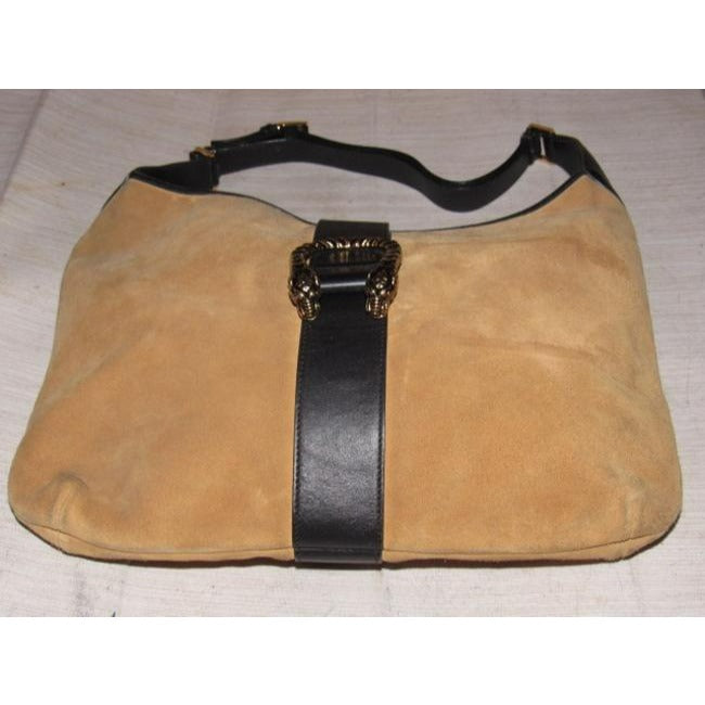 This very hard to come by style from Gucci is a version of the infamous Jackie- O style! It is a large size in camel suede with brown leather throughout. It has a snap lock clasp with a fabulous, dual tiger's head, engraved accent! The bottom is expandable to hold more and the strap has a unique, buckle to lengthen or shorten it.