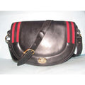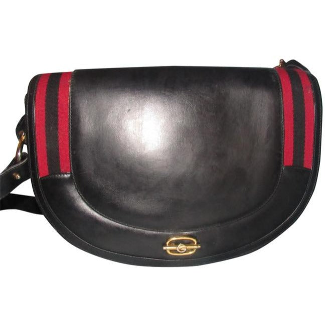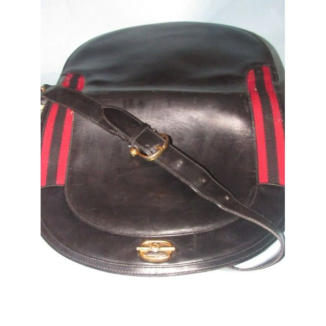 * For sale is an AMAZING, early Gucci, envelope top, saddle bag style, extra large size semi-circular shape, shoulder purse in a black glossy leather with red and blue striped edges an expandable, accordion style bottom, and multiple compartments and pockets! This is a beautiful, rare, early purse from Gucci with a timeless style that is still modern and edgy today!
