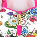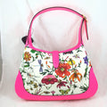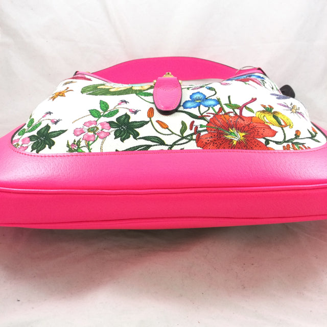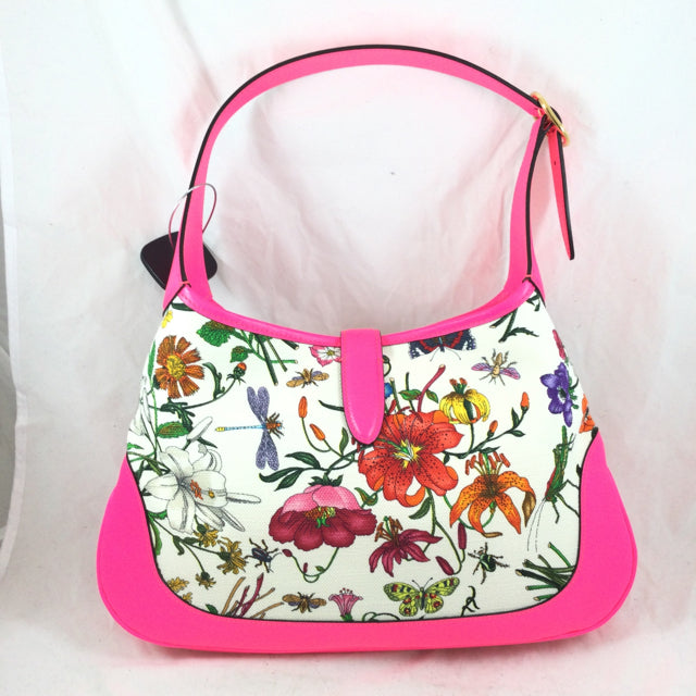 Gucci Flora Jackie Shoulder Bag. Floral Print Canvas with Neon Leather Detail. Goldtone Front Clasp.