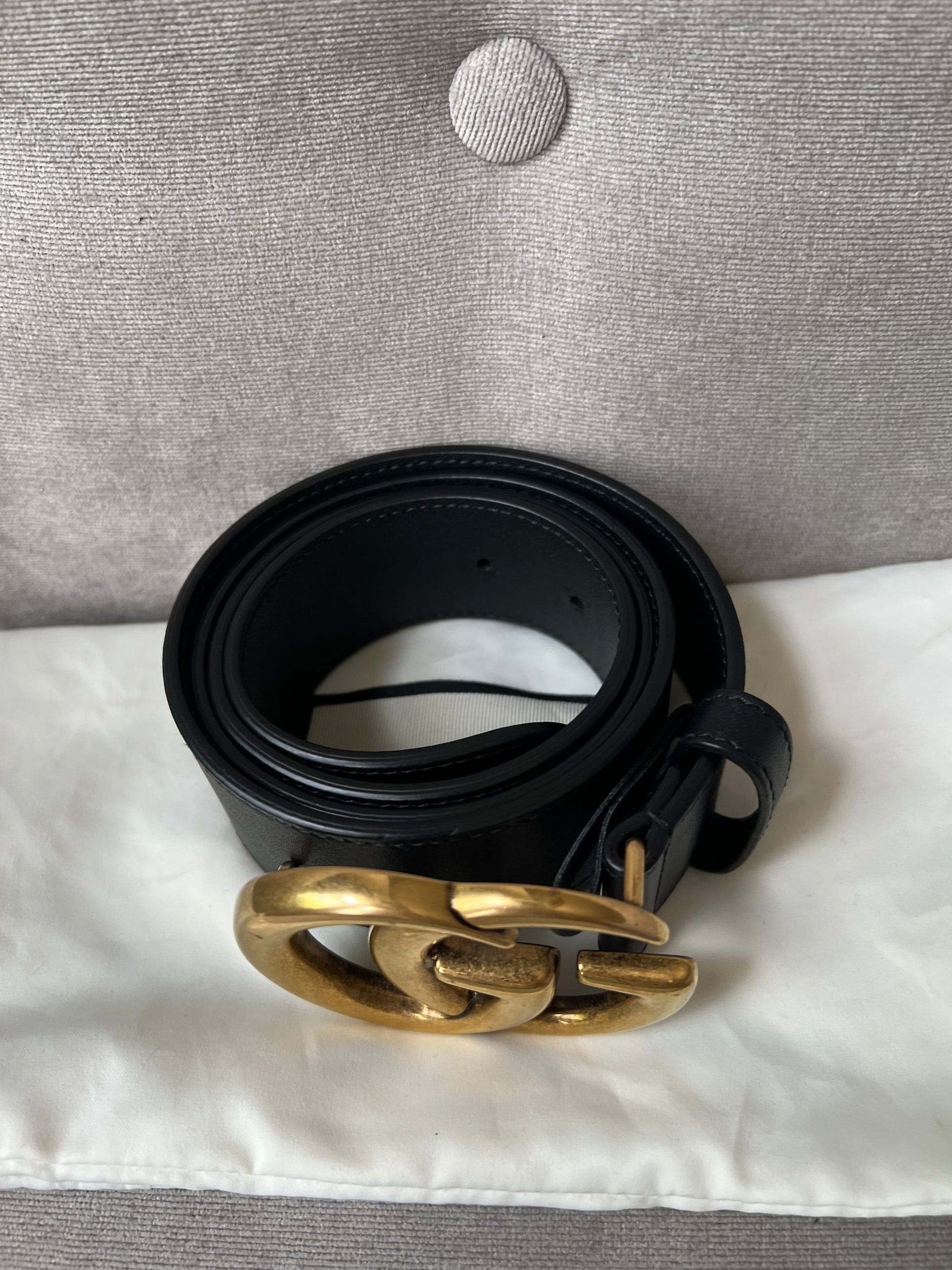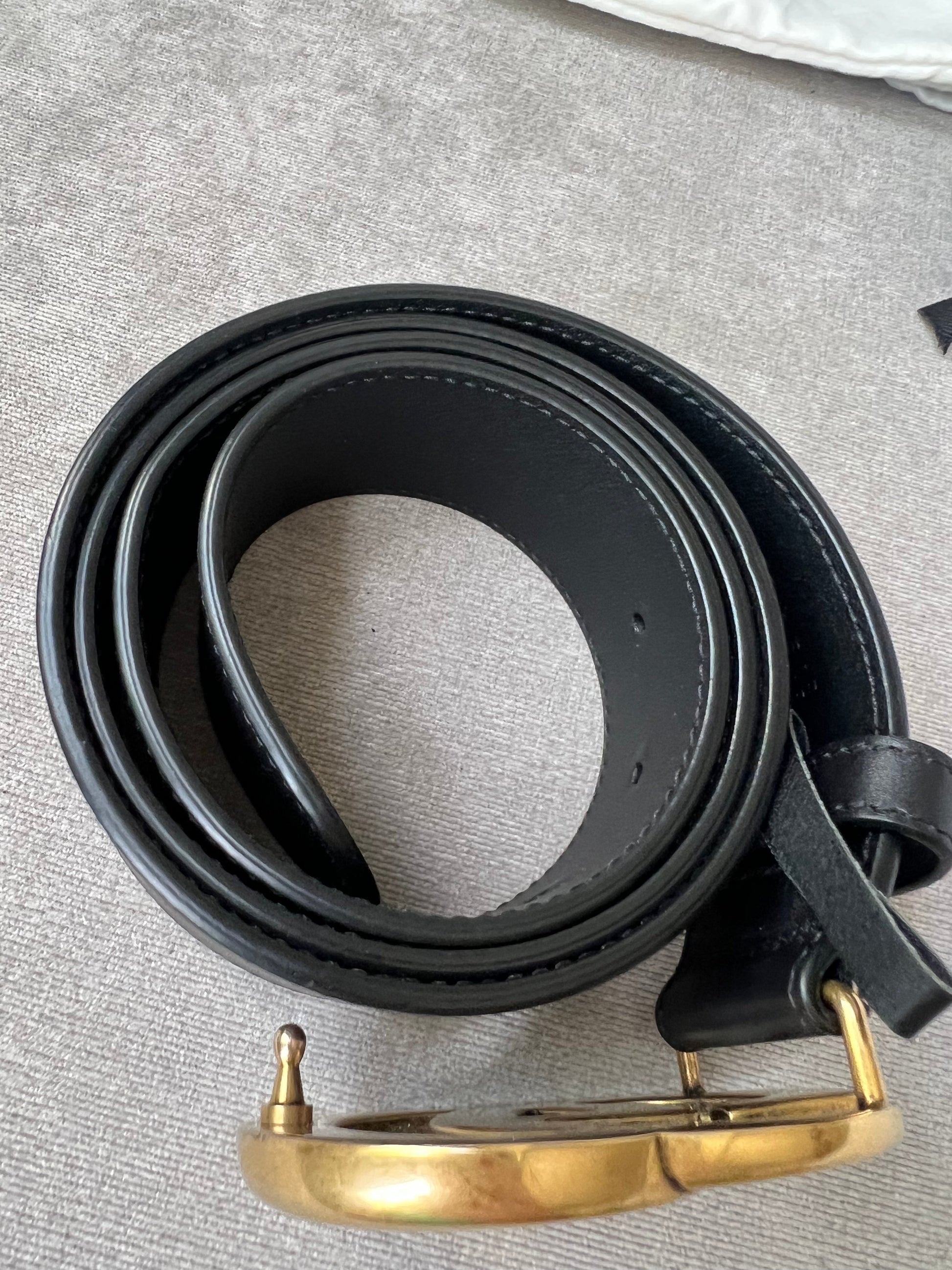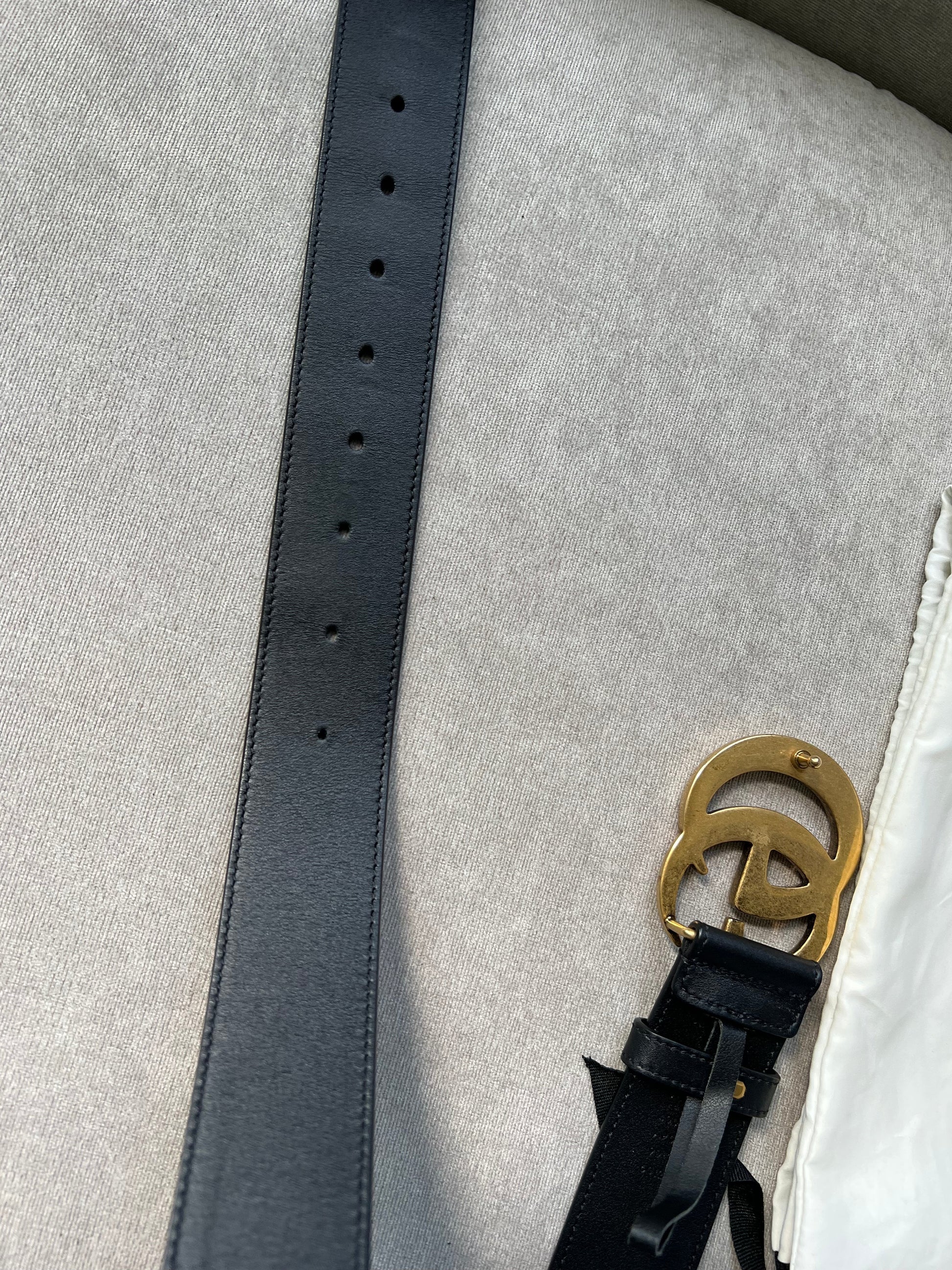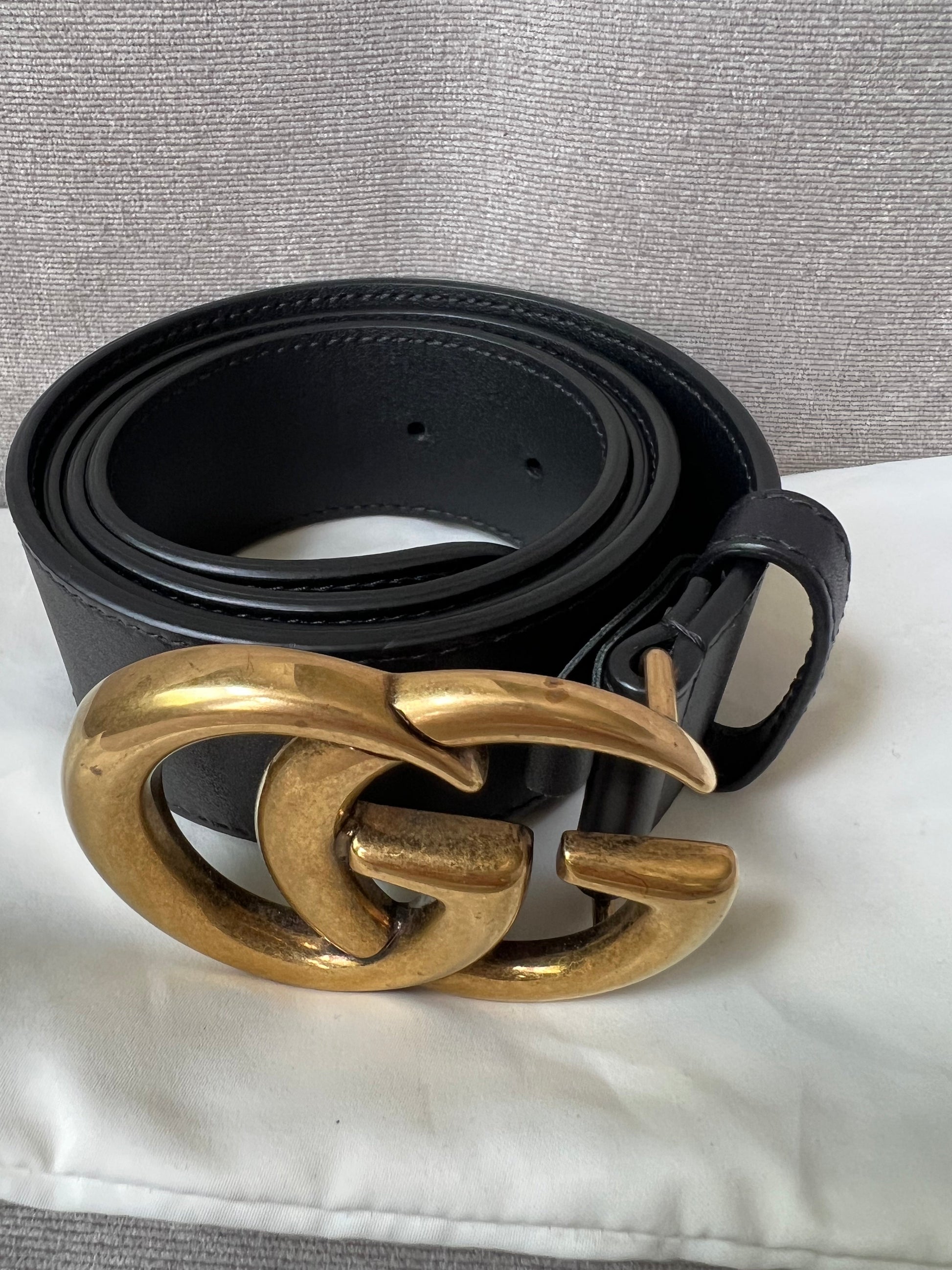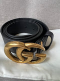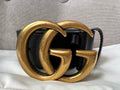 Gucci Black Marmont Re-edition Wide Leather Belt with Antique gold Buckle. Note an extra hole has been punched to enable it to be smaller.