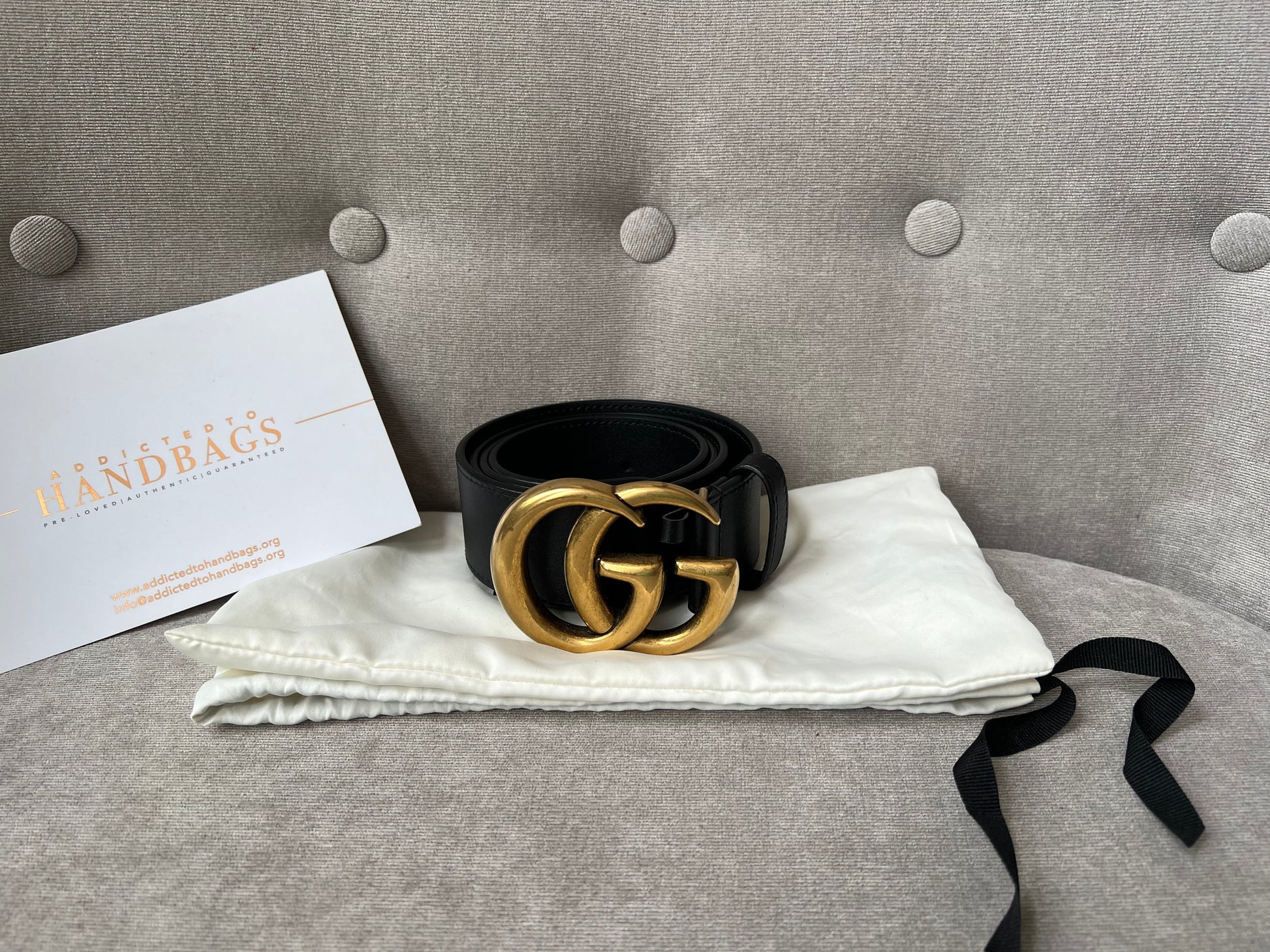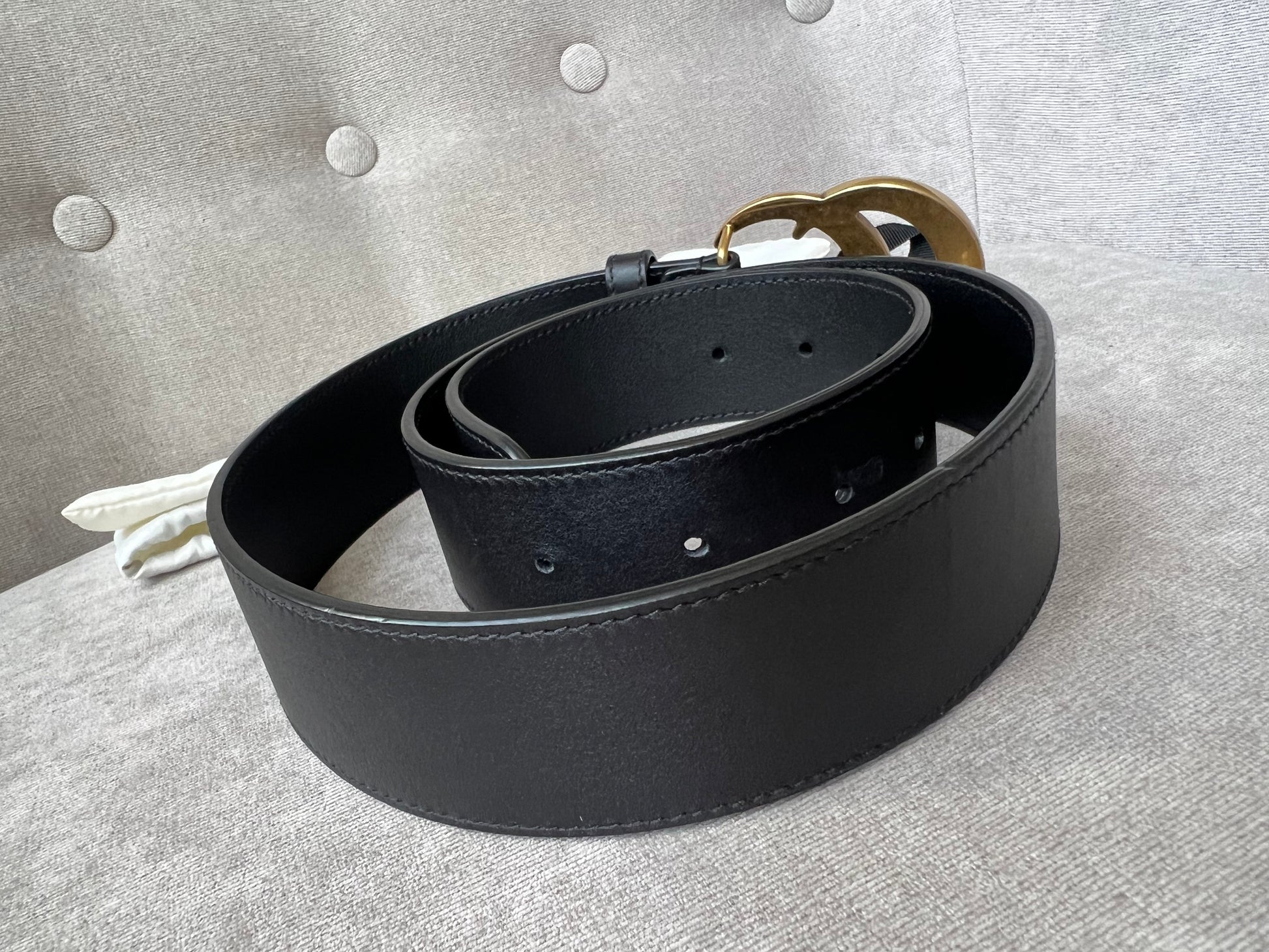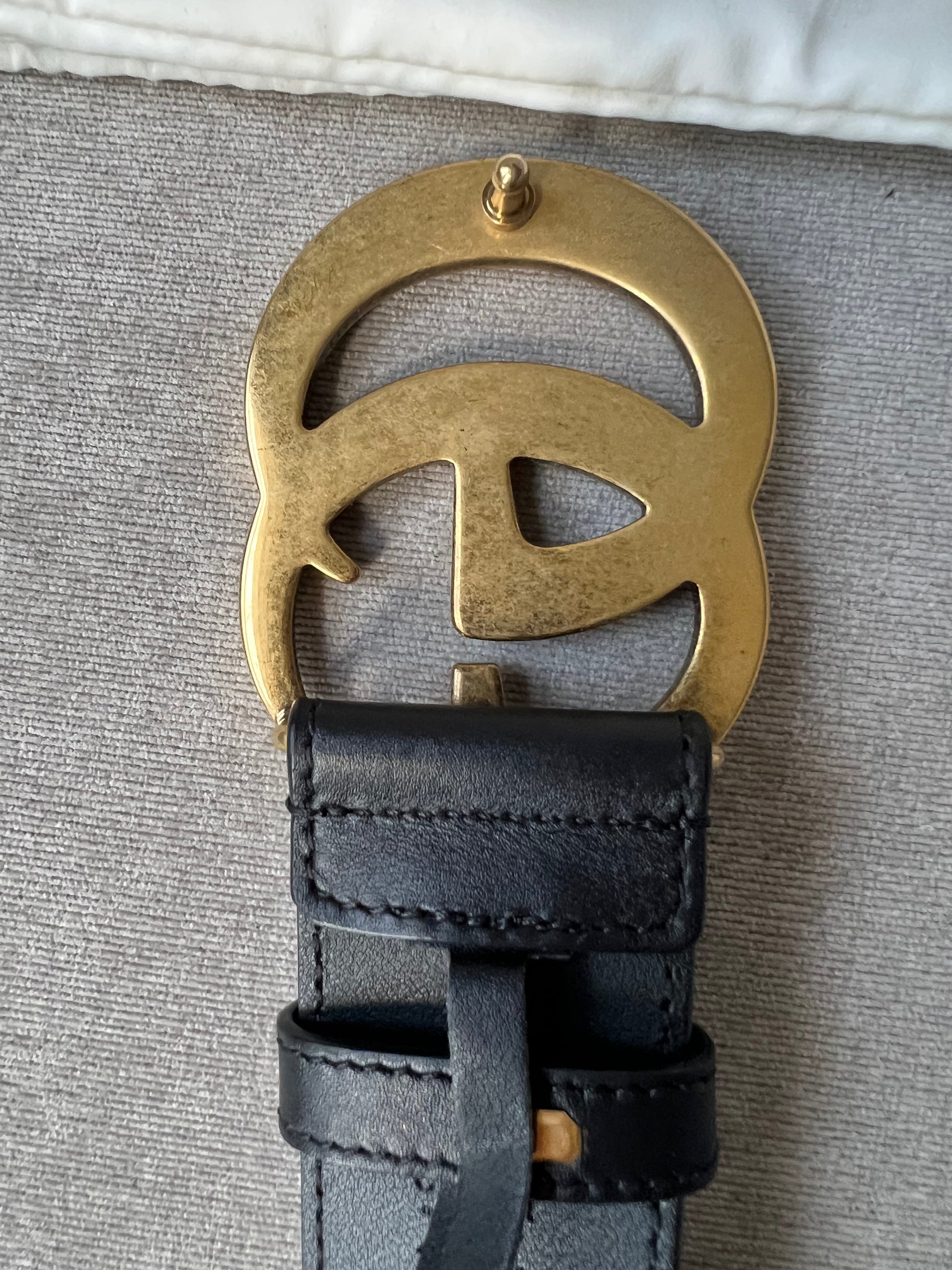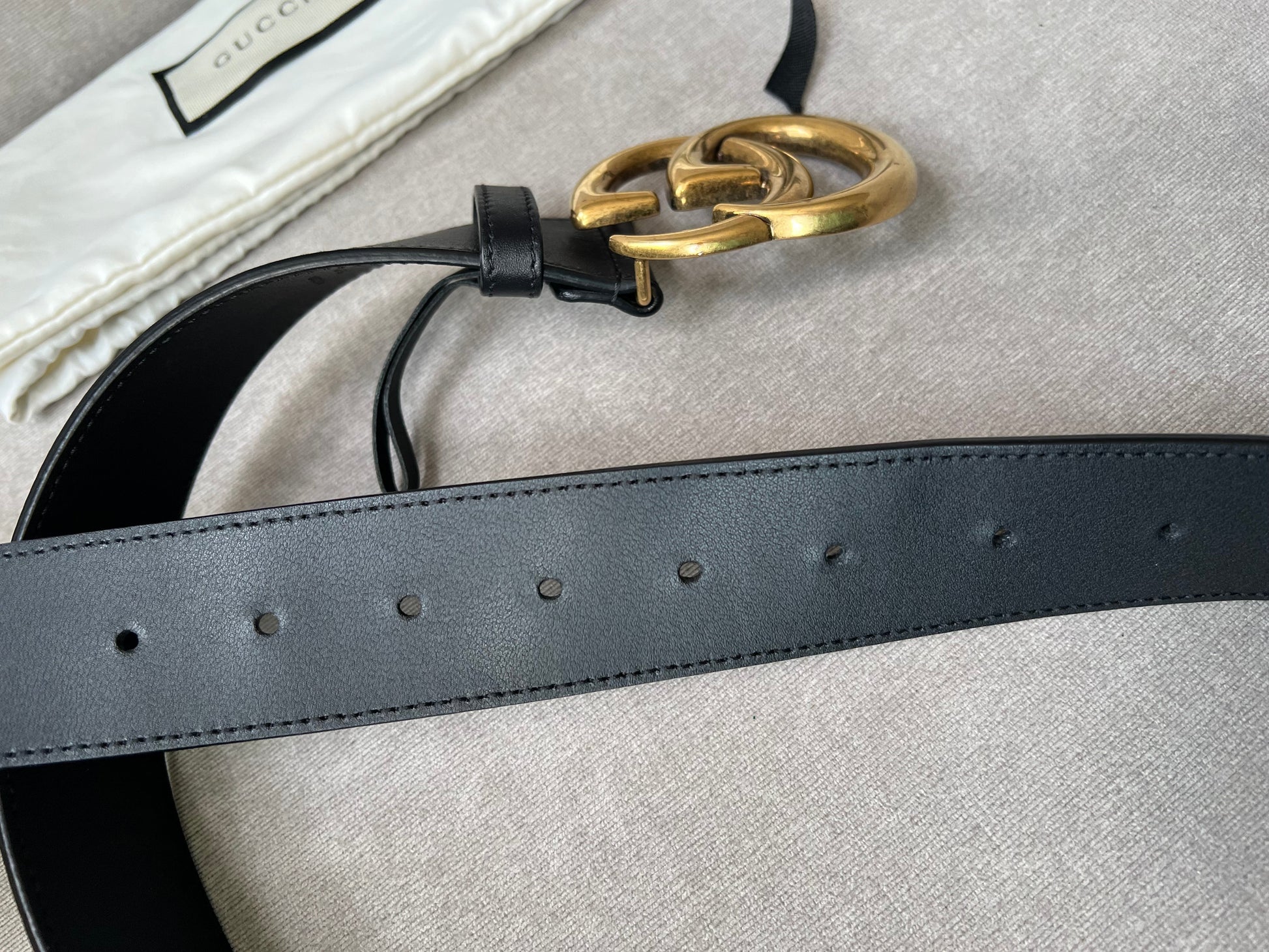Gucci Black Marmont Re-edition Wide Leather Belt with Antique gold Buckle. Note an extra hole has been punched to enable it to be smaller.