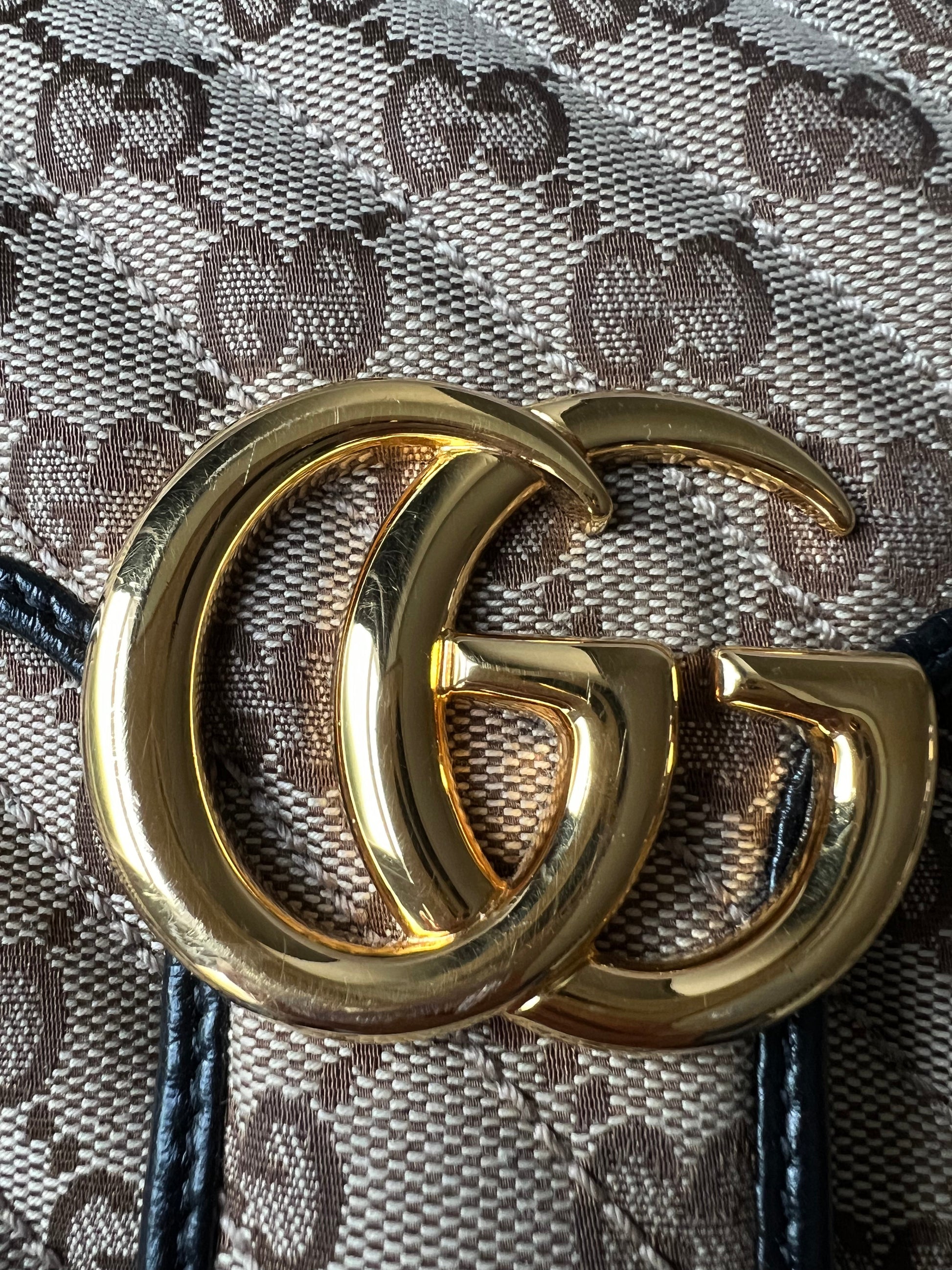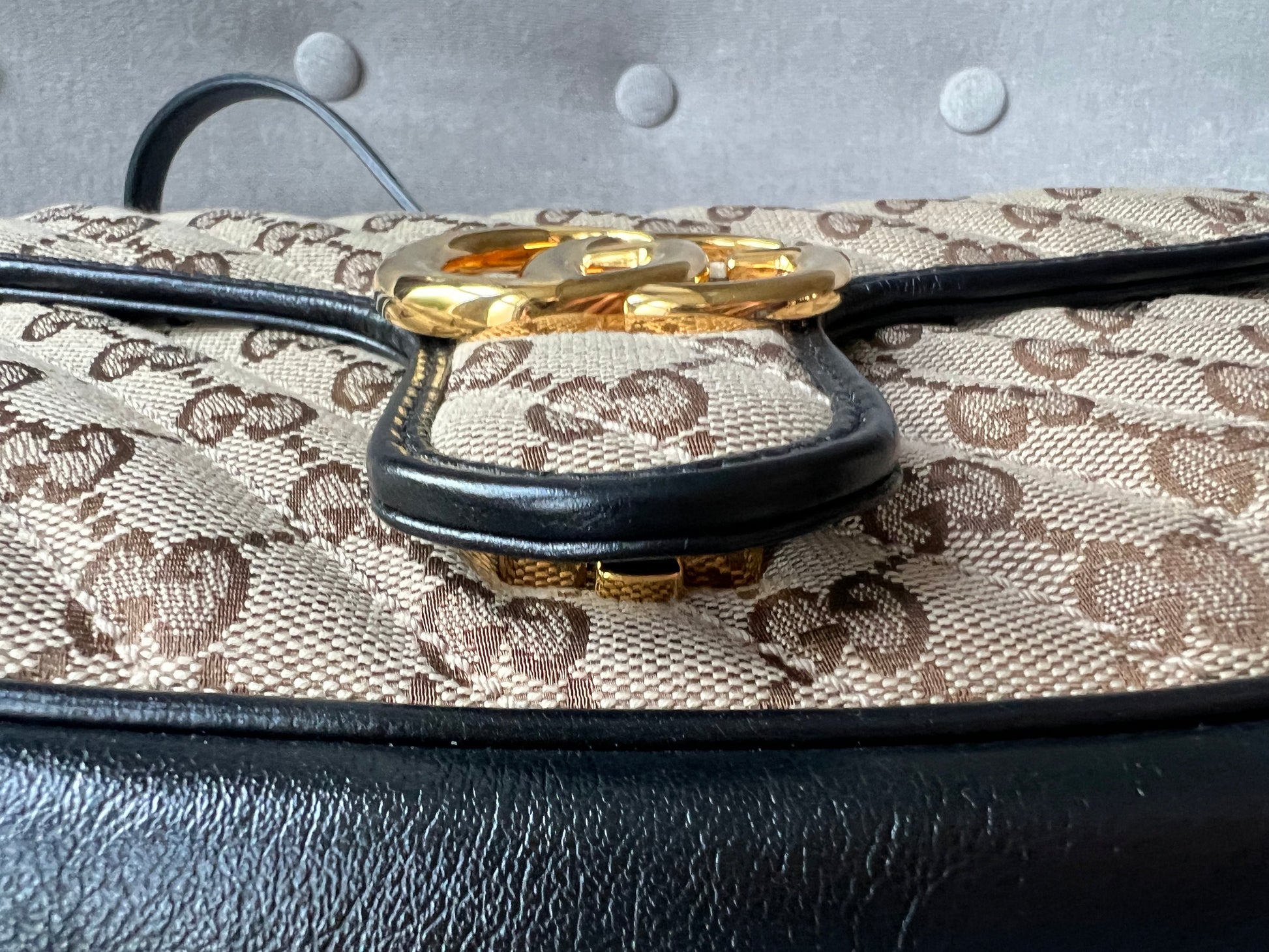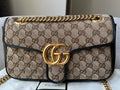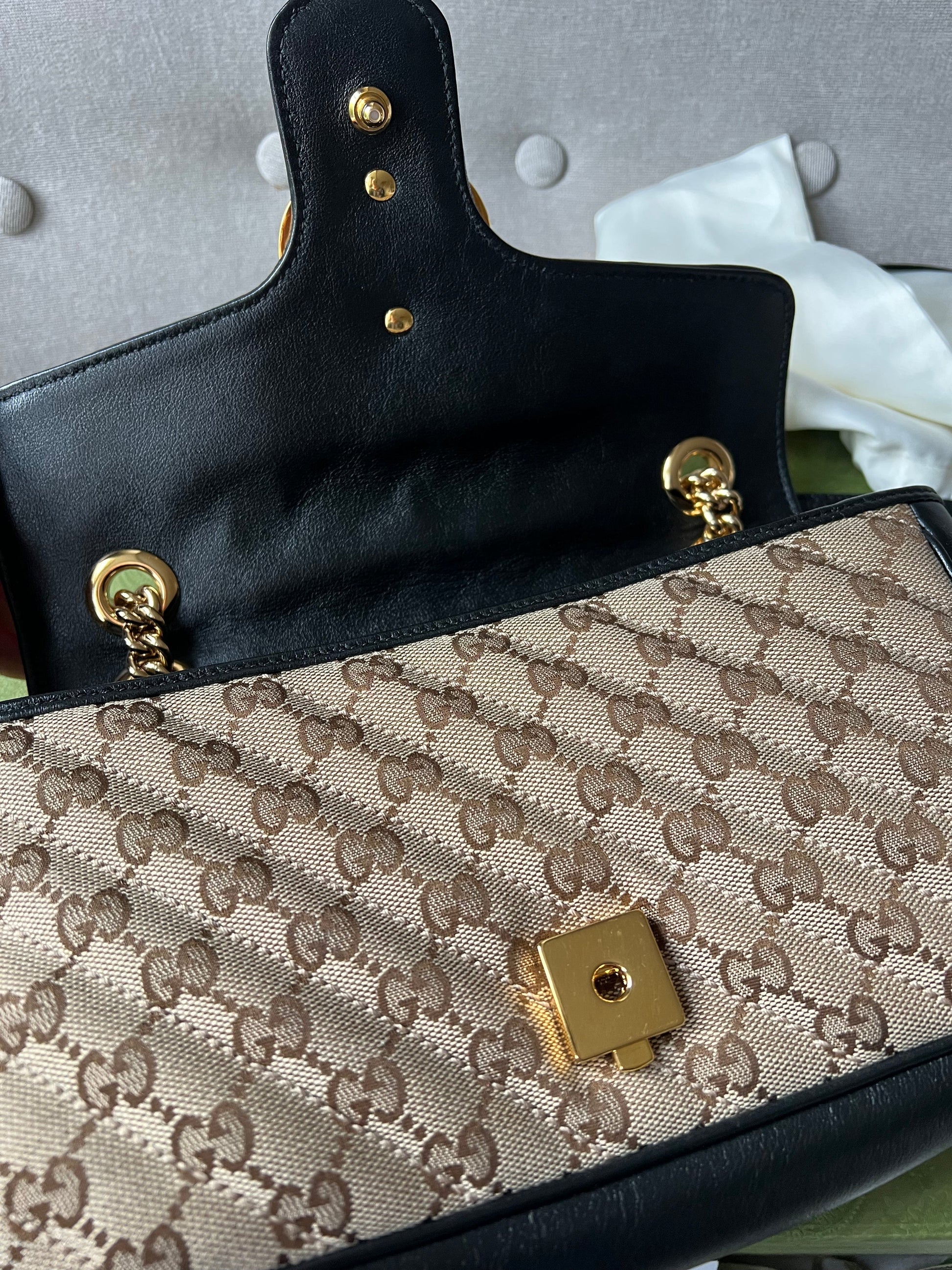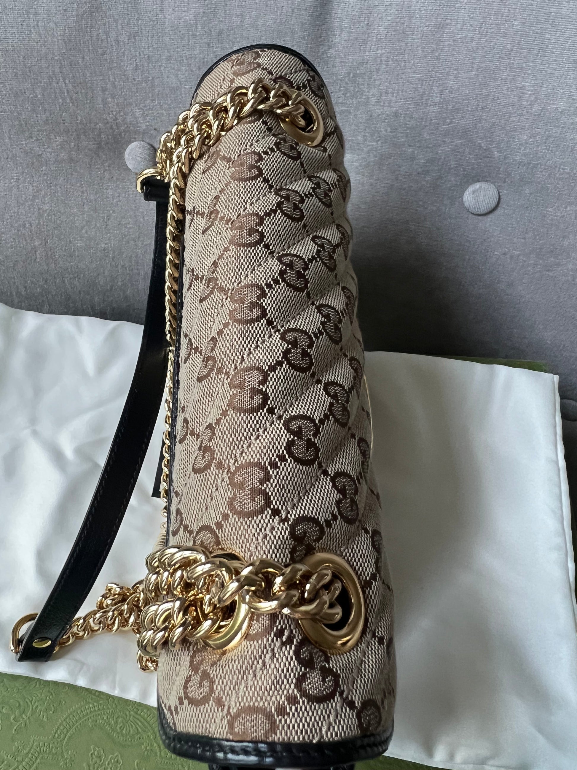 Gucci GG Marmont small shoulder bag in beige/ebony GG canvas with shiny gold hardware and black leather trim. This medium Marmont bag has a softly structured shape and an oversized flap with GG hardware. The sliding chain can be multiple ways either doubled up or lengthened. Effortlessly chic and sophisticated, this style can be both with a casual outfit or for evening wear. Suitable for both day to day or occasion wear and ideal for those who prefer a cross body option.