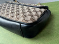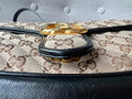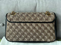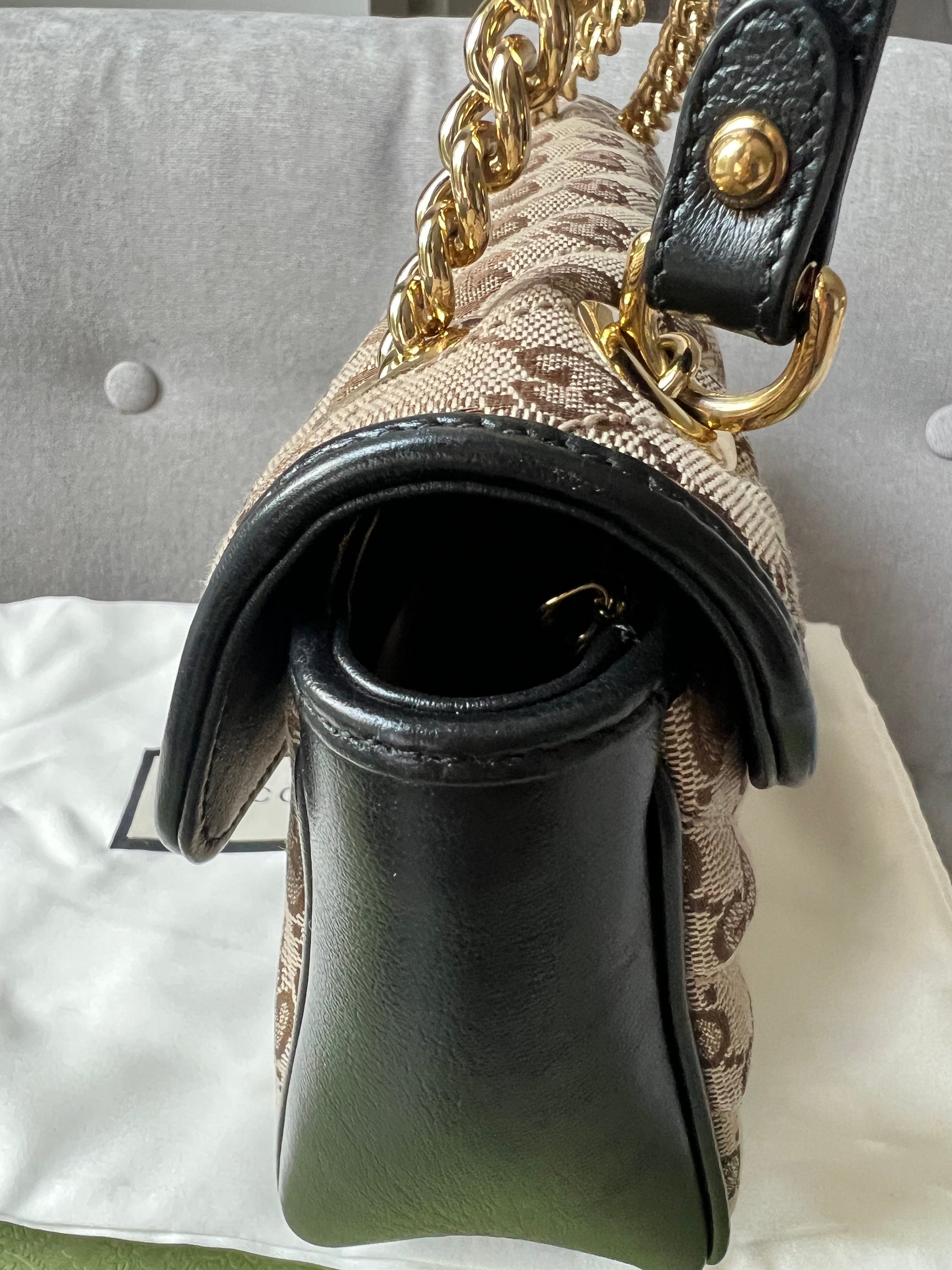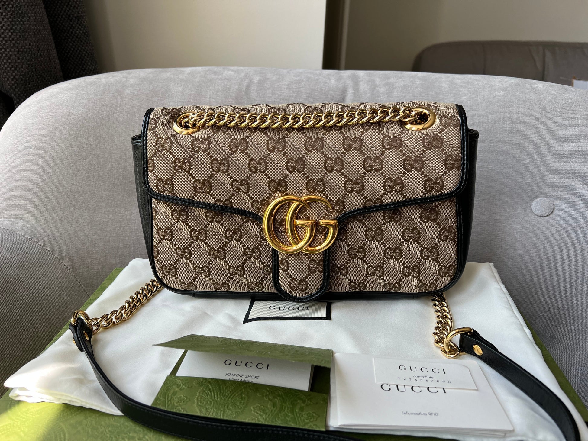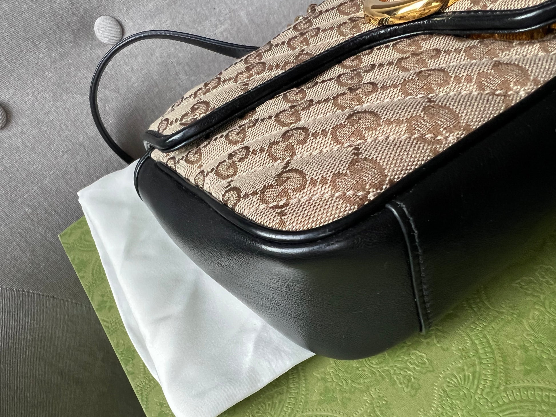 Gucci GG Marmont small shoulder bag in beige/ebony GG canvas with shiny gold hardware and black leather trim. This medium Marmont bag has a softly structured shape and an oversized flap with GG hardware. The sliding chain can be multiple ways either doubled up or lengthened. Effortlessly chic and sophisticated, this style can be both with a casual outfit or for evening wear. Suitable for both day to day or occasion wear and ideal for those who prefer a cross body option.