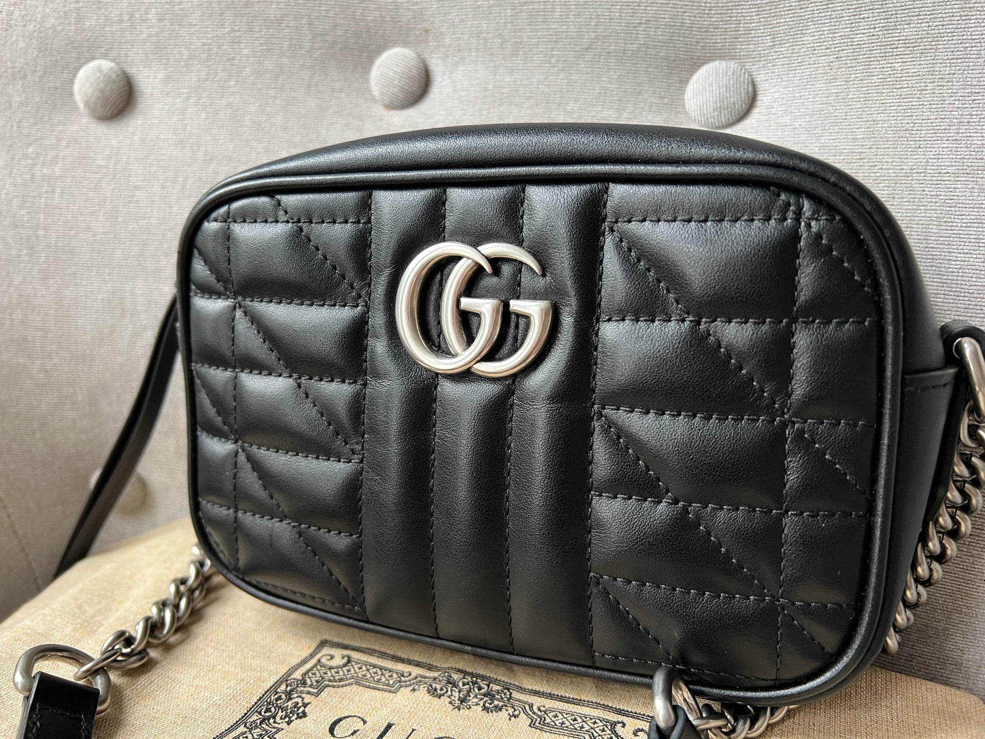 Gucci GG Marmont mini shoulder bag in black chevron matelassé leather with gold hardware. For the Gucci Aria collection, the small marmont style is reimagined with a new geometric approach to the signature material. This mini Marmont chain camera style bag has a softly structured shape, zip top closure and GG detail on the back. Effortlessly chic and sophisticated, this style can be both with a casual outfit or for evening wear. Suitable for both day to day or occasion wear and ideal for those who prefer a cross body option.