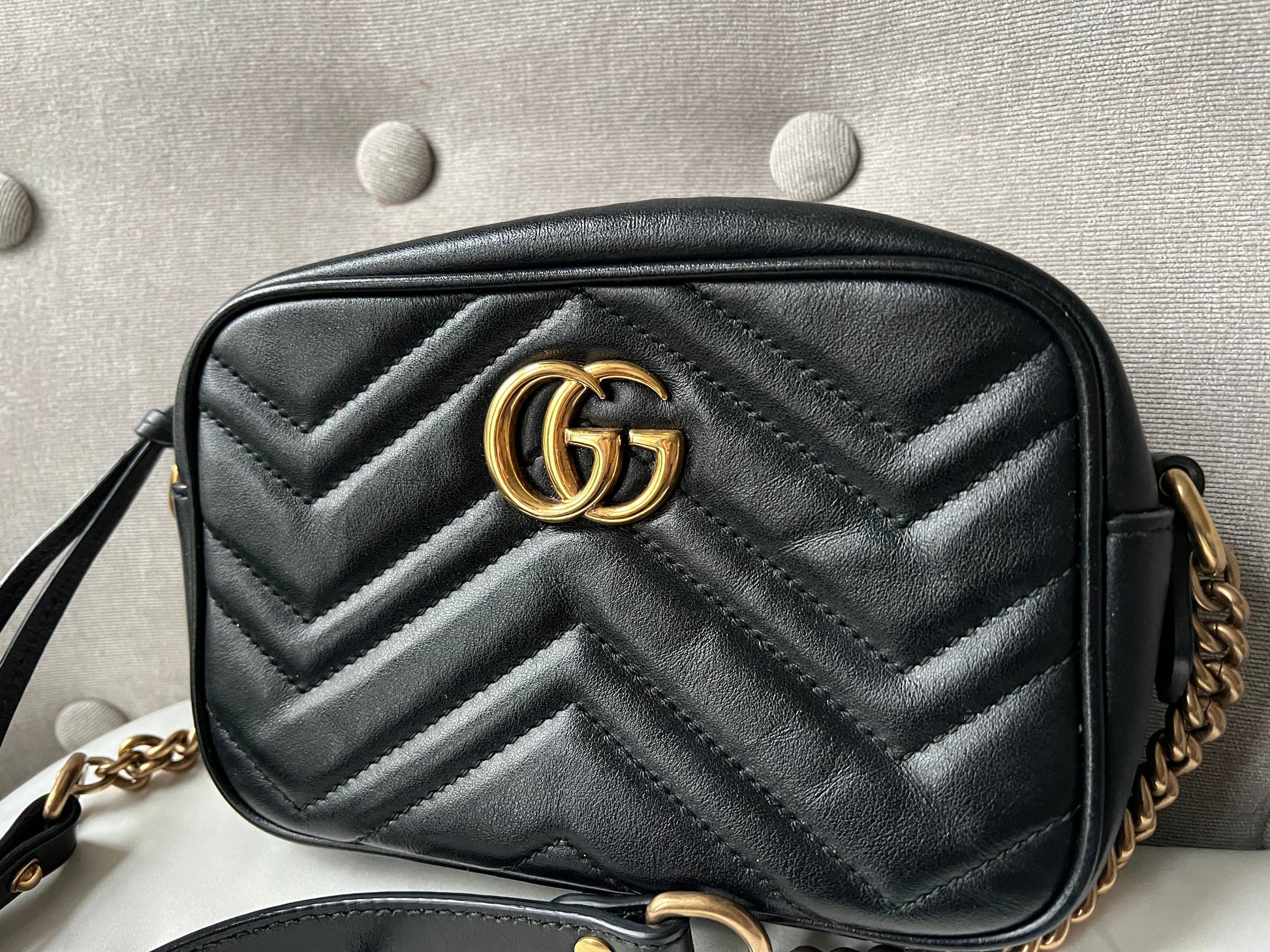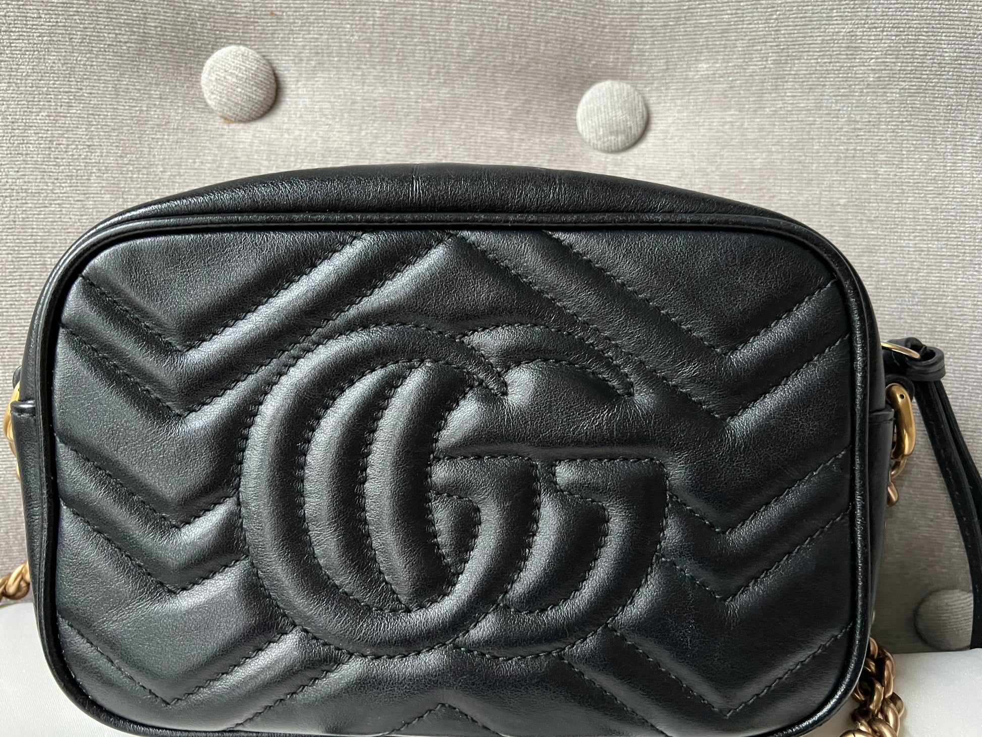 Gucci GG Marmont mini shoulder bag in black chevron matelassé leather with gold hardware. This mini Marmont chain camera style bag has a softly structured shape, zip top closure and GG detail on the back. Effortlessly chic and sophisticated, this style can be both with a casual outfit or for evening wear. Suitable for both day to day or occasion wear and ideal for those who prefer a cross body option.
