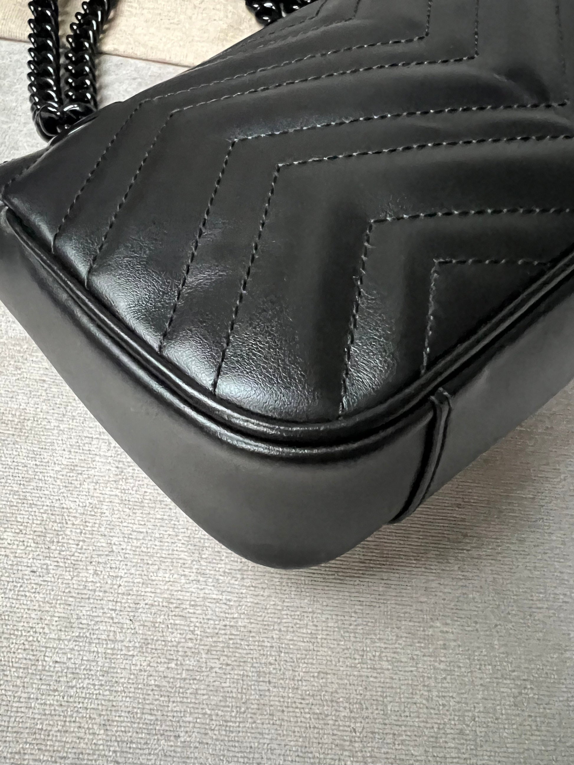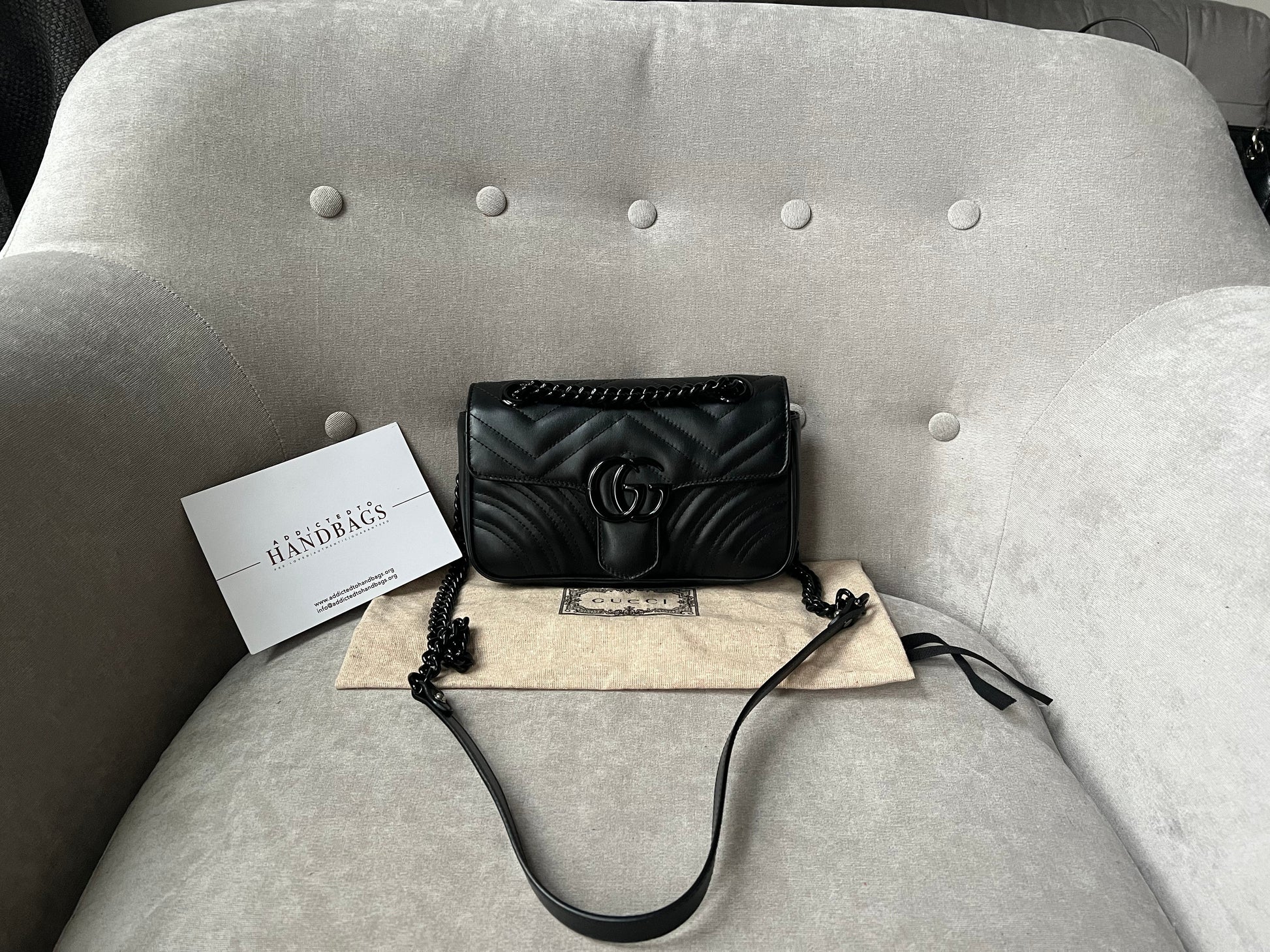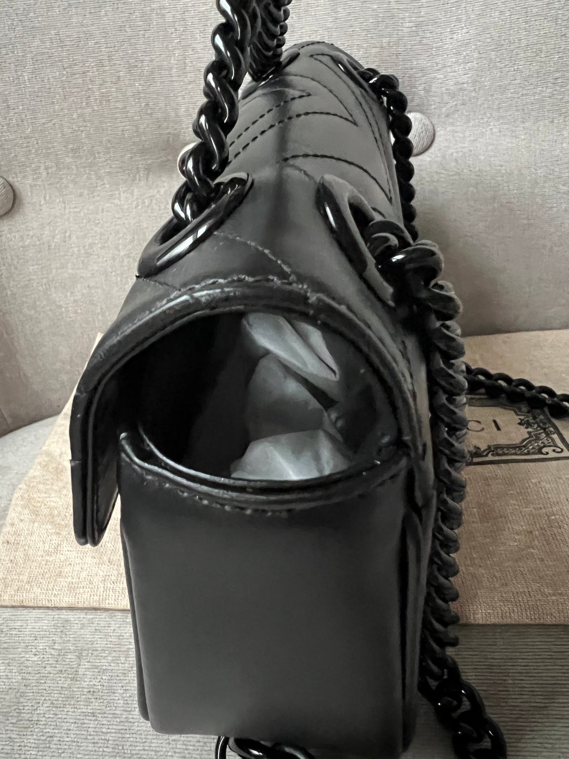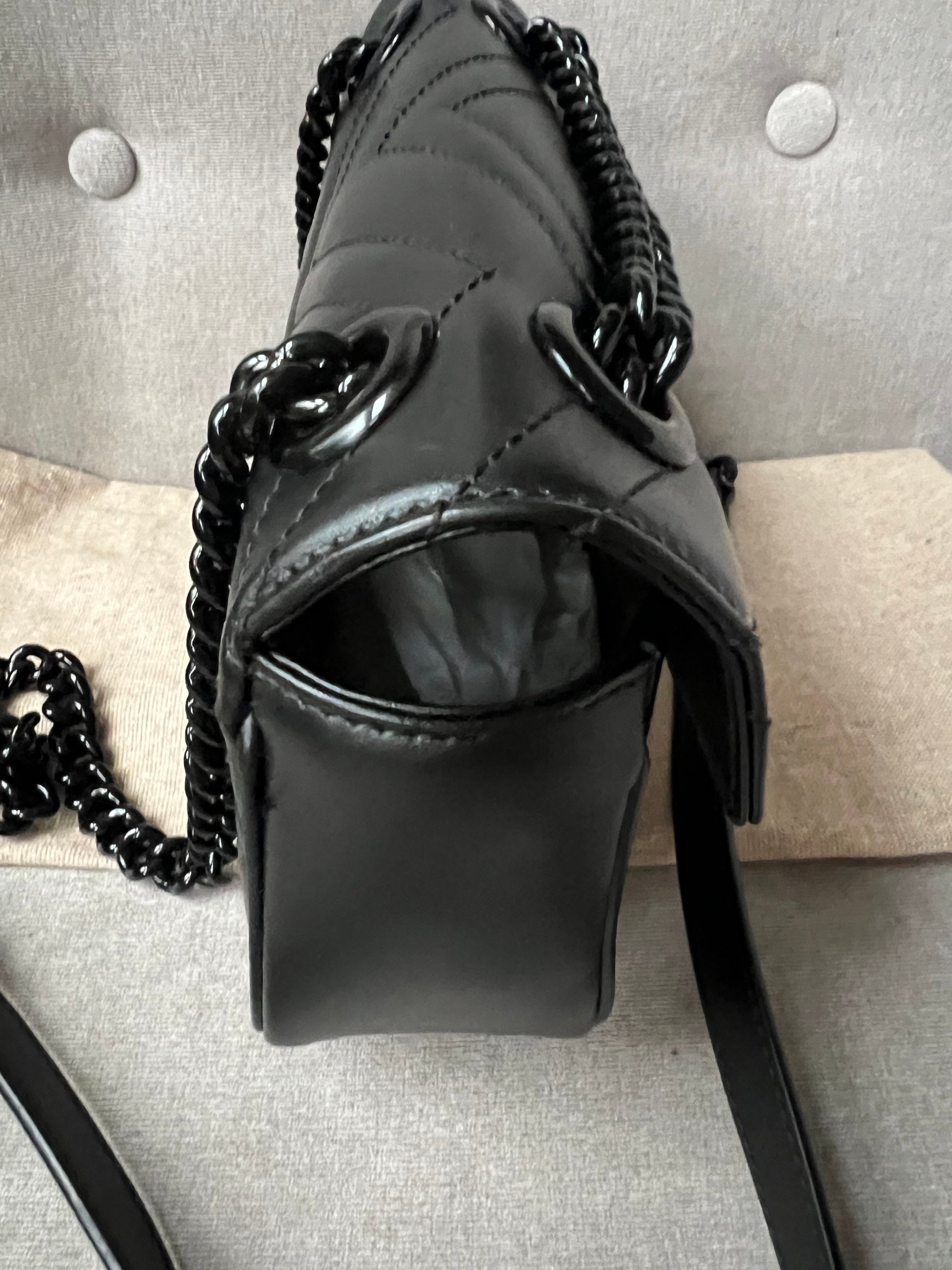 Gucci GG Marmont mini shoulder bag in black matelasse chevron leather with black coated hardware. This mini Marmont bag has a softly structured shape and an oversized flap with GG hardware and heart detail on the back. The sliding chain can be multiple ways either doubled up or lengthened. Effortlessly chic and sophisticated, this style can be both with a casual outfit or for evening wear. Suitable for both day to day or occasion wear and ideal for those who prefer a cross body option. The highly sought after “black on black” does not come up often.