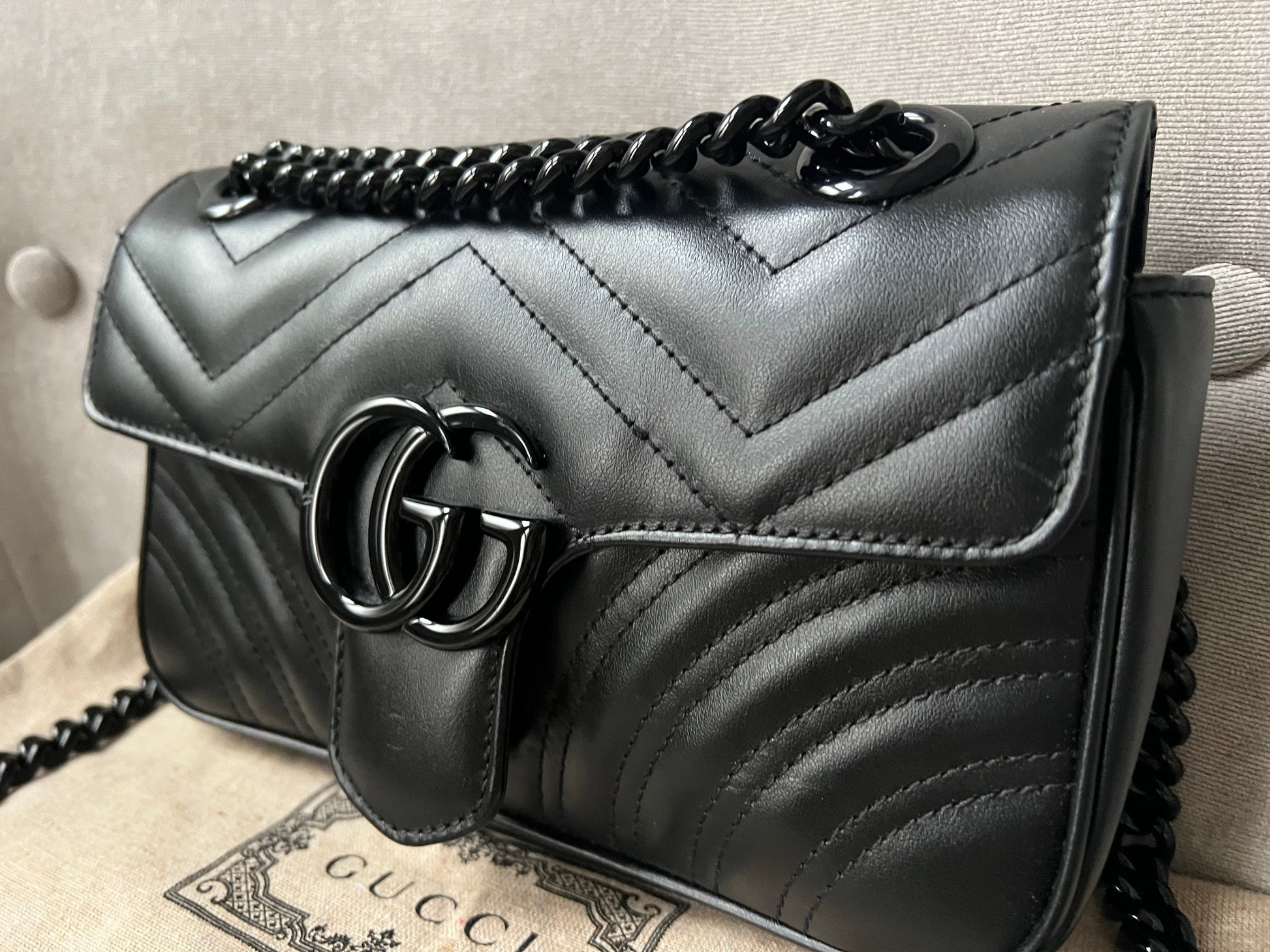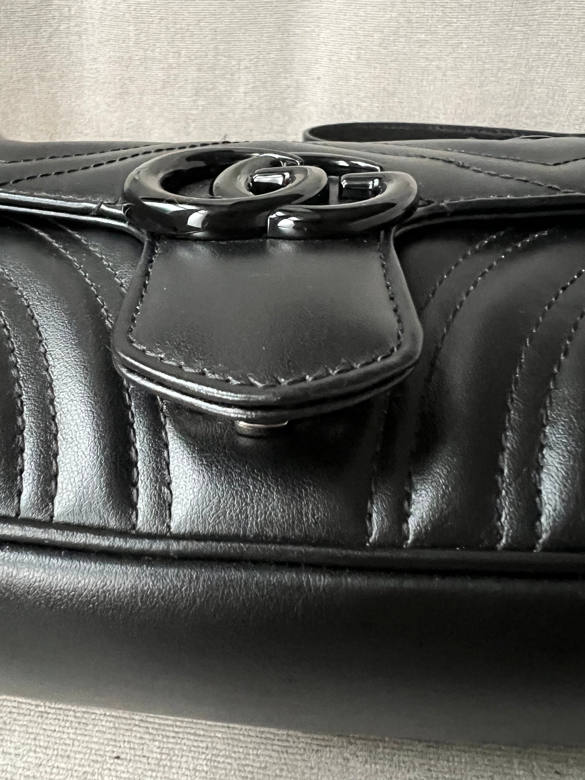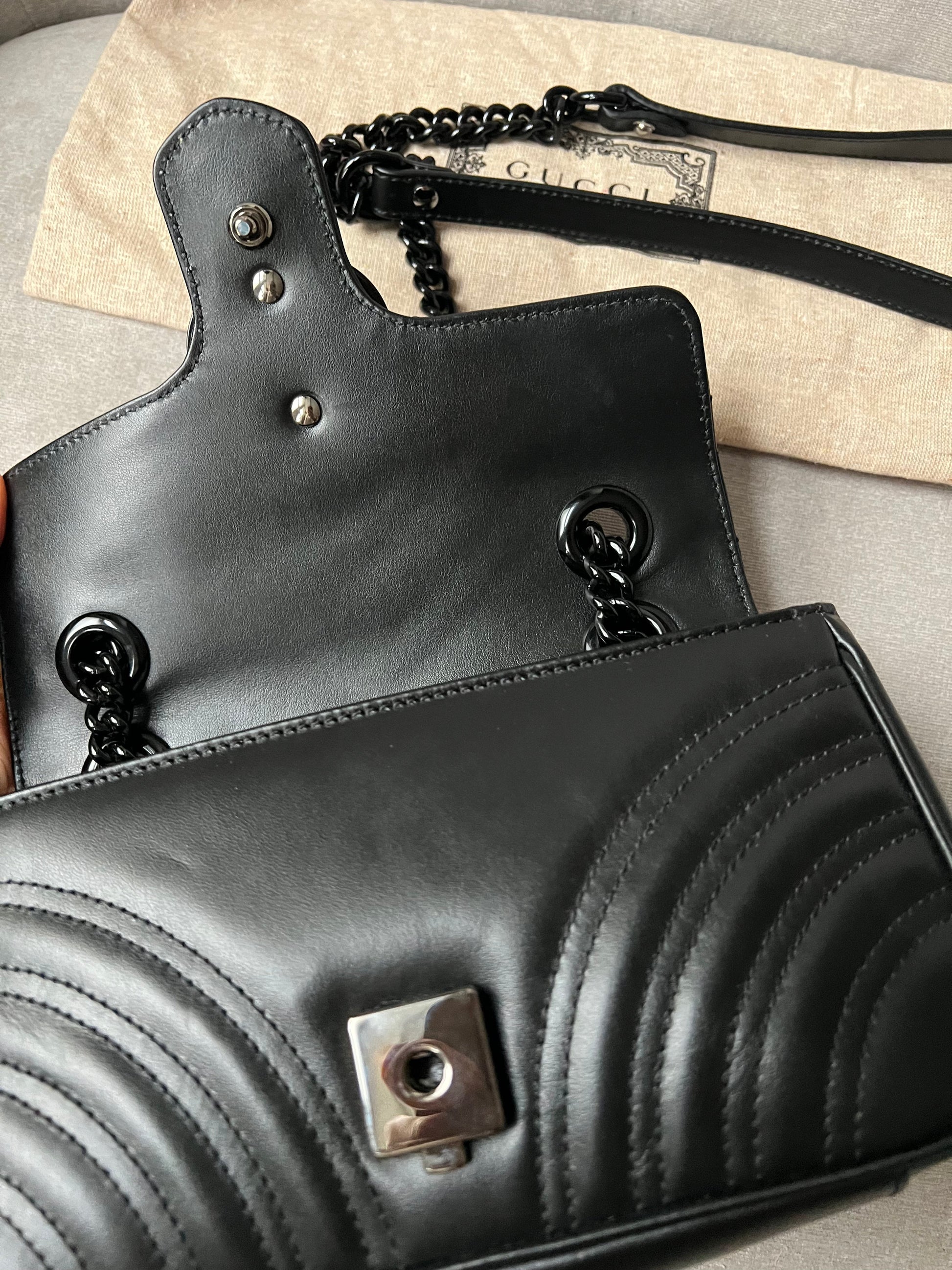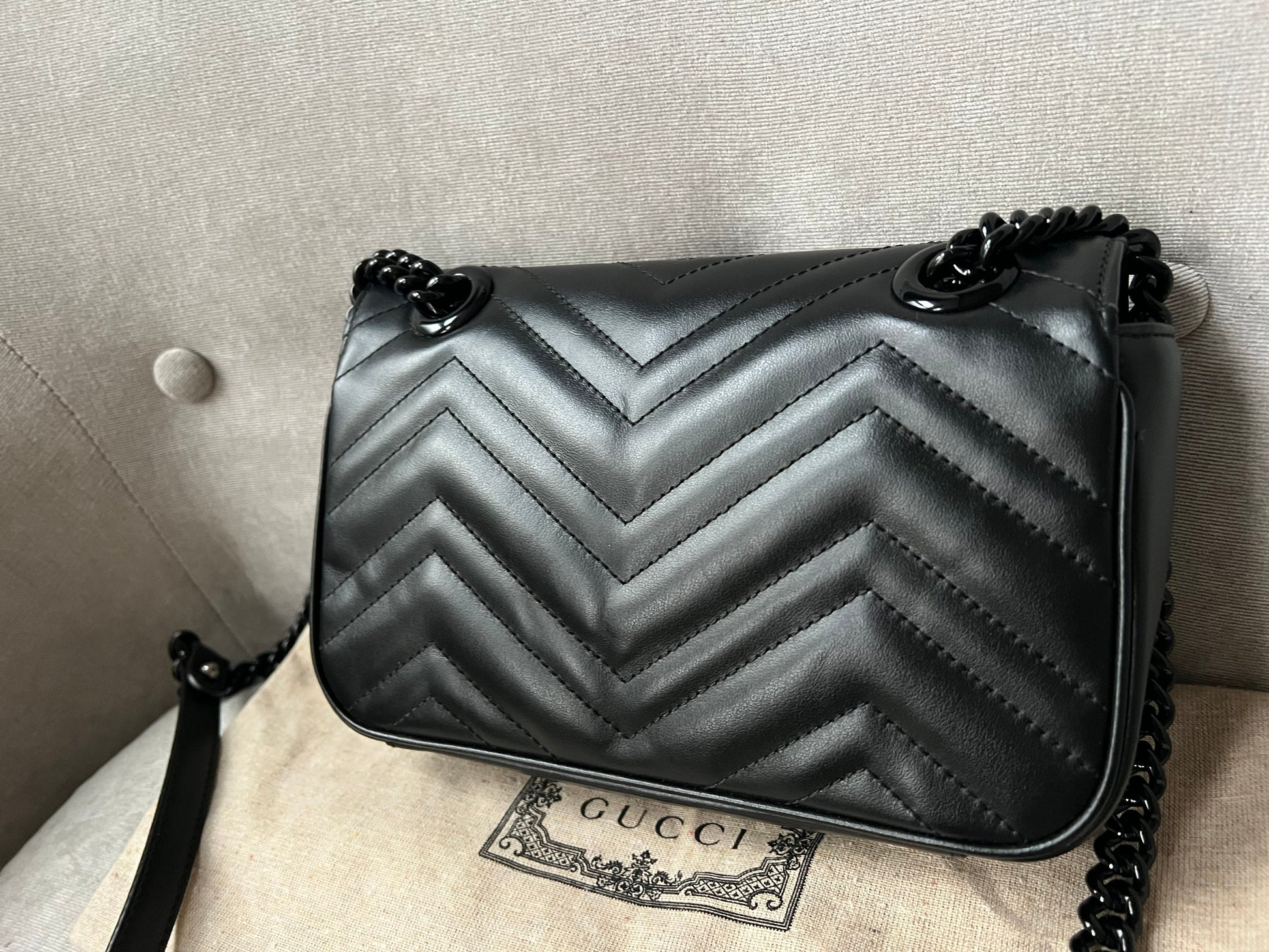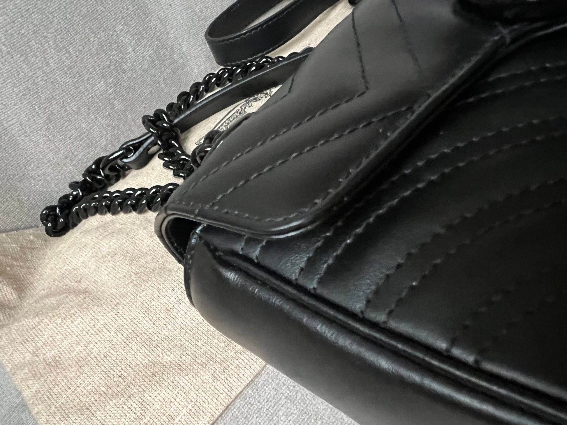 Gucci GG Marmont mini shoulder bag in black matelasse chevron leather with black coated hardware. This mini Marmont bag has a softly structured shape and an oversized flap with GG hardware and heart detail on the back. The sliding chain can be multiple ways either doubled up or lengthened. Effortlessly chic and sophisticated, this style can be both with a casual outfit or for evening wear. Suitable for both day to day or occasion wear and ideal for those who prefer a cross body option. The highly sought after “black on black” does not come up often.