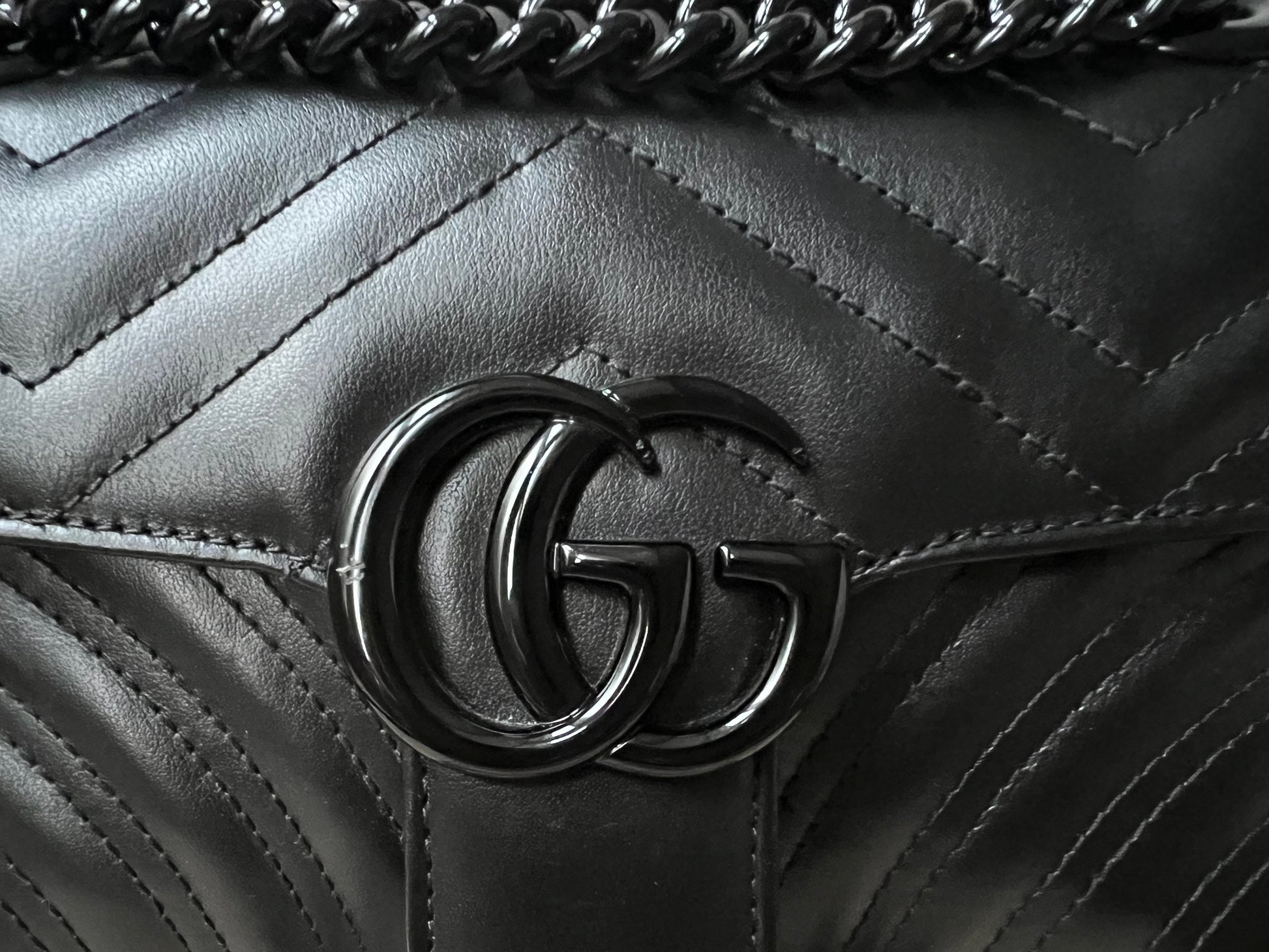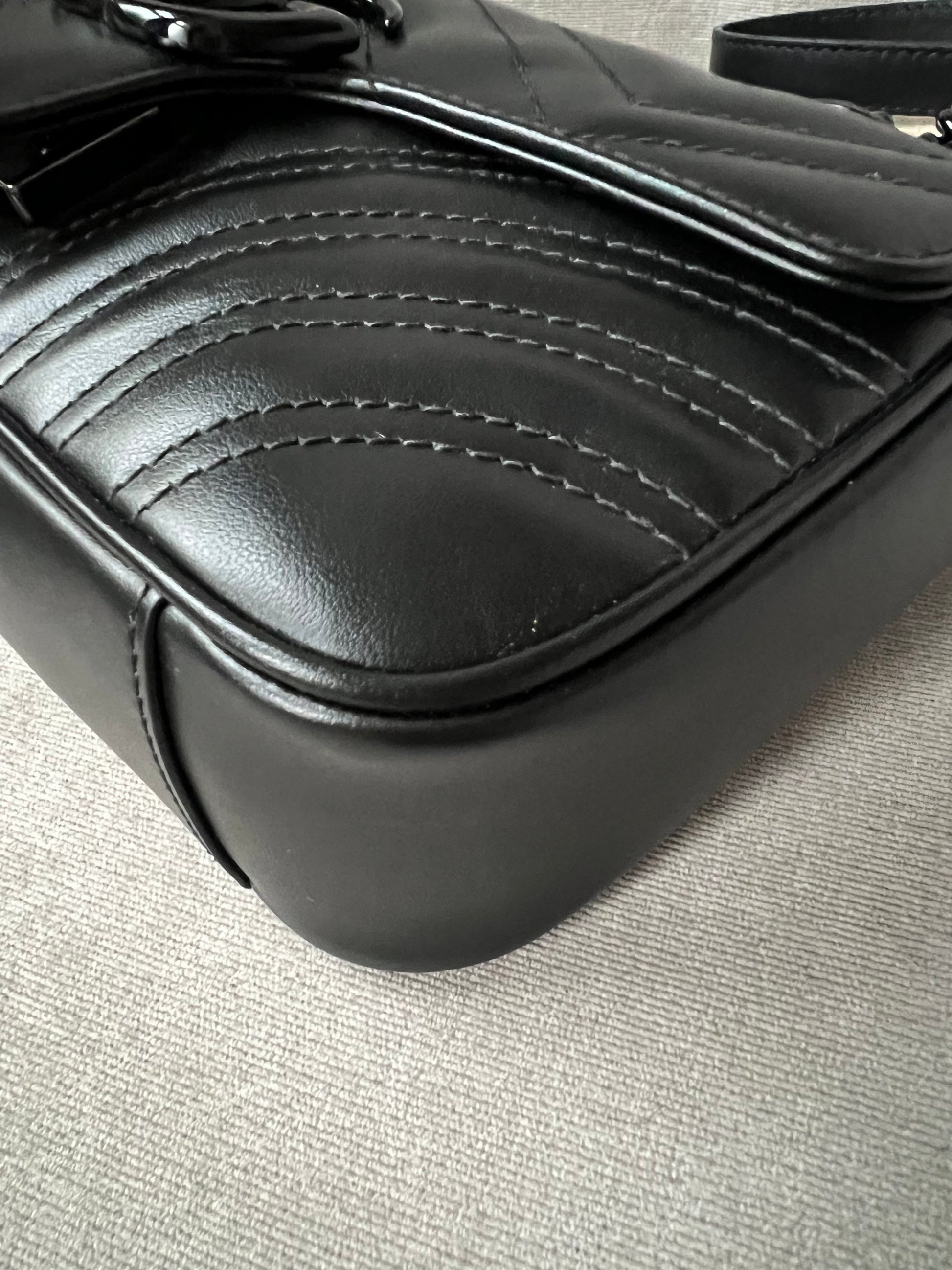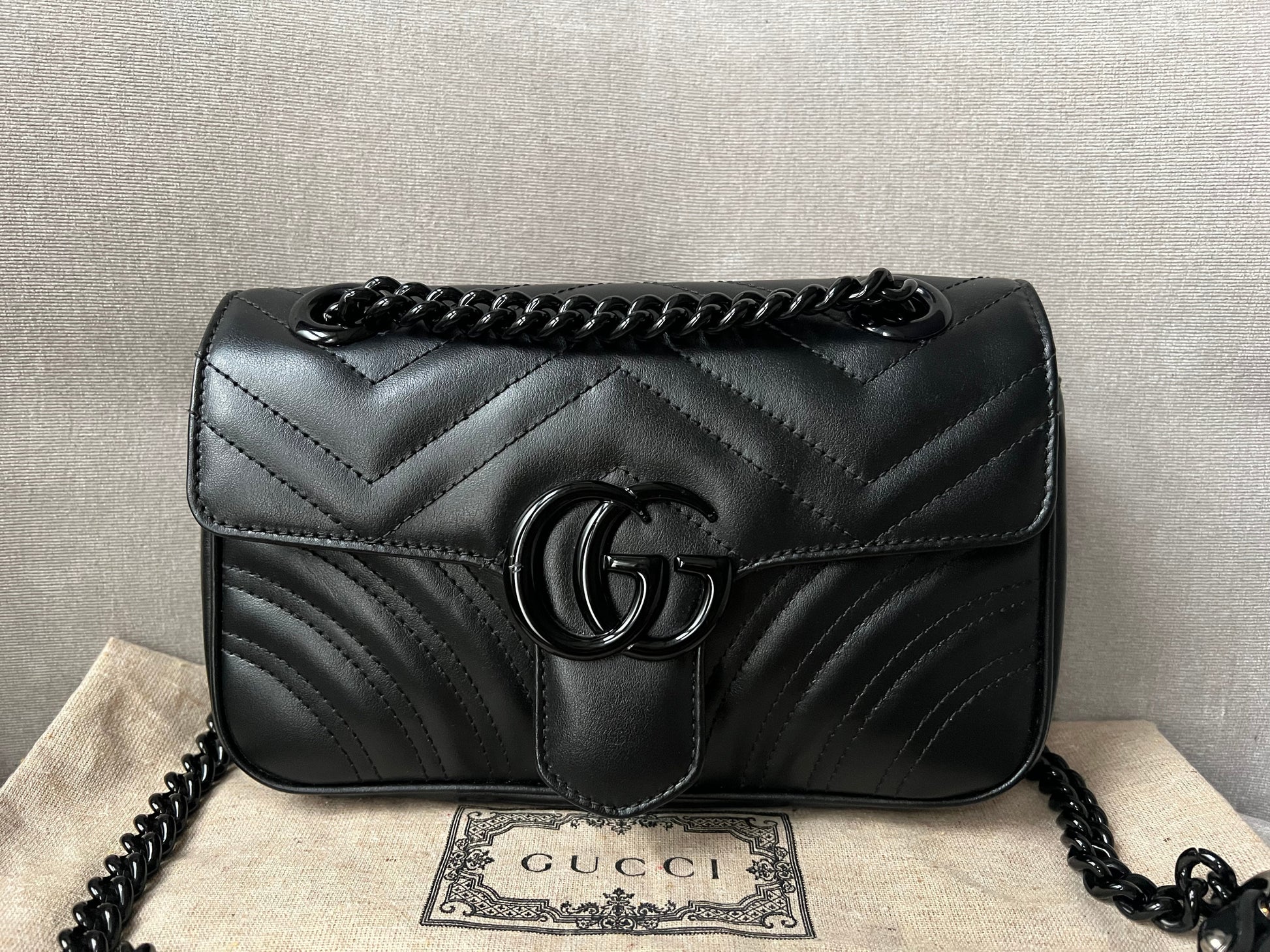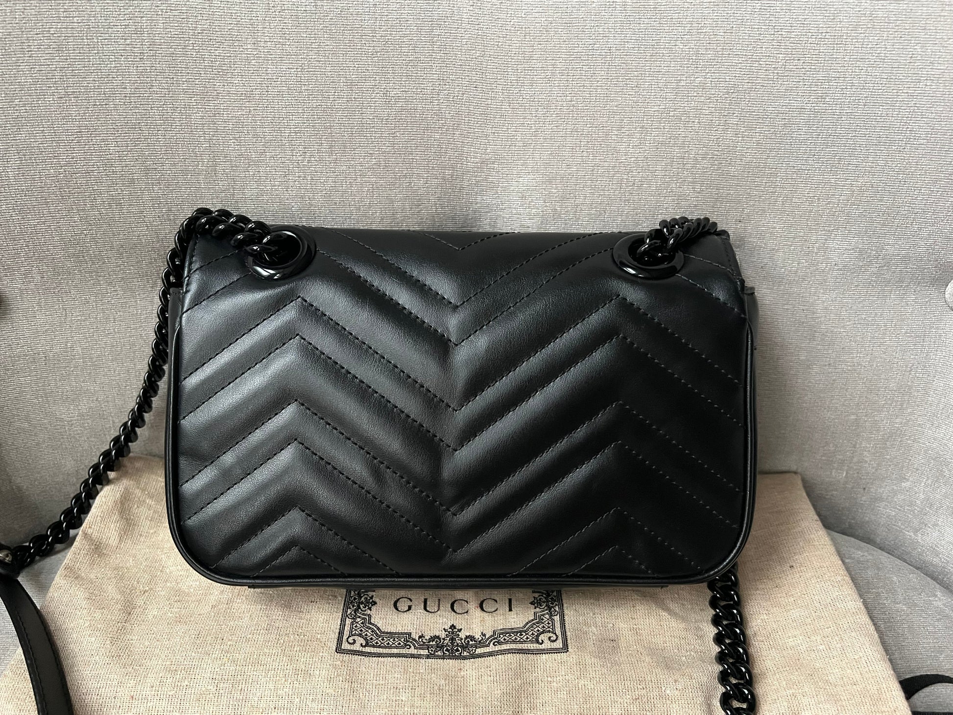 Gucci GG Marmont mini shoulder bag in black matelasse chevron leather with black coated hardware. This mini Marmont bag has a softly structured shape and an oversized flap with GG hardware and heart detail on the back. The sliding chain can be multiple ways either doubled up or lengthened. Effortlessly chic and sophisticated, this style can be both with a casual outfit or for evening wear. Suitable for both day to day or occasion wear and ideal for those who prefer a cross body option. The highly sought after “black on black” does not come up often.