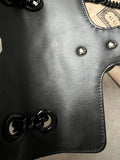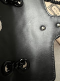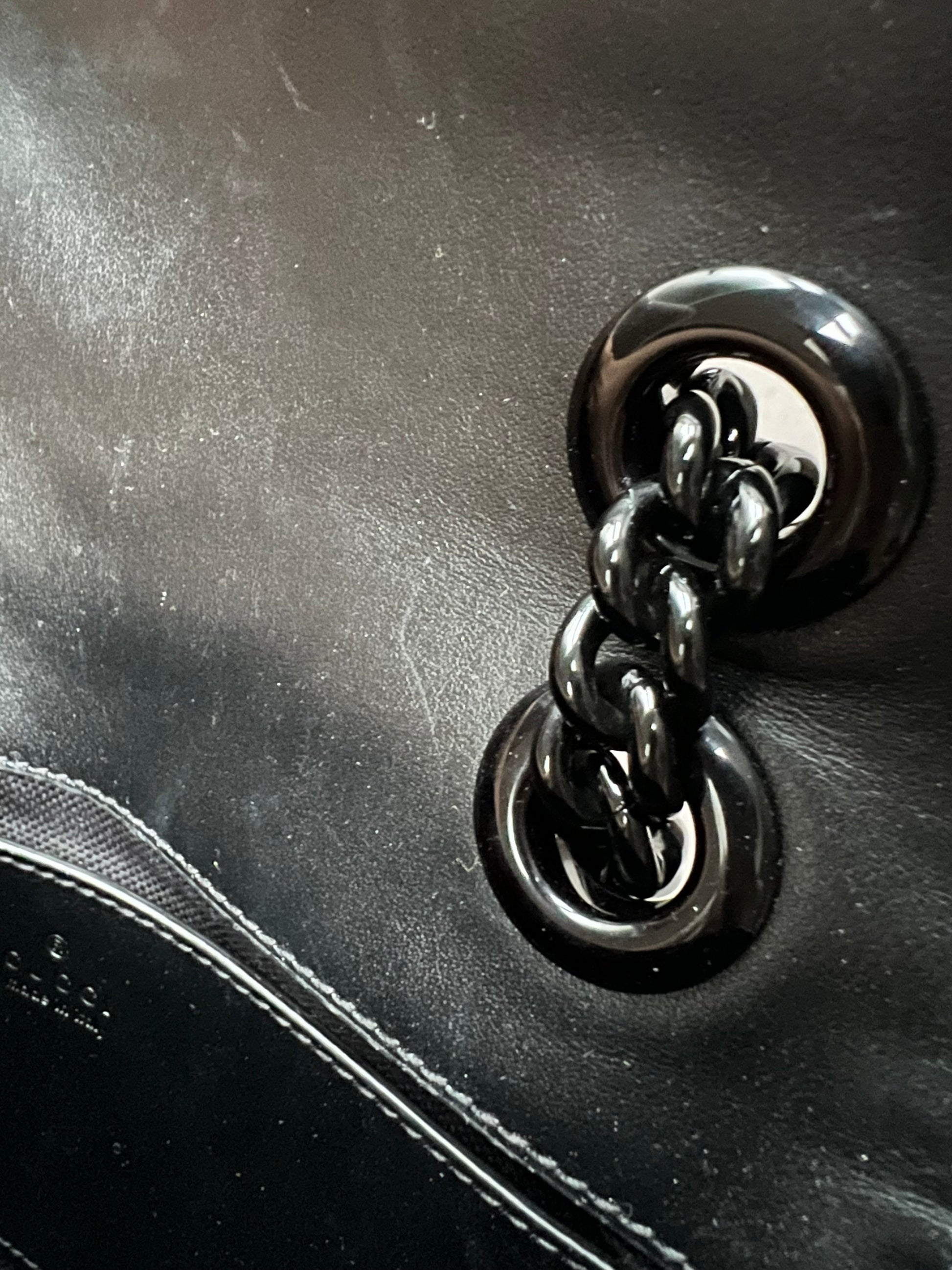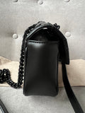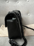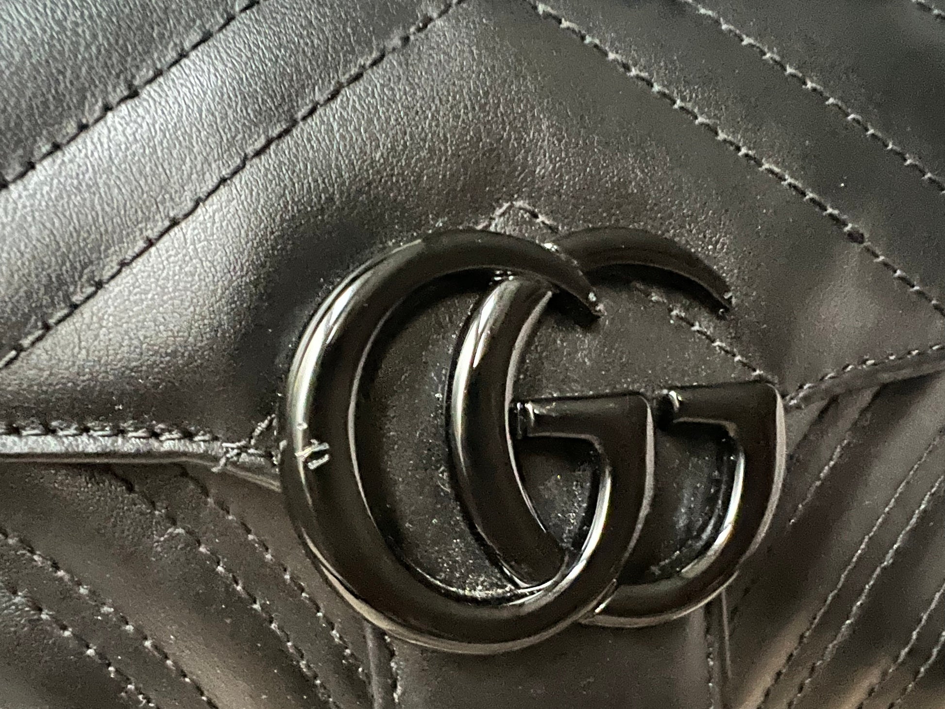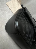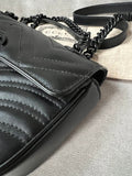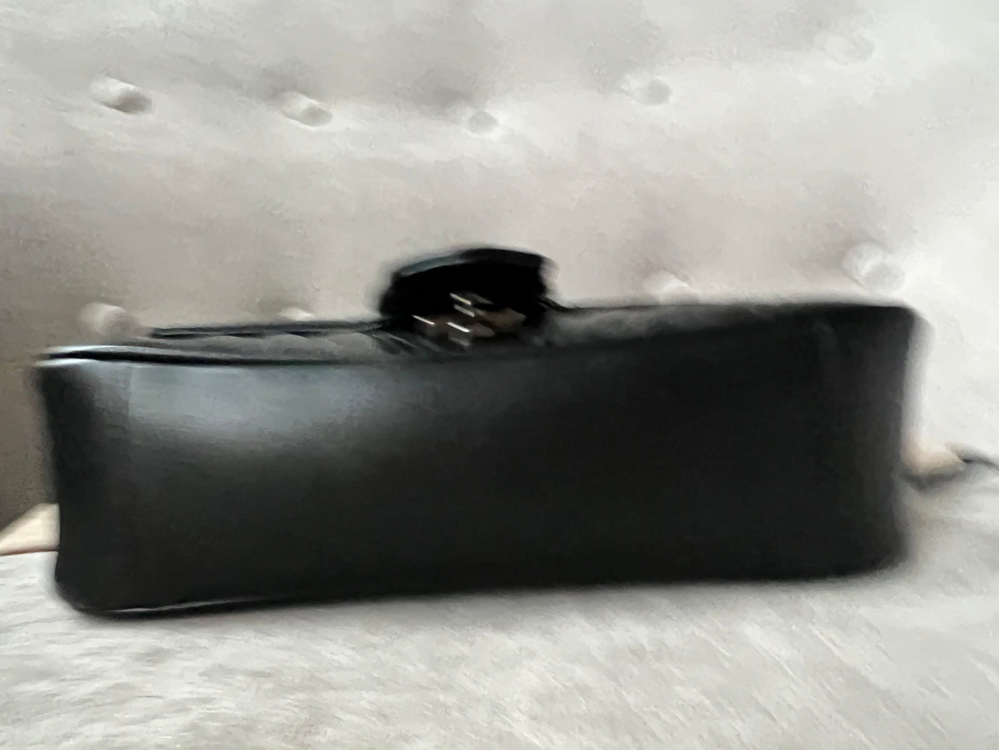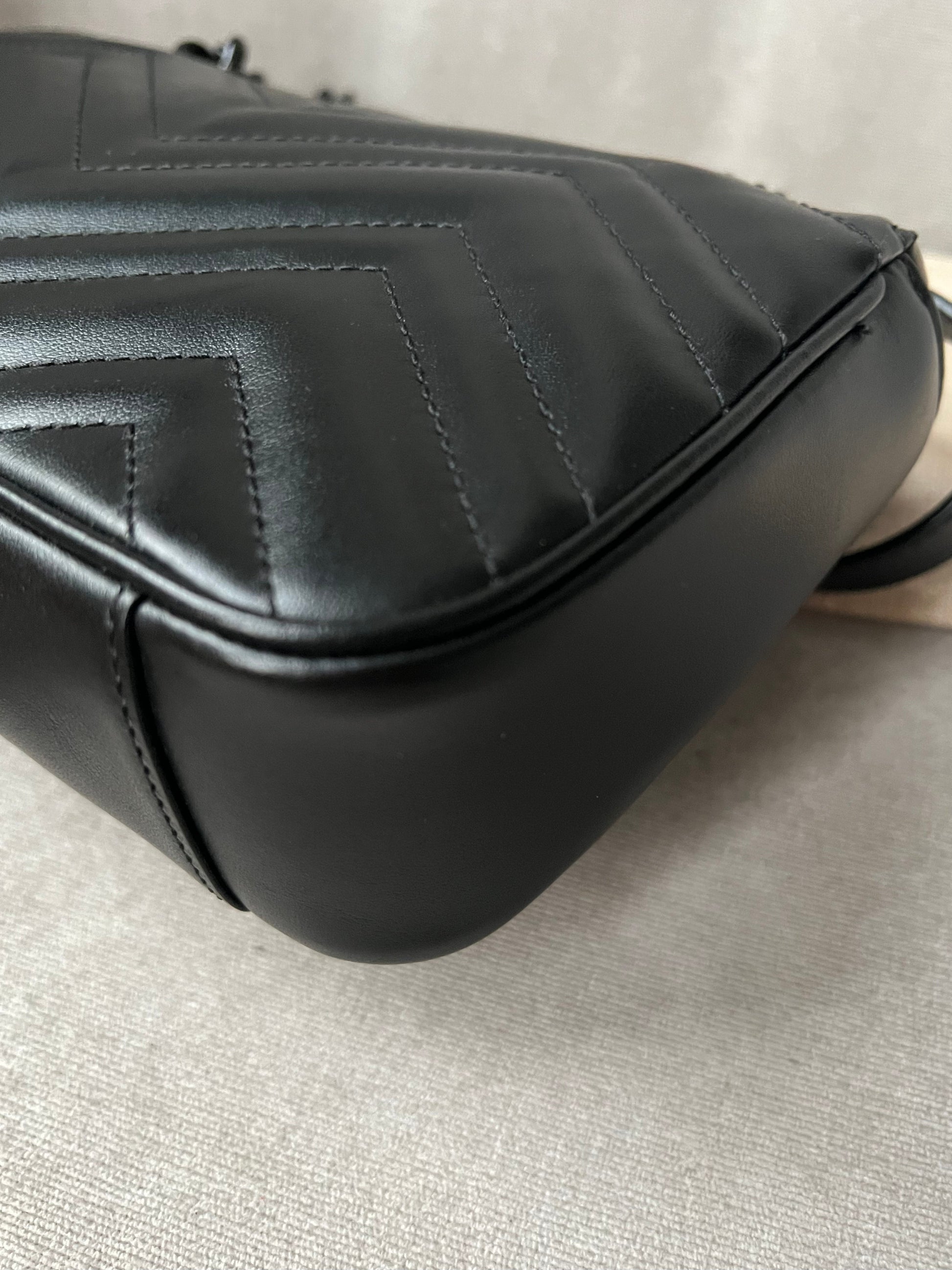Gucci GG Marmont mini shoulder bag in black matelasse chevron leather with black coated hardware. This mini Marmont bag has a softly structured shape and an oversized flap with GG hardware and heart detail on the back. The sliding chain can be multiple ways either doubled up or lengthened. Effortlessly chic and sophisticated, this style can be both with a casual outfit or for evening wear. Suitable for both day to day or occasion wear and ideal for those who prefer a cross body option. The highly sought after “black on black” does not come up often.