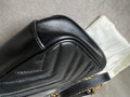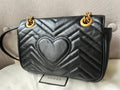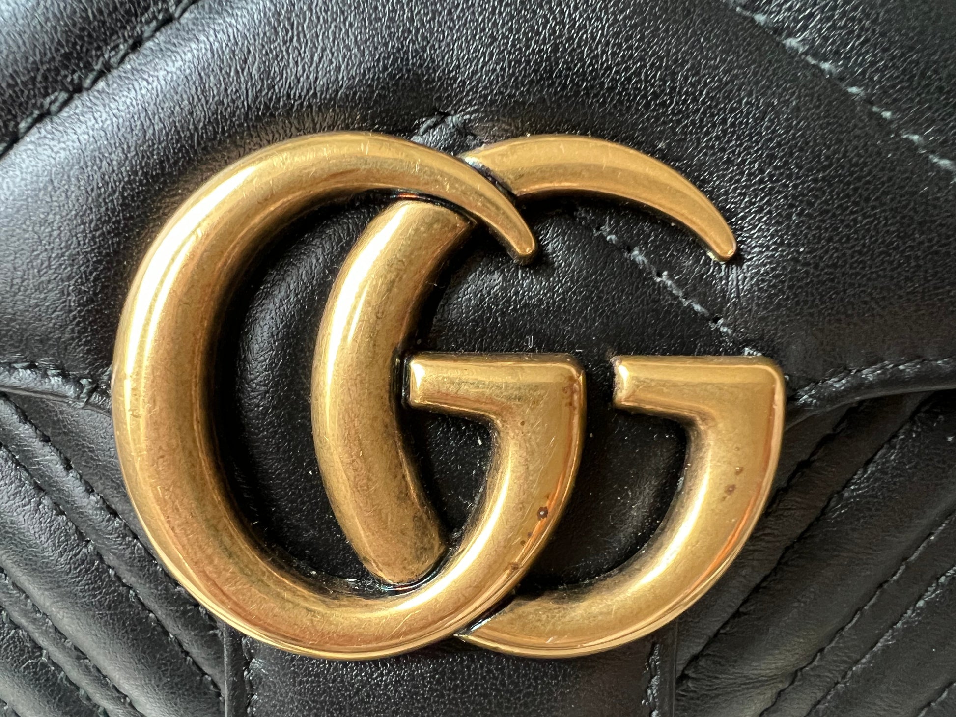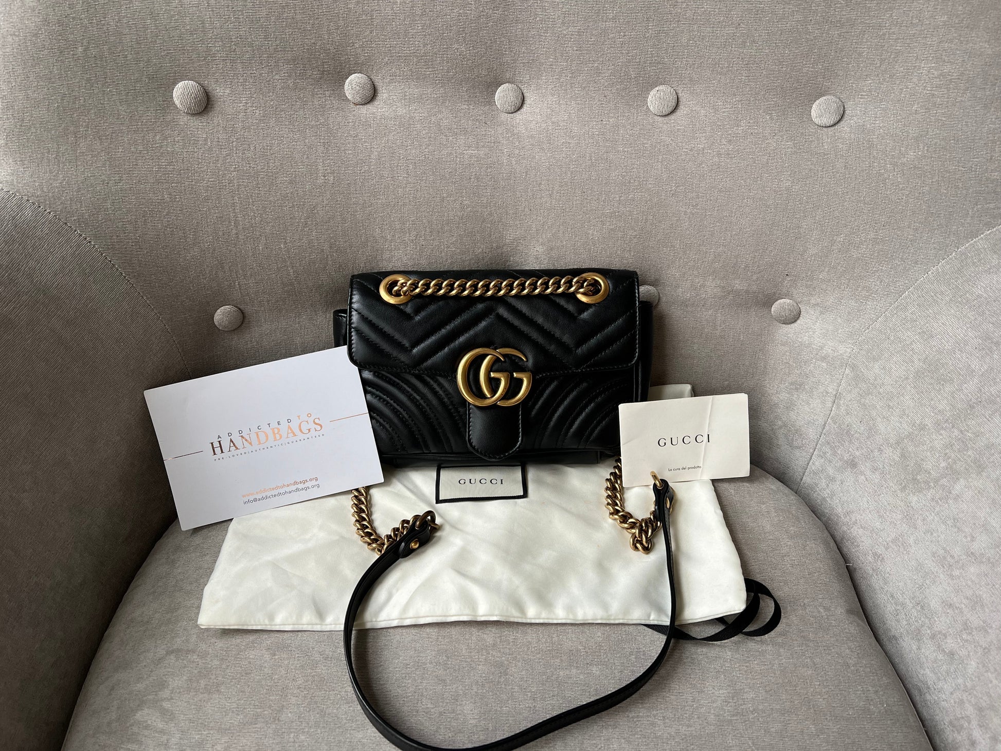 Gucci GG Marmont mini shoulder bag in black matelasse chevron leather with gold hardware. This mini Marmont bag has a softly structured shape and an oversized flap with GG hardware and heart detail on the back. The sliding chain can be multiple ways either doubled up or lengthened. Effortlessly chic and sophisticated, this style can be both with a casual outfit or for evening wear. Suitable for both day to day or occasion wear and ideal for those who prefer a cross body option.