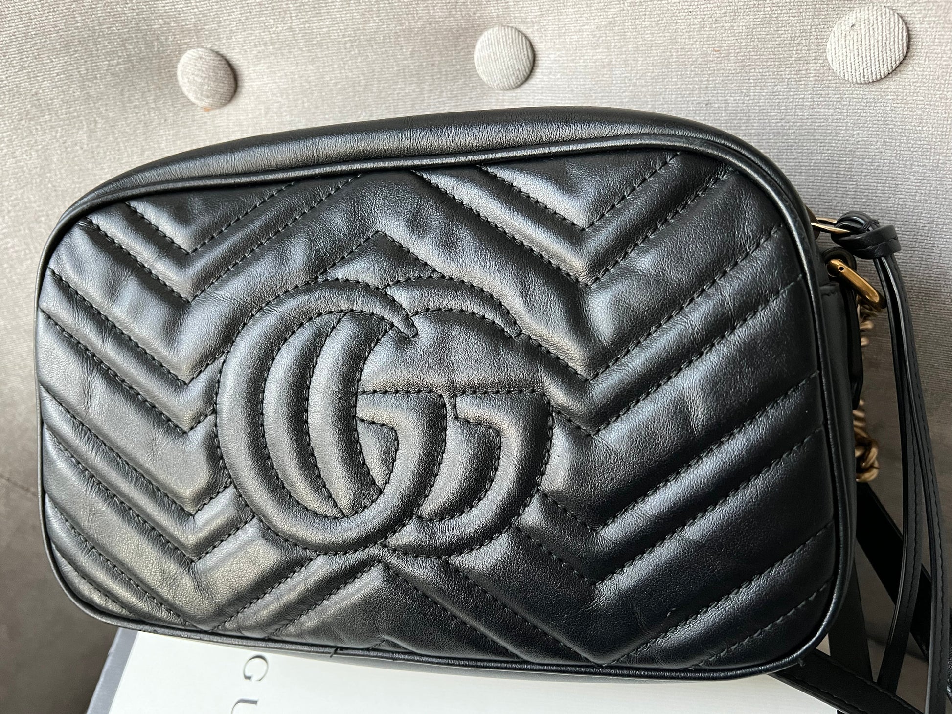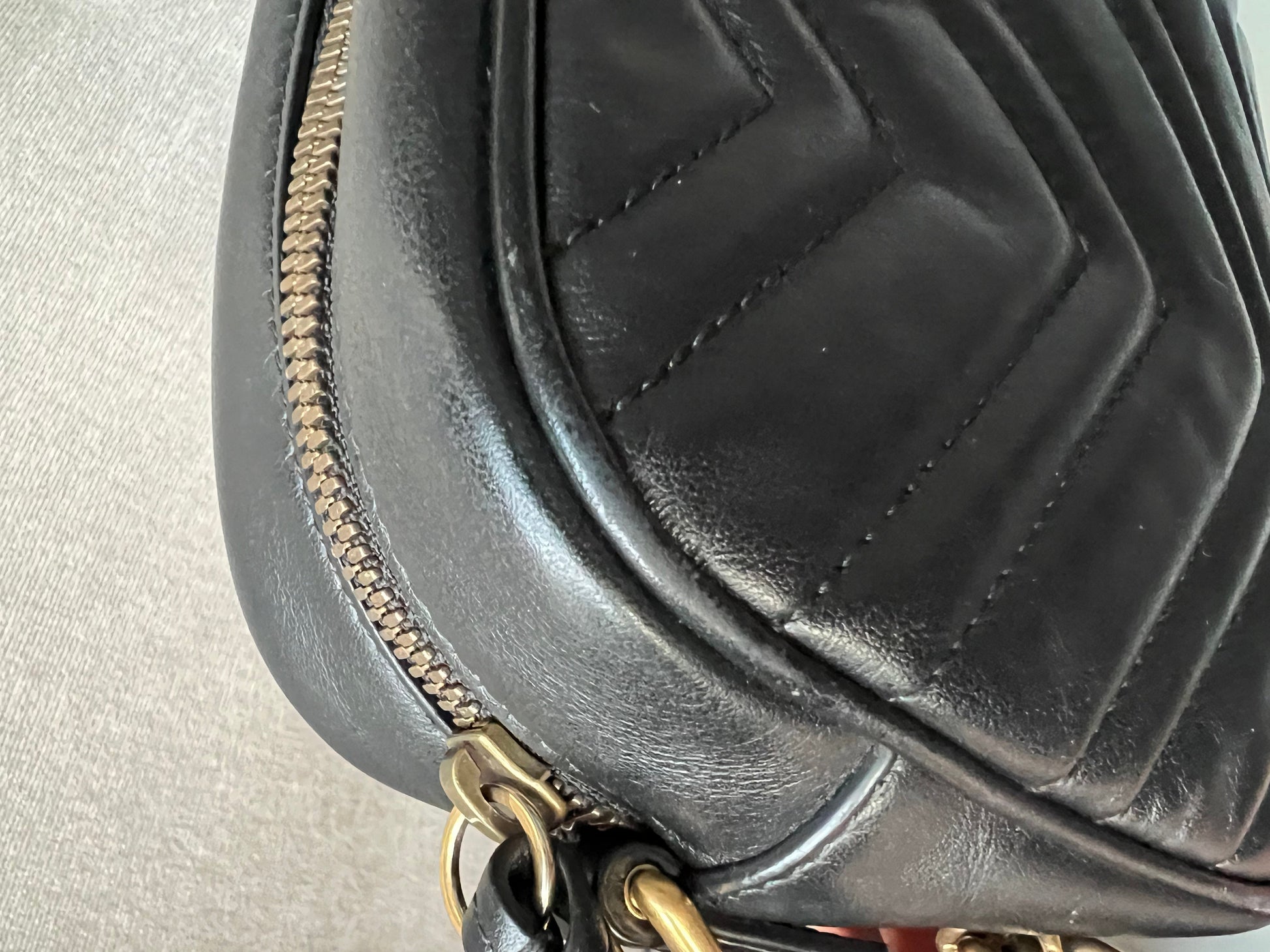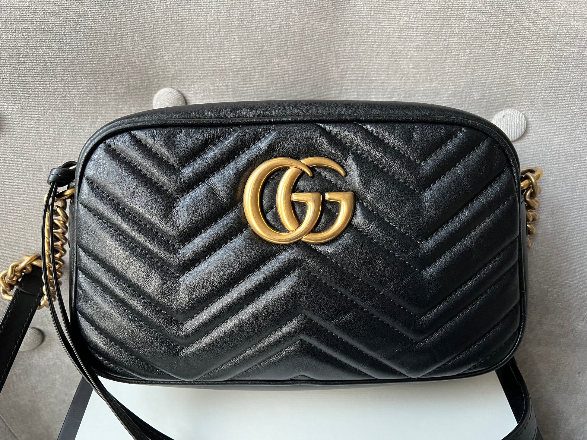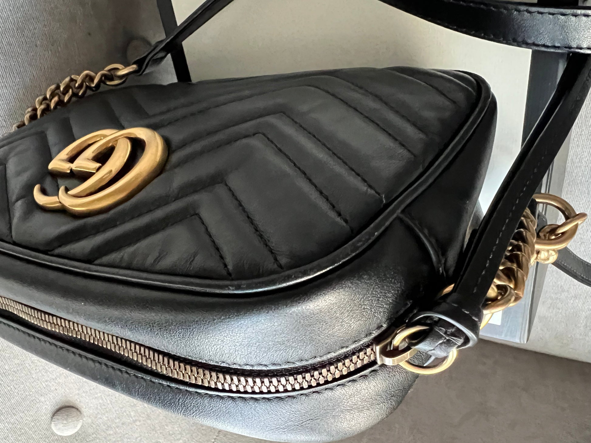 Gucci GG Marmont small shoulder bag in black chevron matelassé leather with gold hardware. This small Marmont chain camera style bag has a softly structured shape and zip top closure. Effortlessly chic and sophisticated, this style can be both with a casual outfit or for evening wear. Suitable for both day to day or occasion wear and ideal for those who prefer a cross body option.