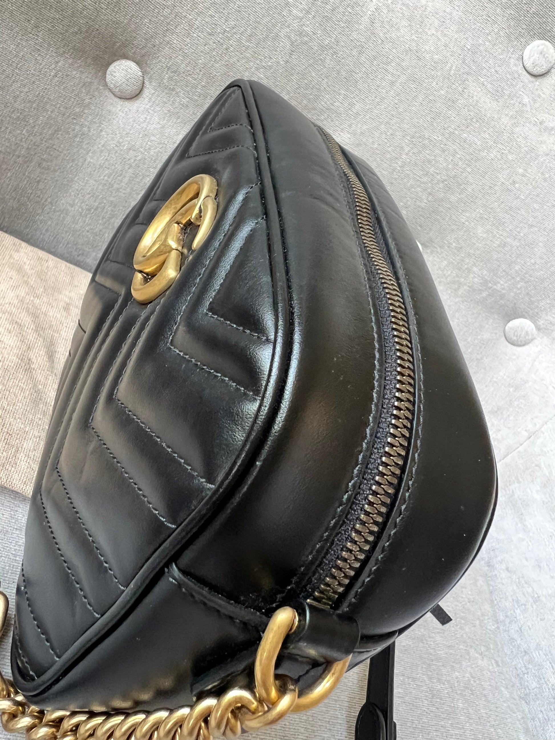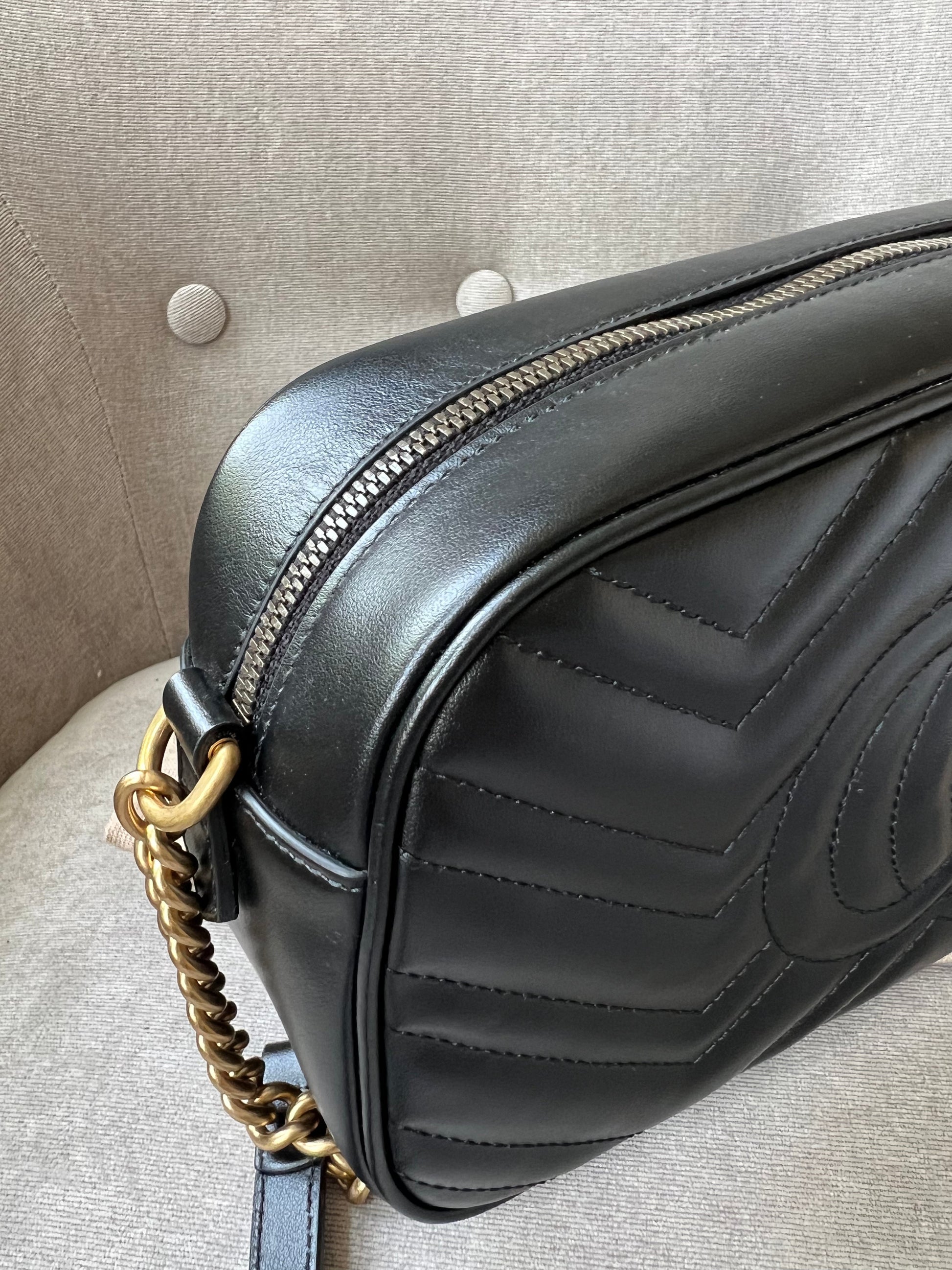 Gucci GG Marmont small shoulder bag in black chevron matelassé leather with gold hardware. This small Marmont chain camera style bag has a softly structured shape and zip top closure. Effortlessly chic and sophisticated, this style can be both with a casual outfit or for evening wear. Suitable for both day to day or occasion wear and ideal for those who prefer a cross body option.