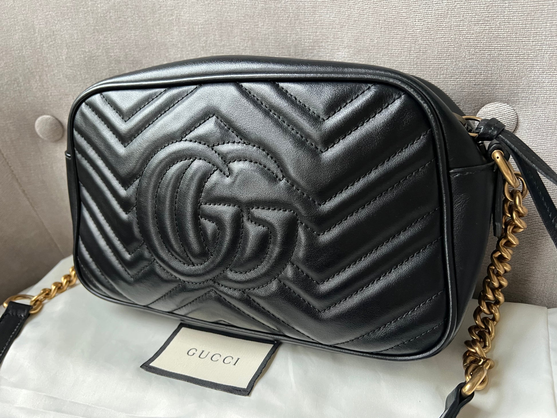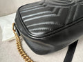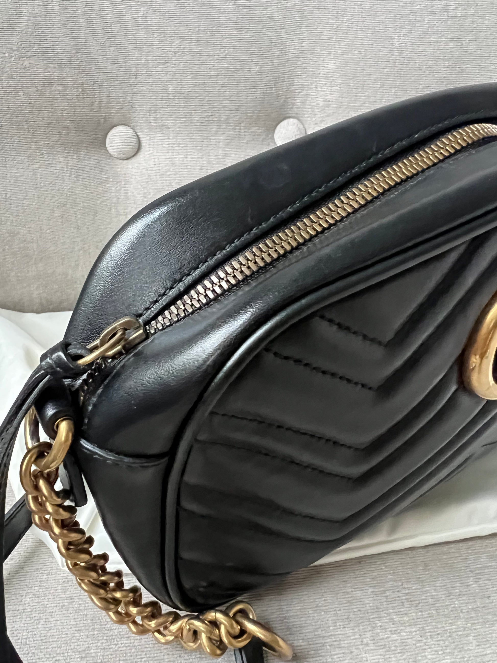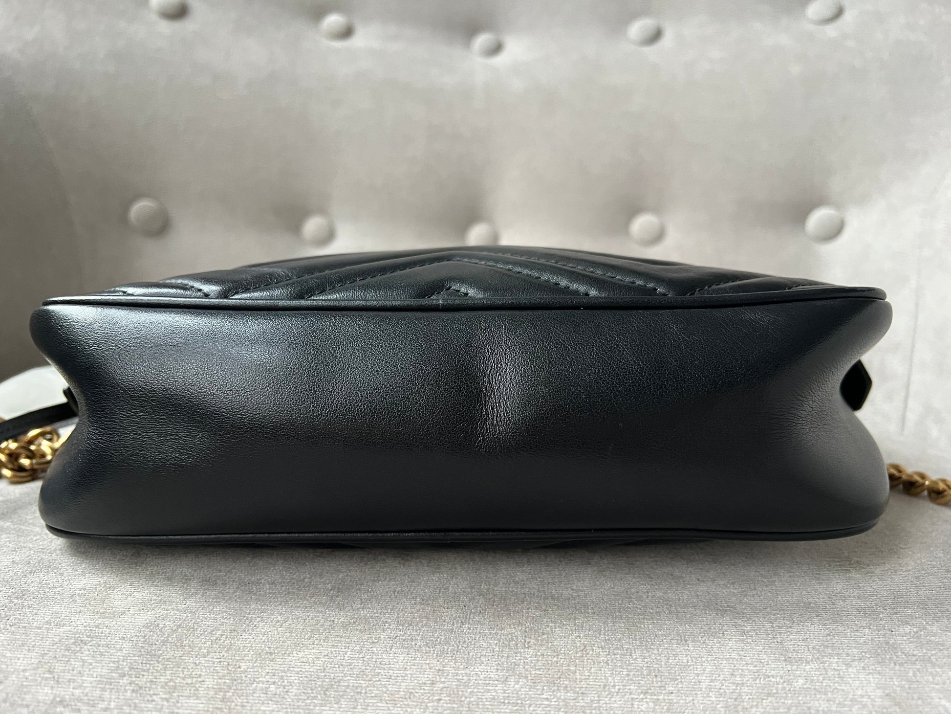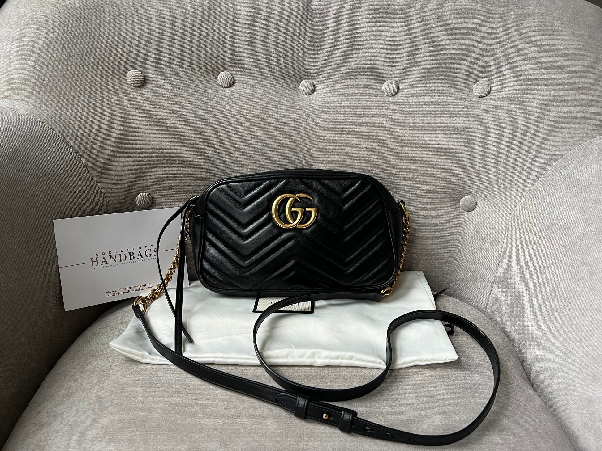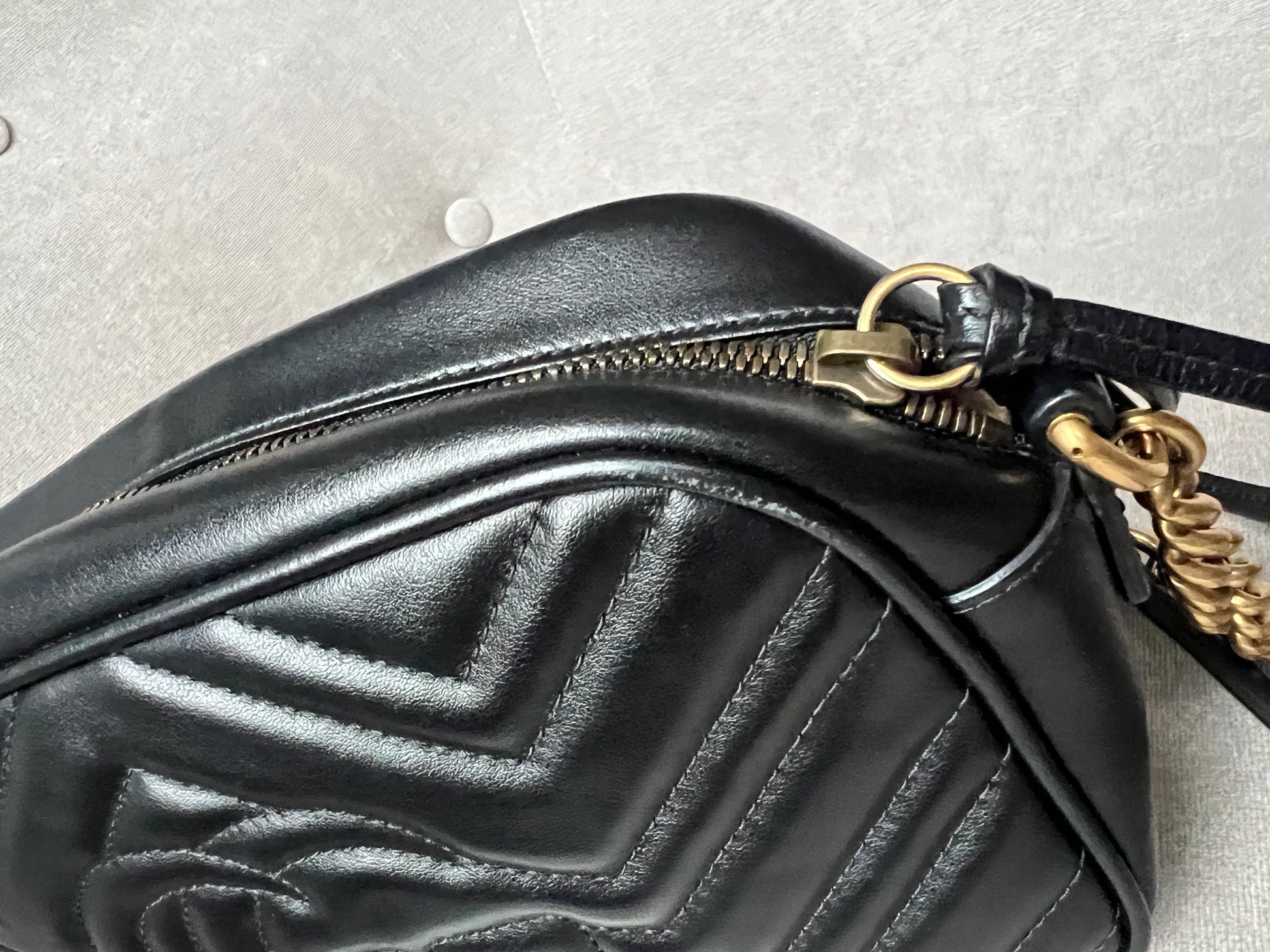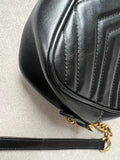 Gucci GG Marmont small shoulder bag in black chevron matelassé leather with gold hardware. This small Marmont chain camera style bag has a softly structured shape and zip top closure. Effortlessly chic and sophisticated, this style can be both with a casual outfit or for evening wear. Suitable for both day to day or occasion wear and ideal for those who prefer a cross body option.