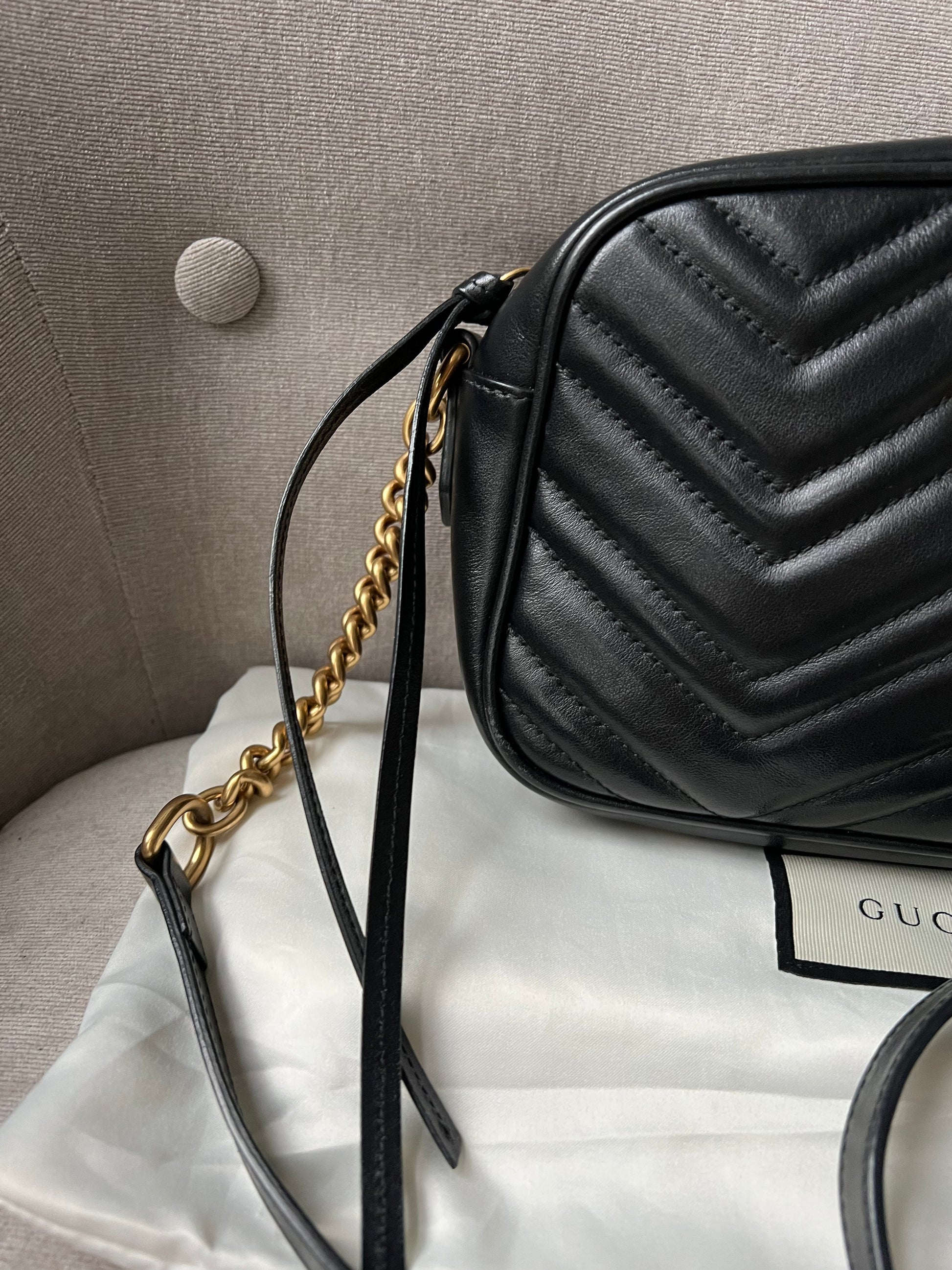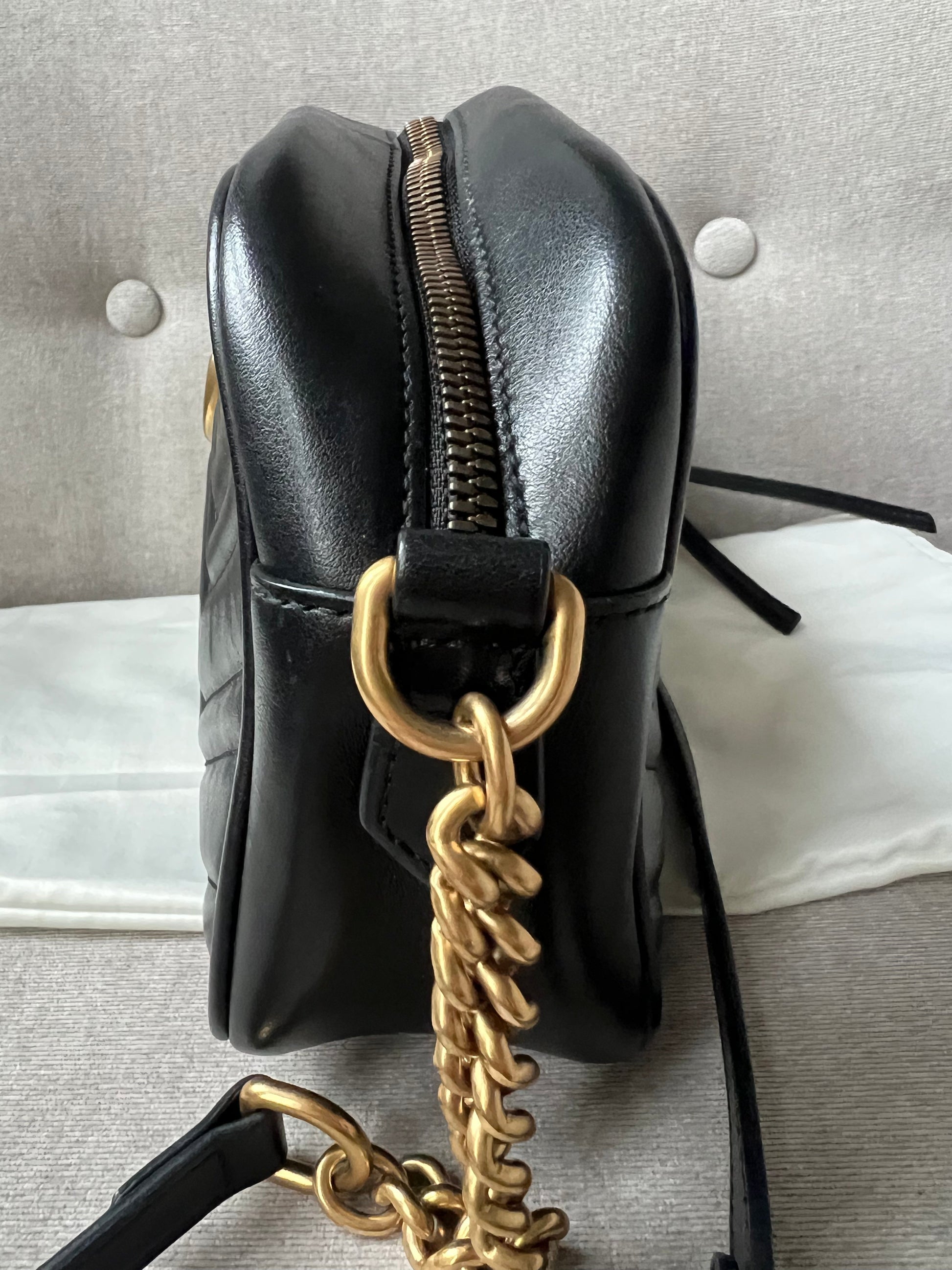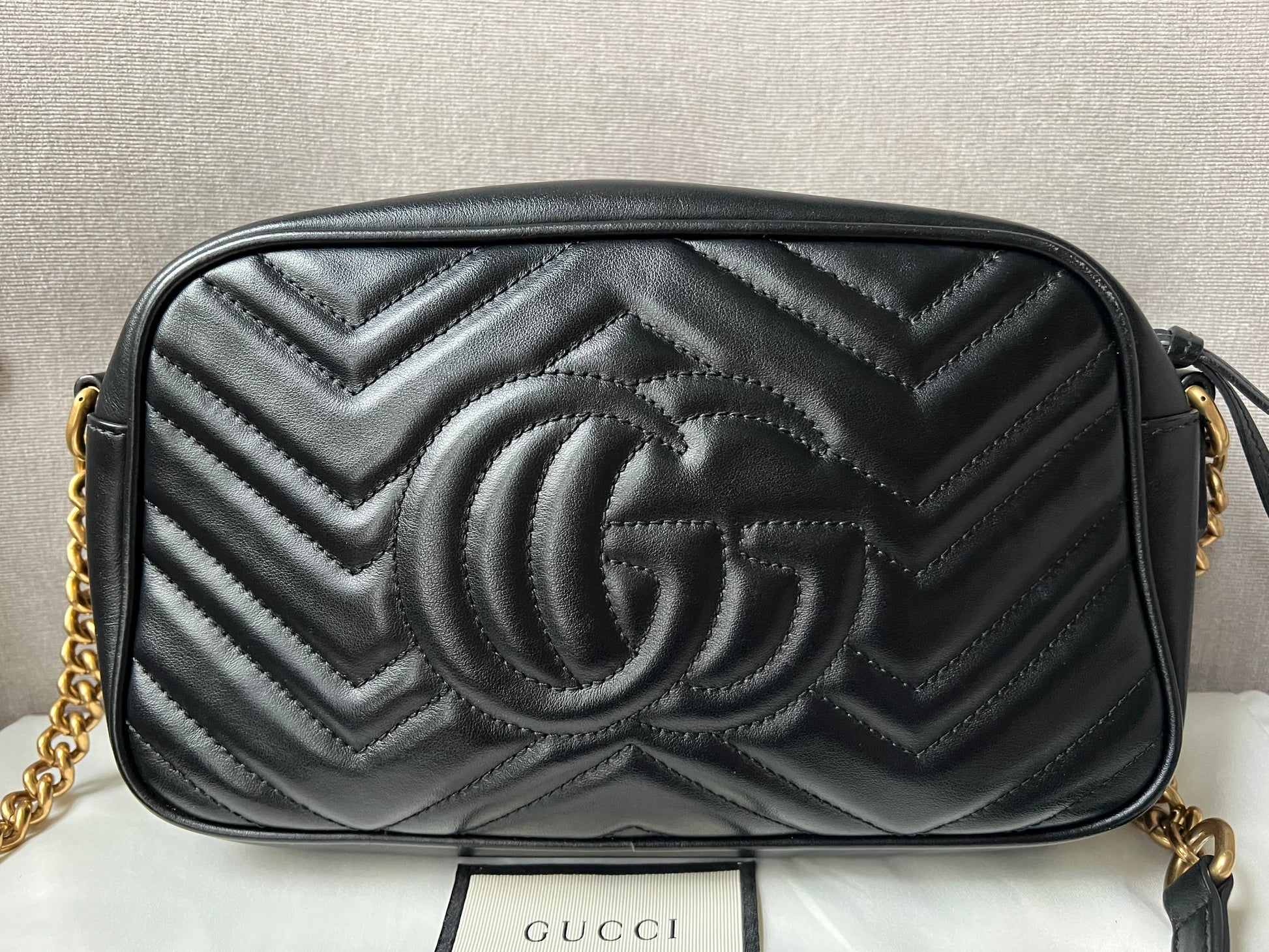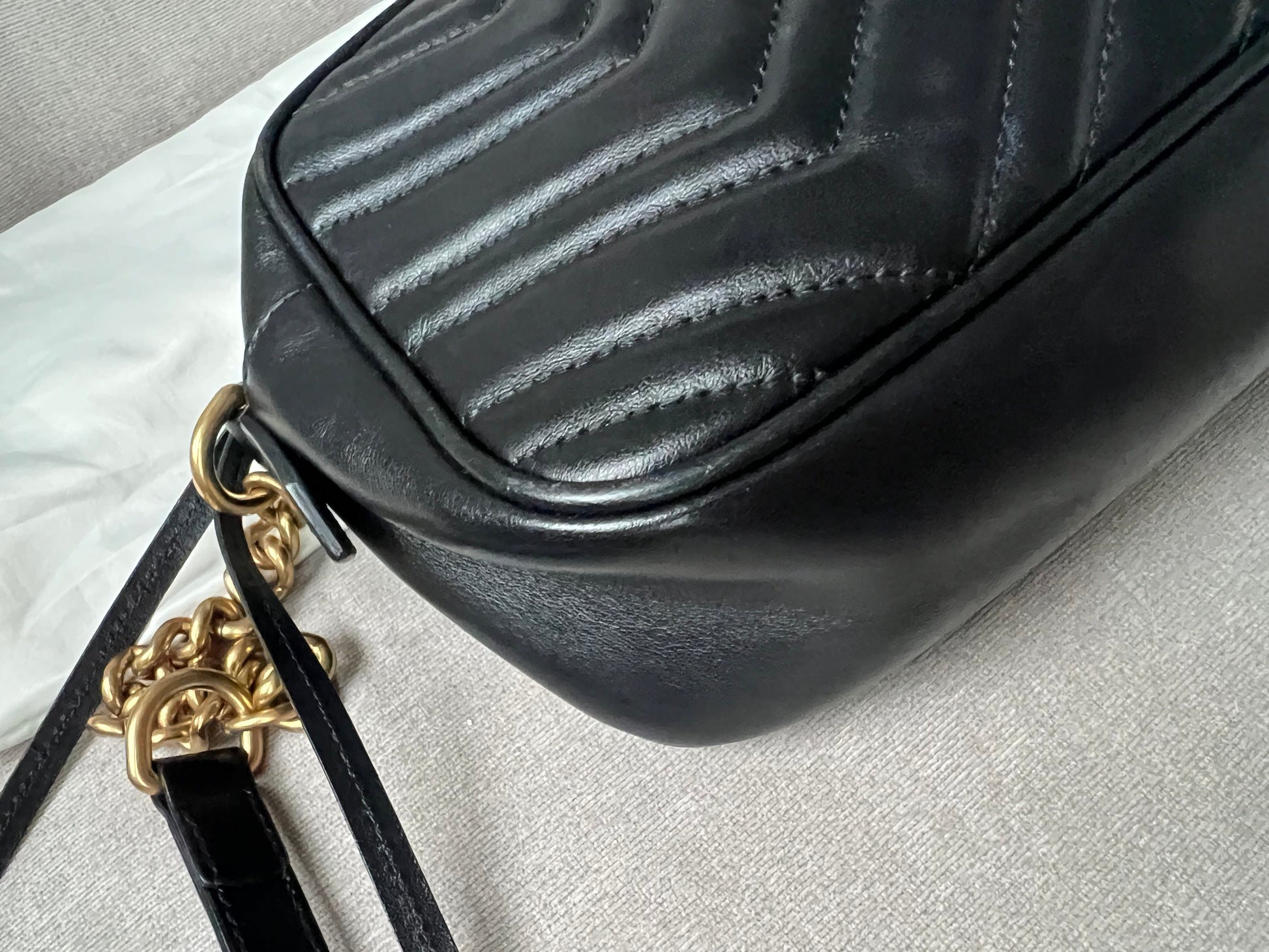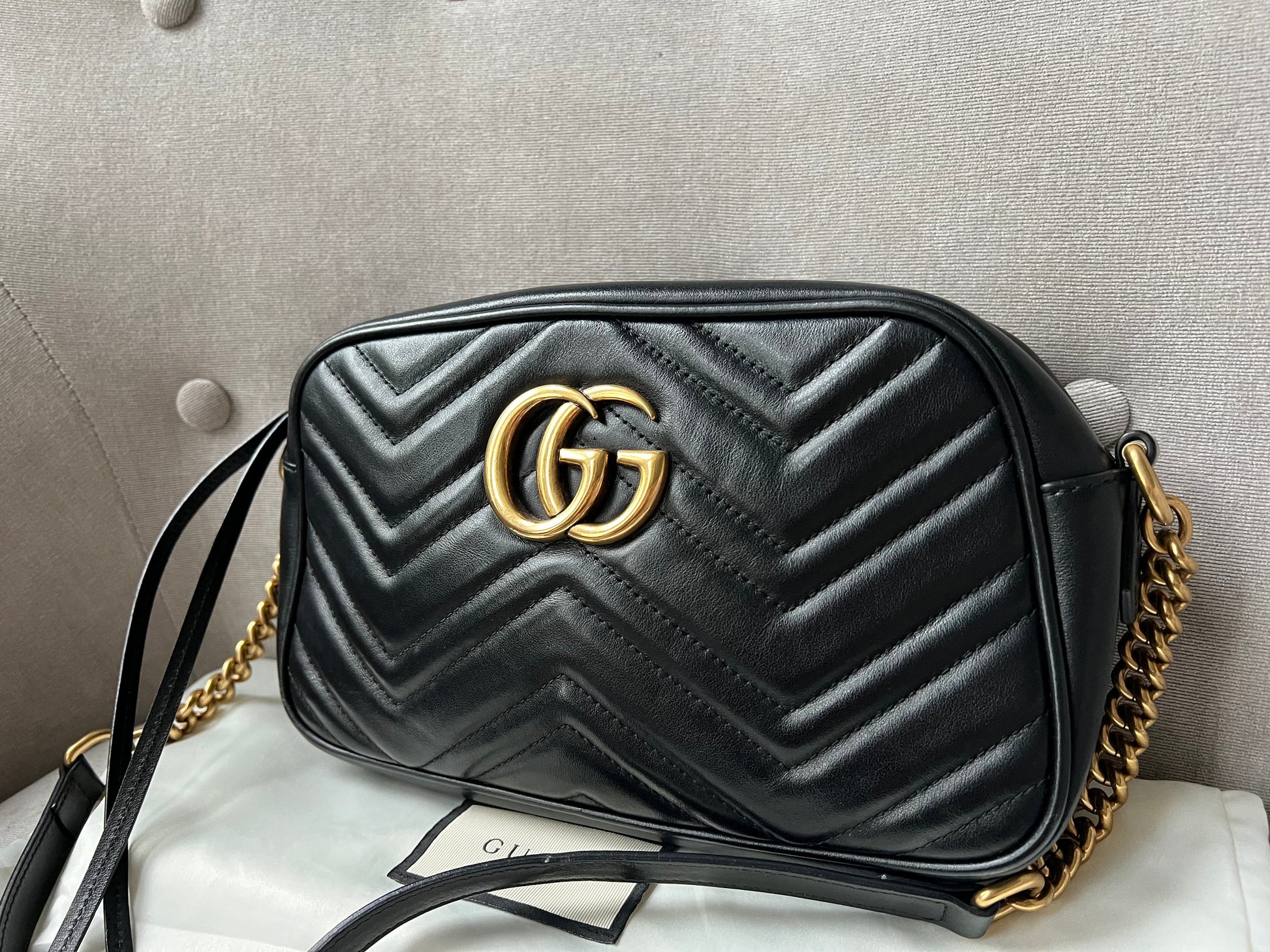 Gucci GG Marmont small shoulder bag in black chevron matelassé leather with gold hardware. This small Marmont chain camera style bag has a softly structured shape and zip top closure. Effortlessly chic and sophisticated, this style can be both with a casual outfit or for evening wear. Suitable for both day to day or occasion wear and ideal for those who prefer a cross body option.