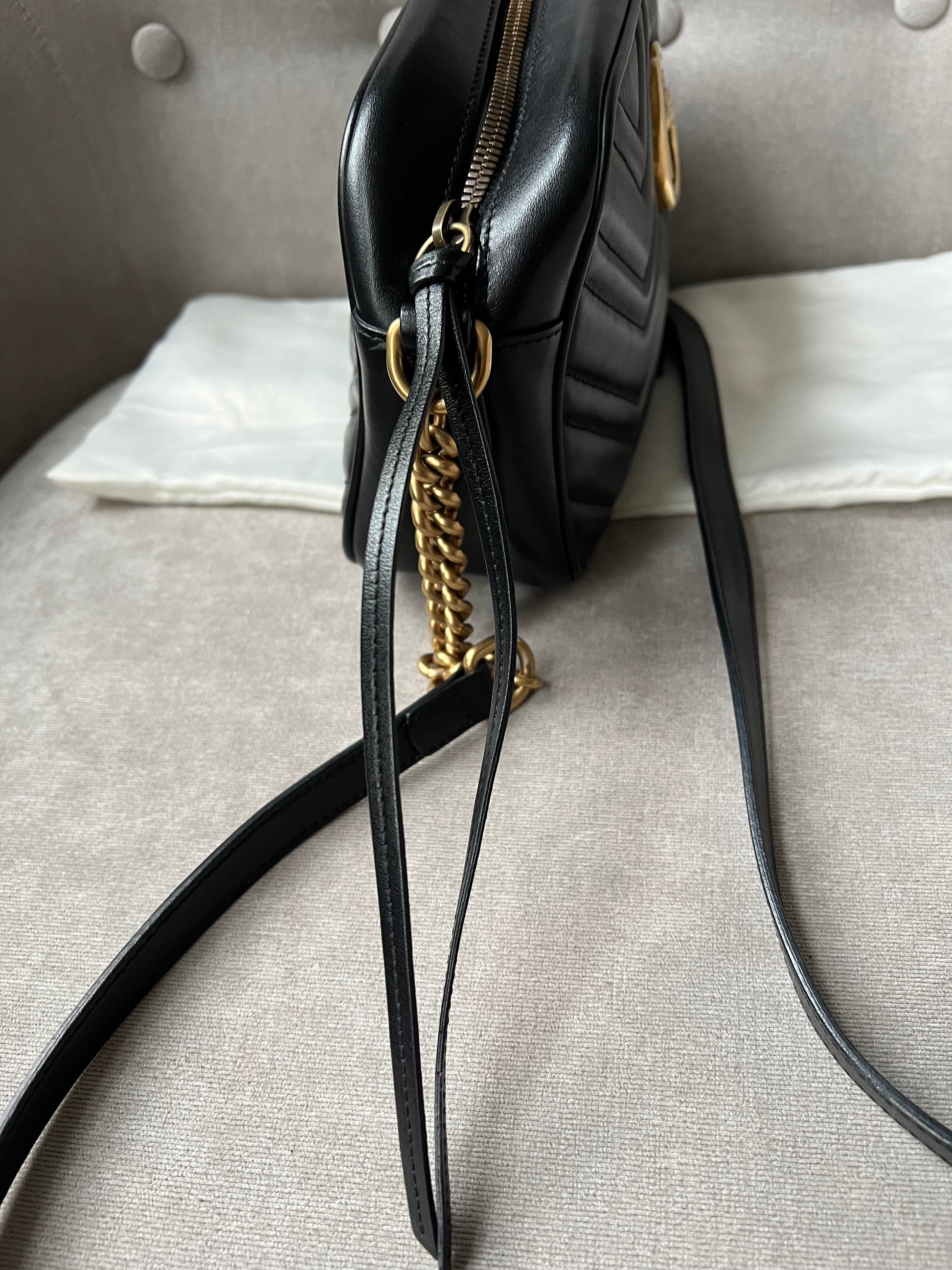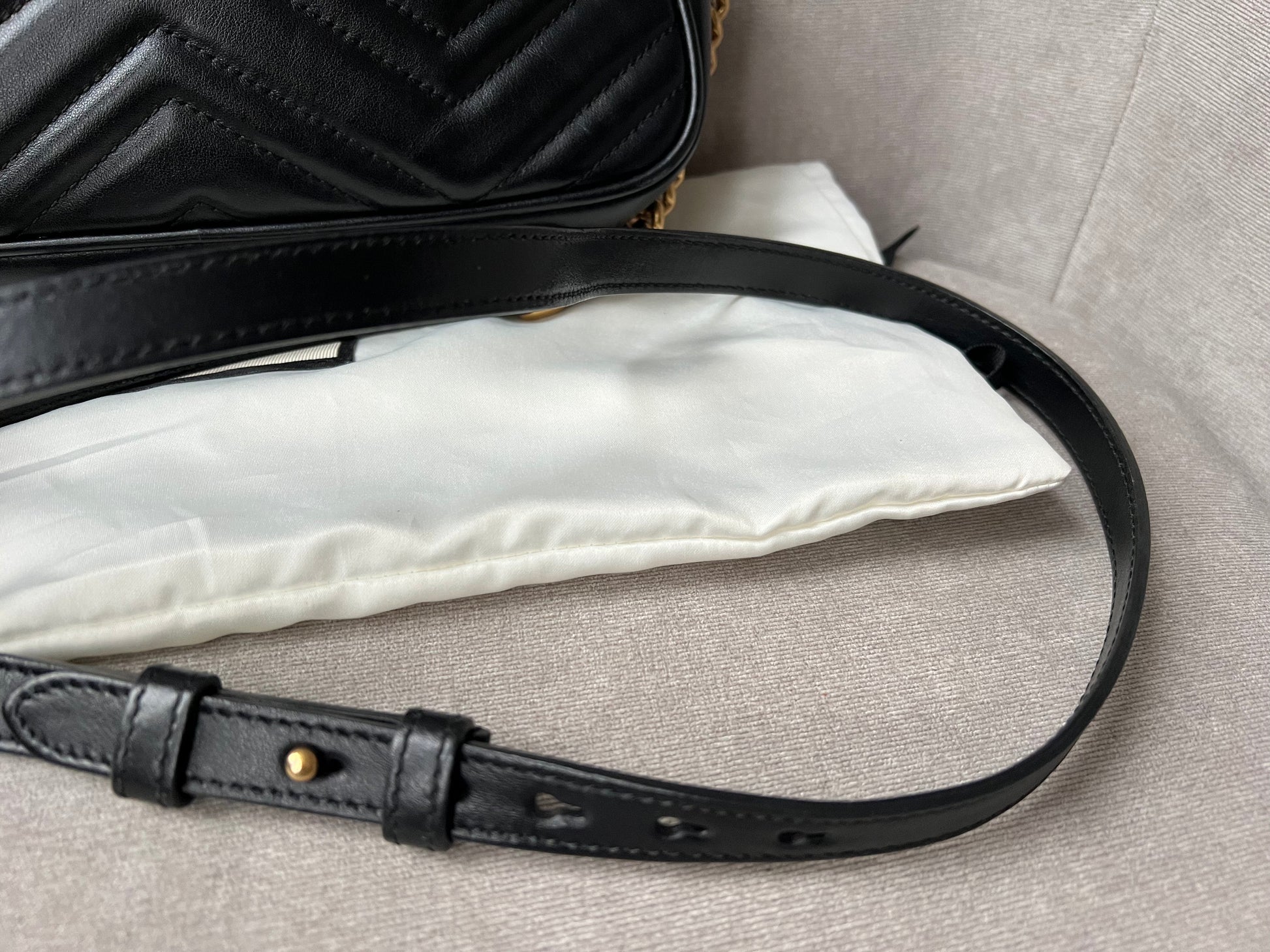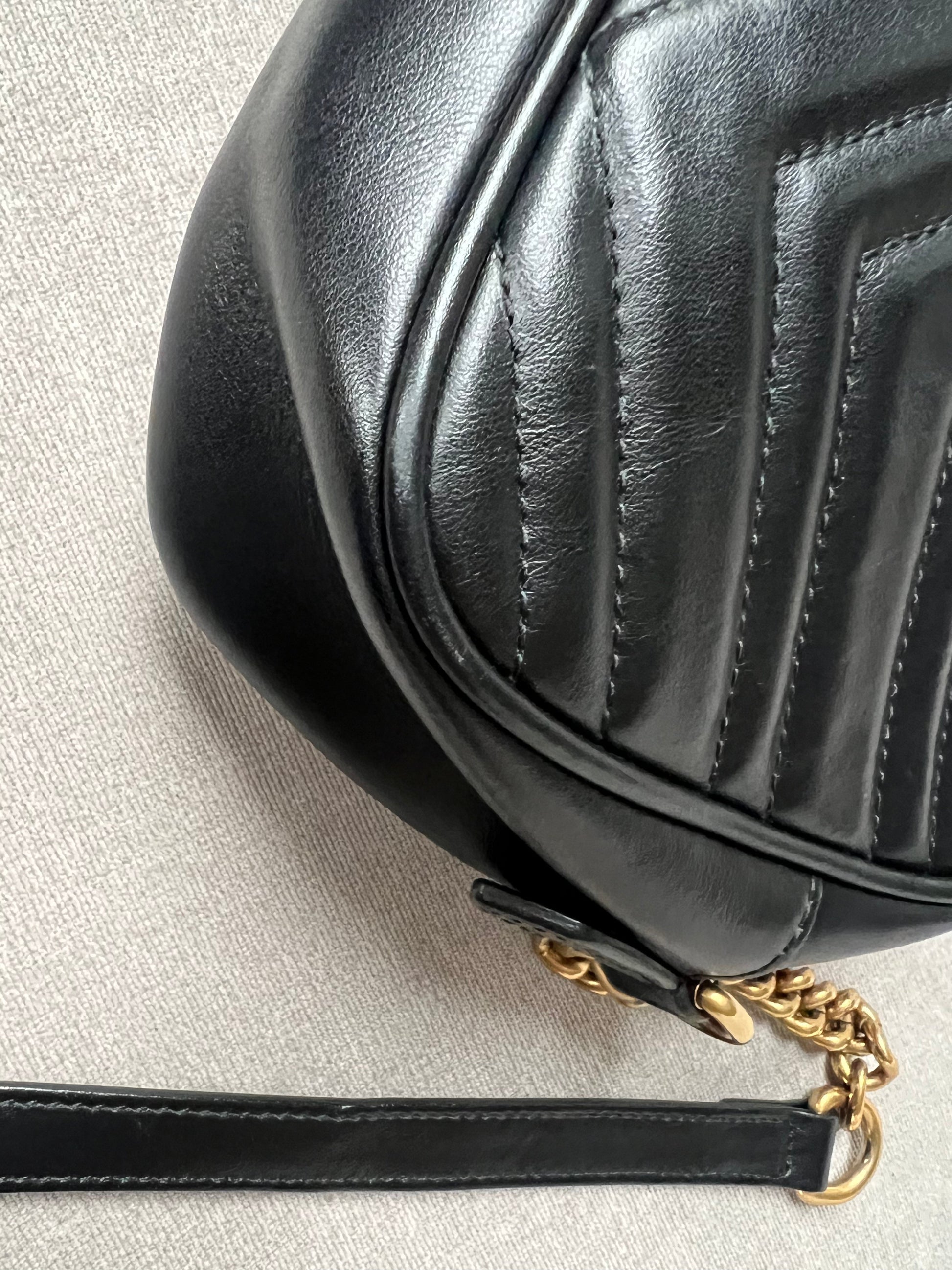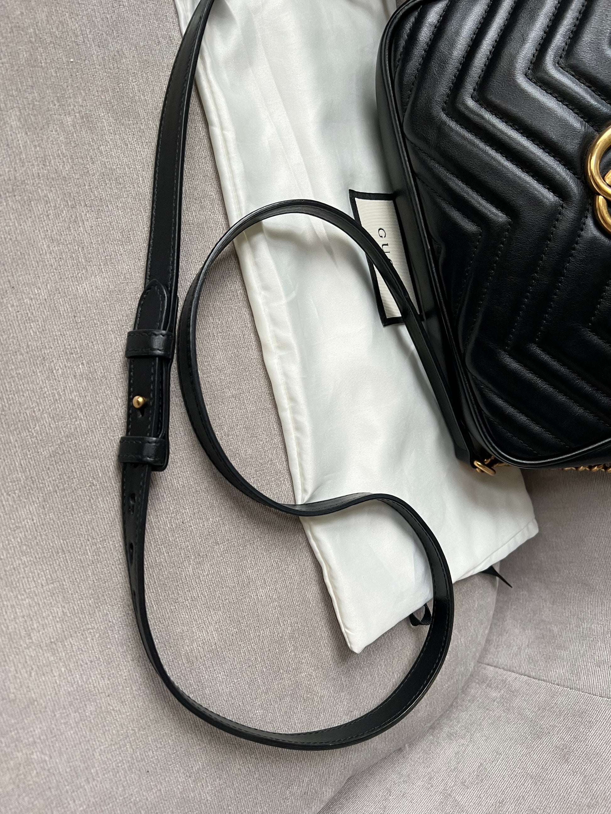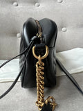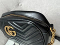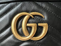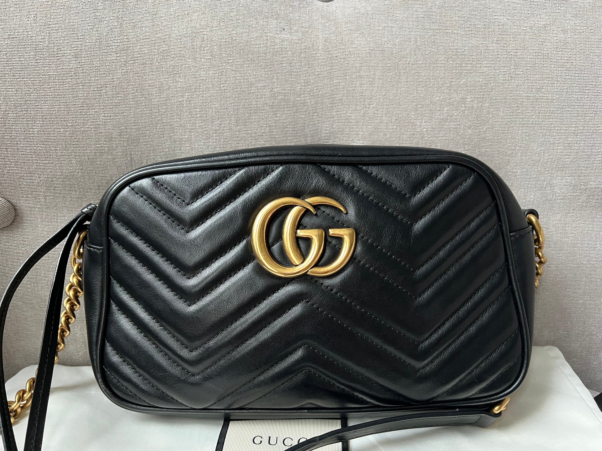Gucci GG Marmont small shoulder bag in black chevron matelassé leather with gold hardware. This small Marmont chain camera style bag has a softly structured shape and zip top closure. Effortlessly chic and sophisticated, this style can be both with a casual outfit or for evening wear. Suitable for both day to day or occasion wear and ideal for those who prefer a cross body option.