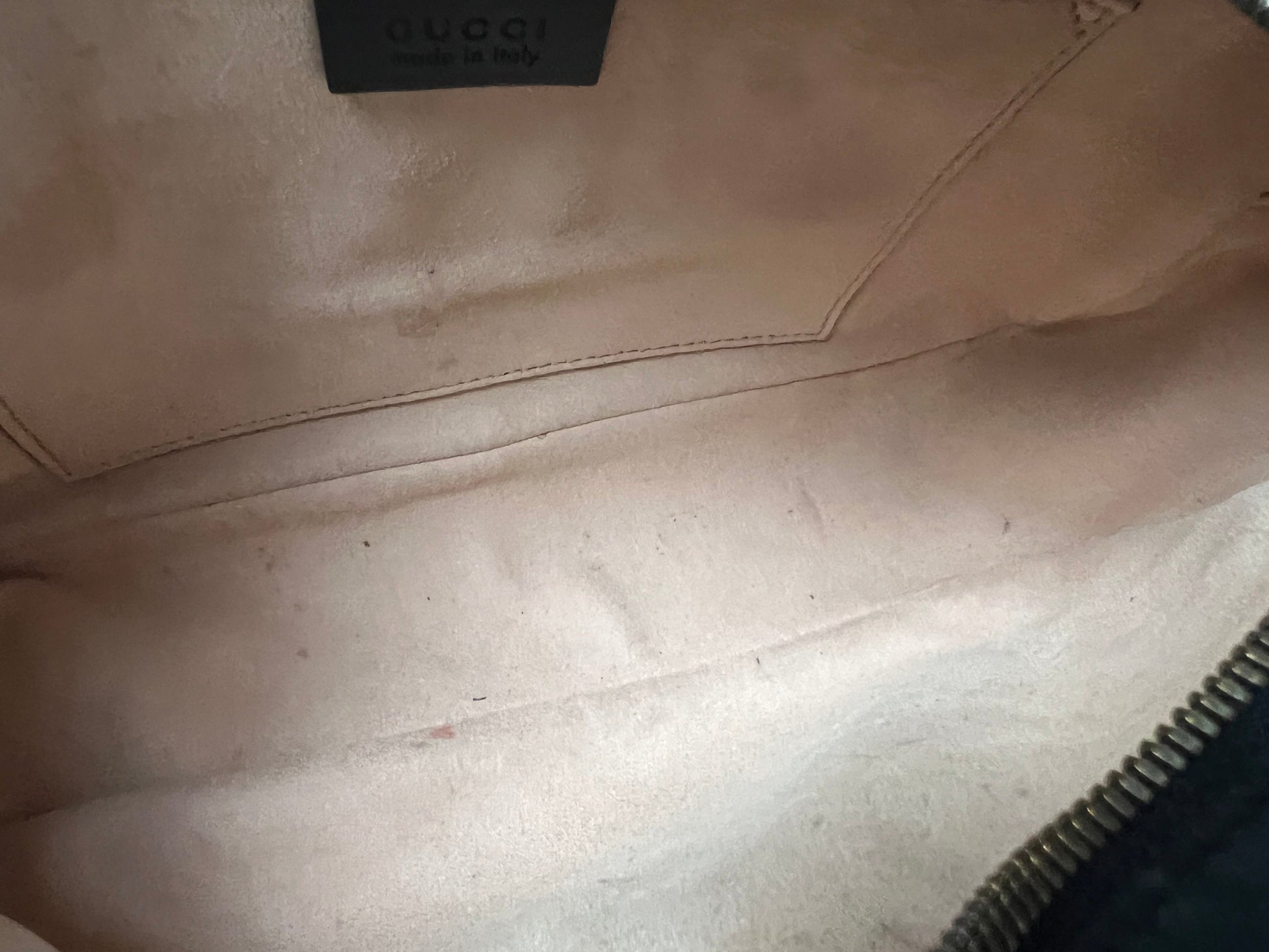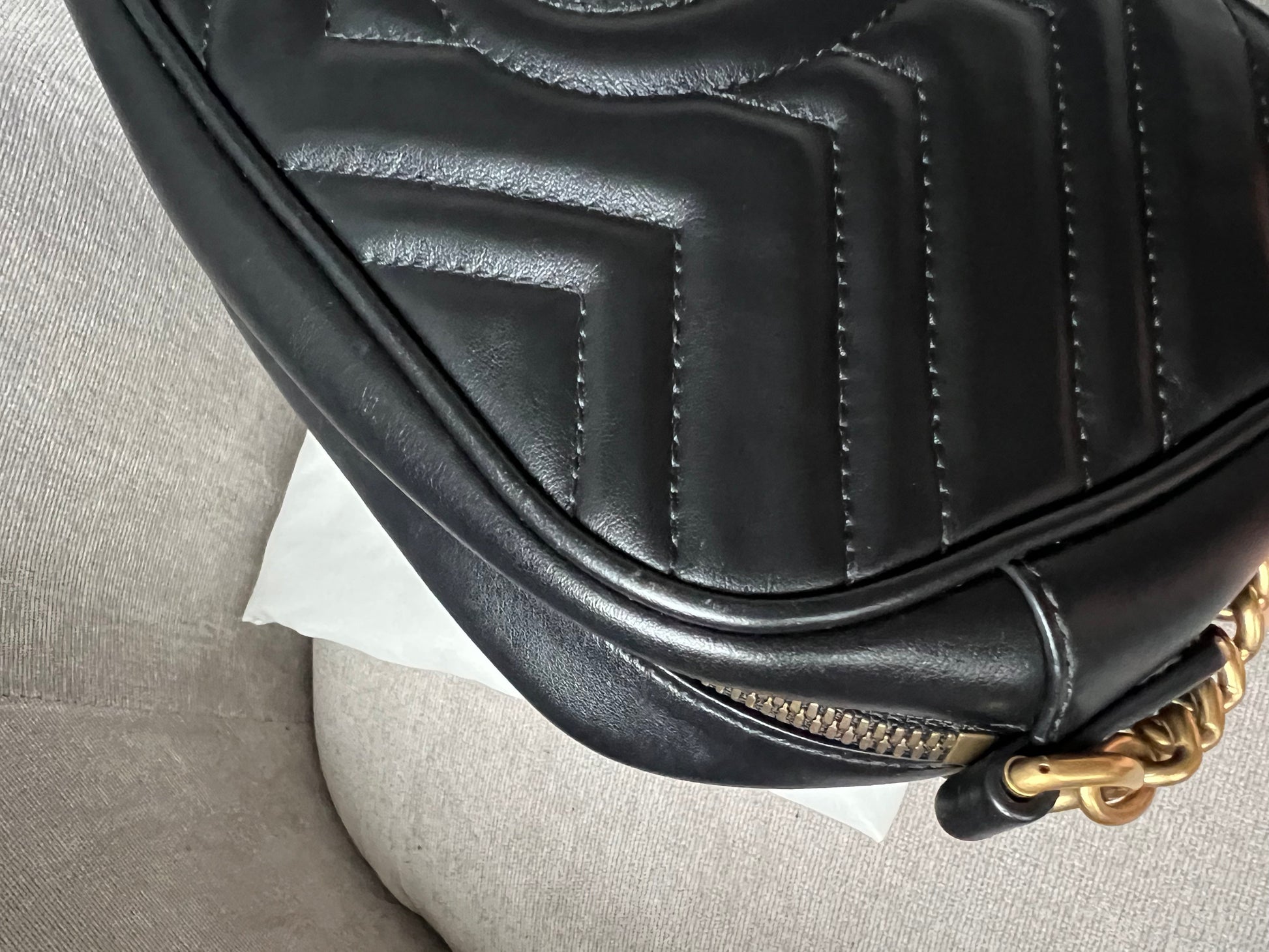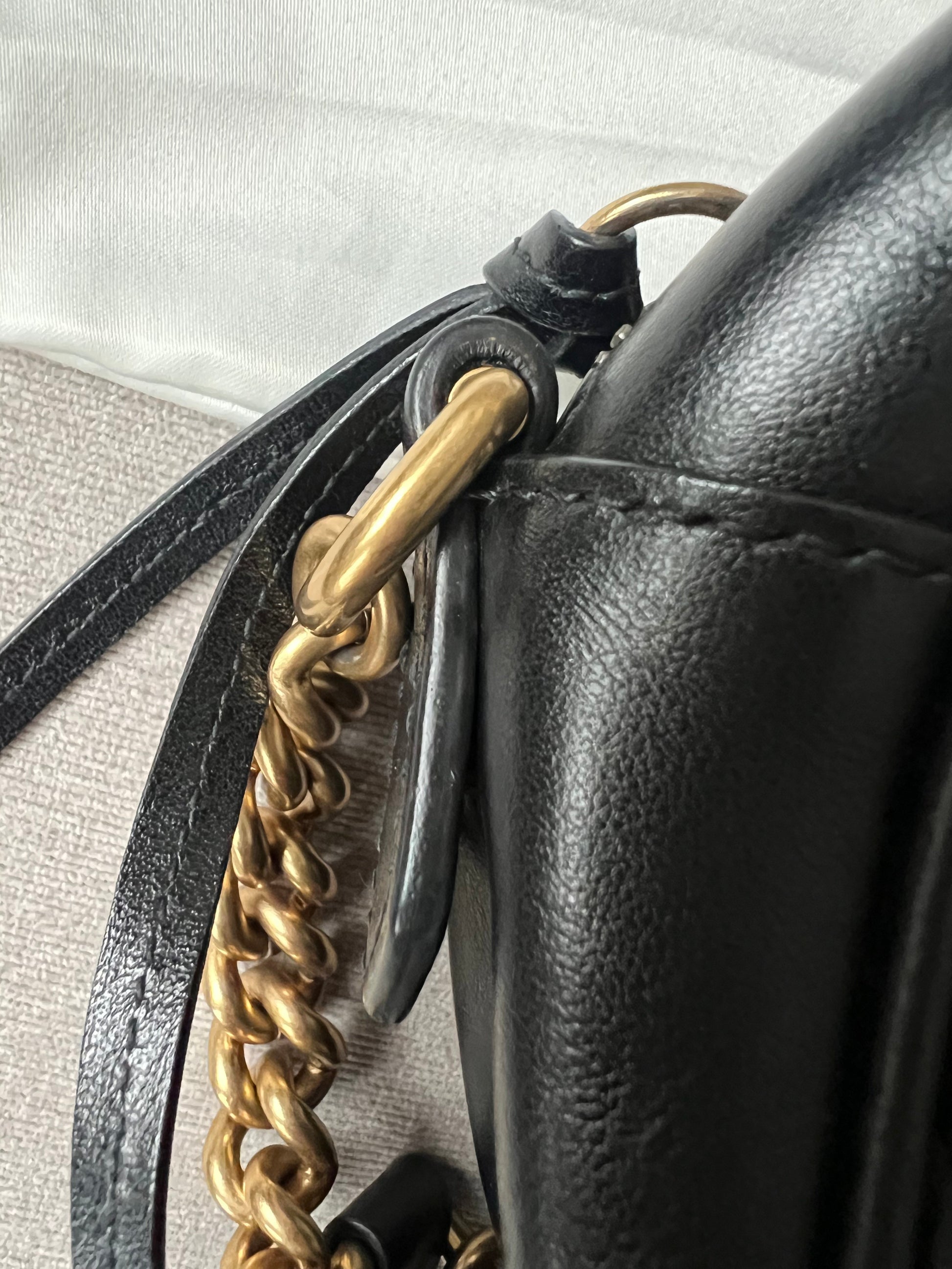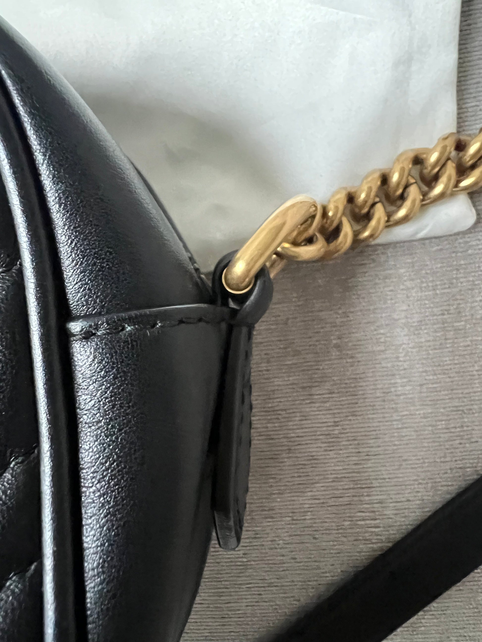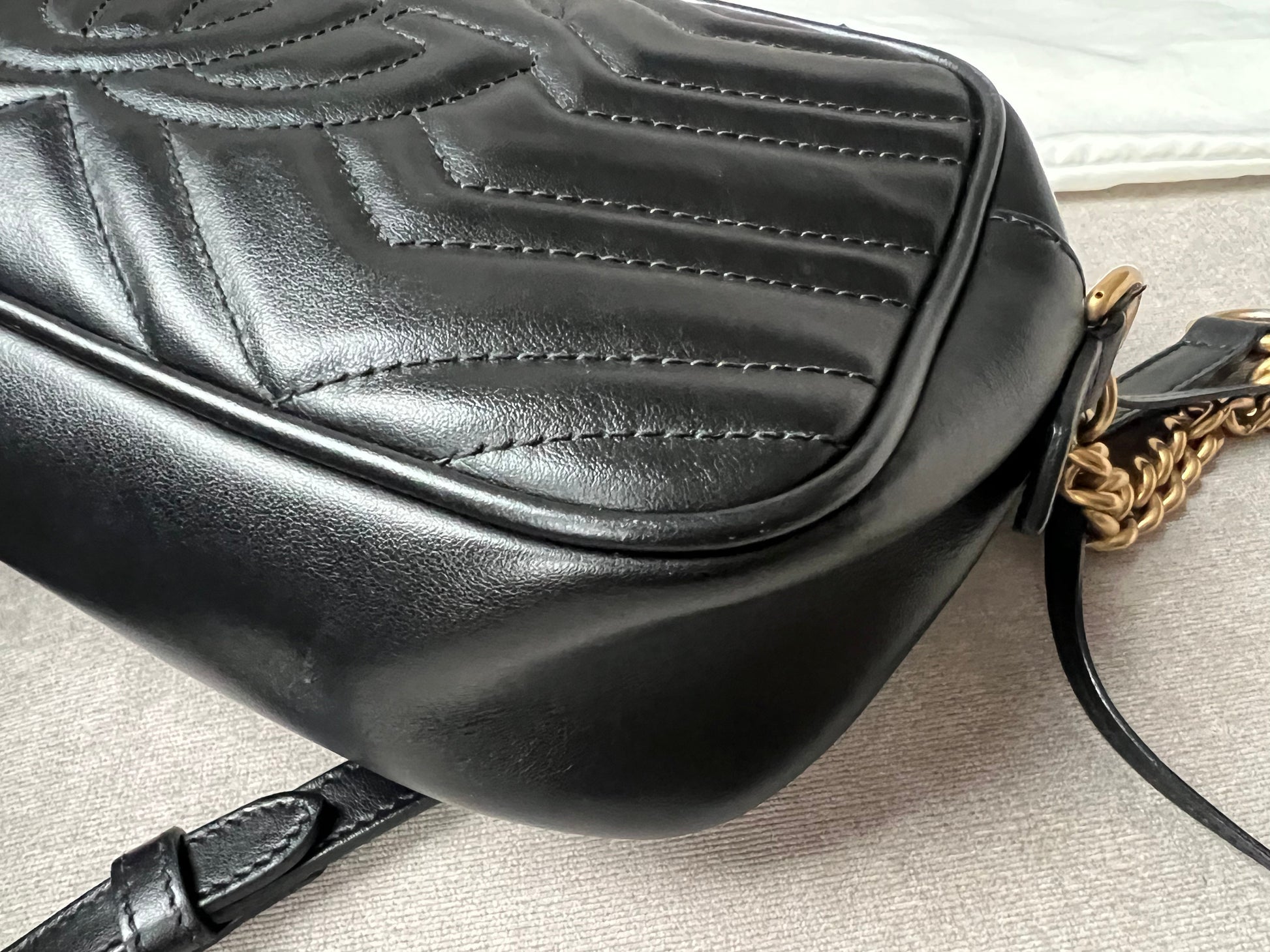 Gucci GG Marmont small shoulder bag in black chevron matelassé leather with gold hardware. This small Marmont chain camera style bag has a softly structured shape and zip top closure. Effortlessly chic and sophisticated, this style can be both with a casual outfit or for evening wear. Suitable for both day to day or occasion wear and ideal for those who prefer a cross body option.