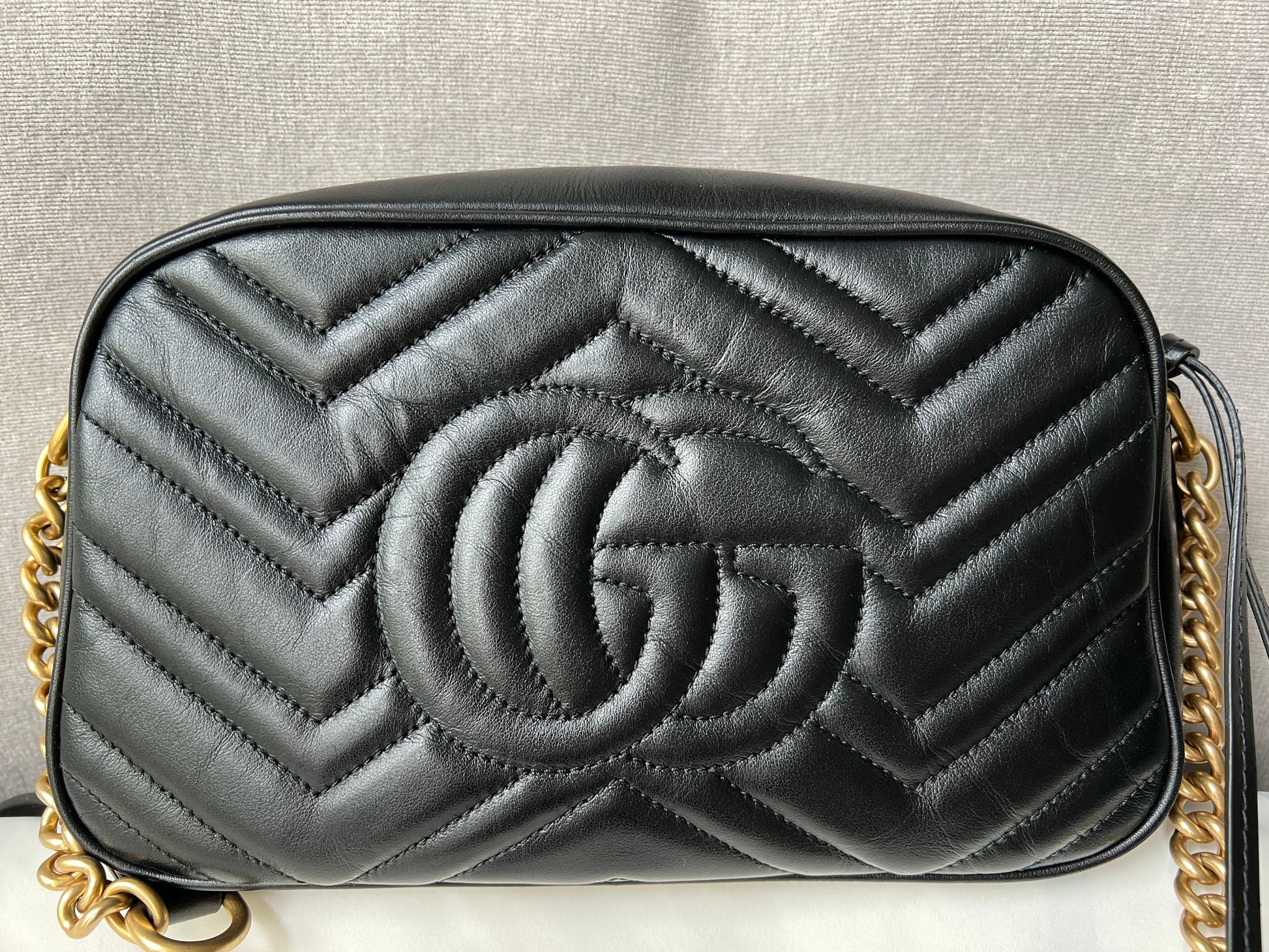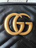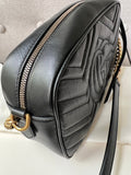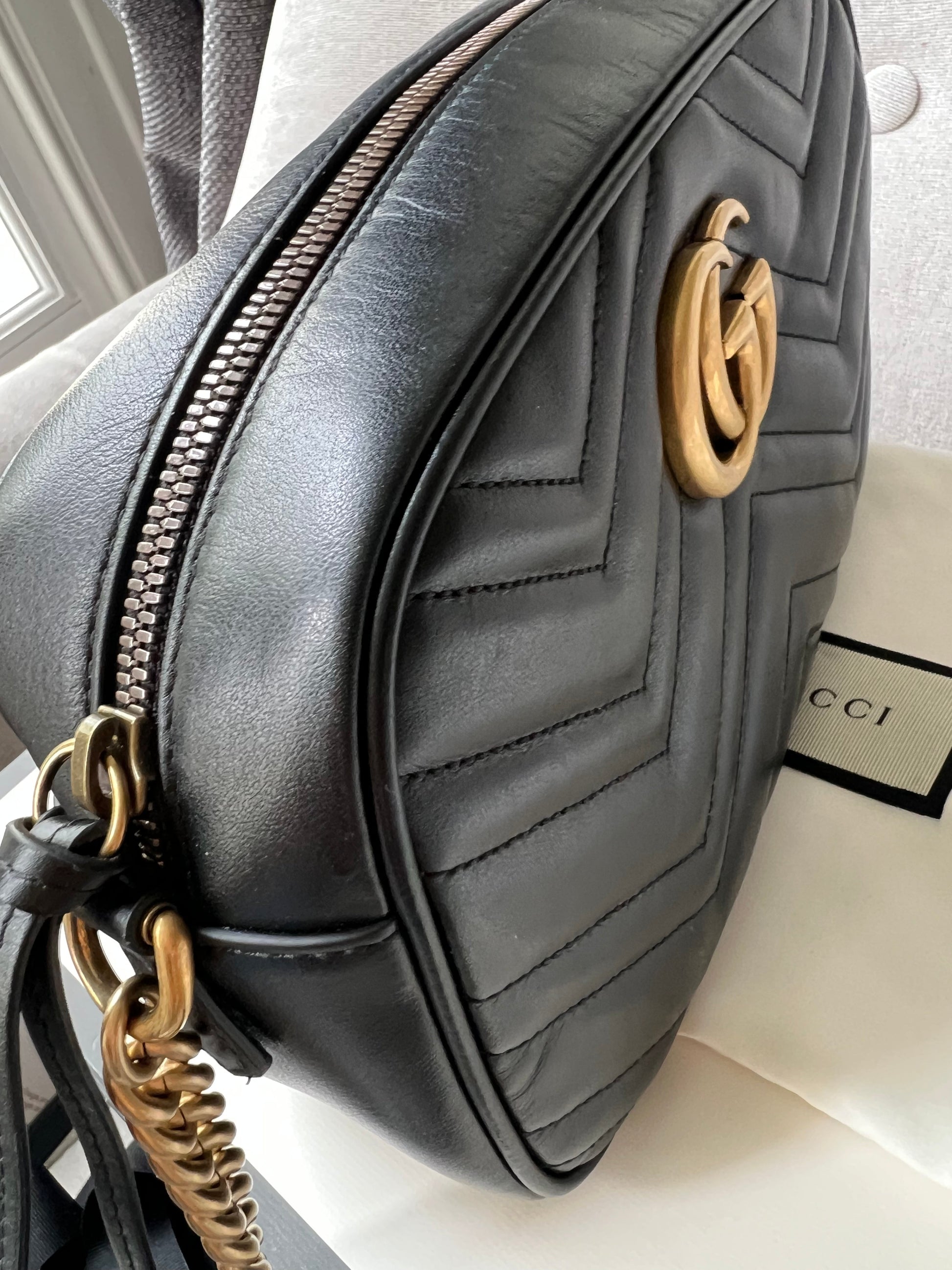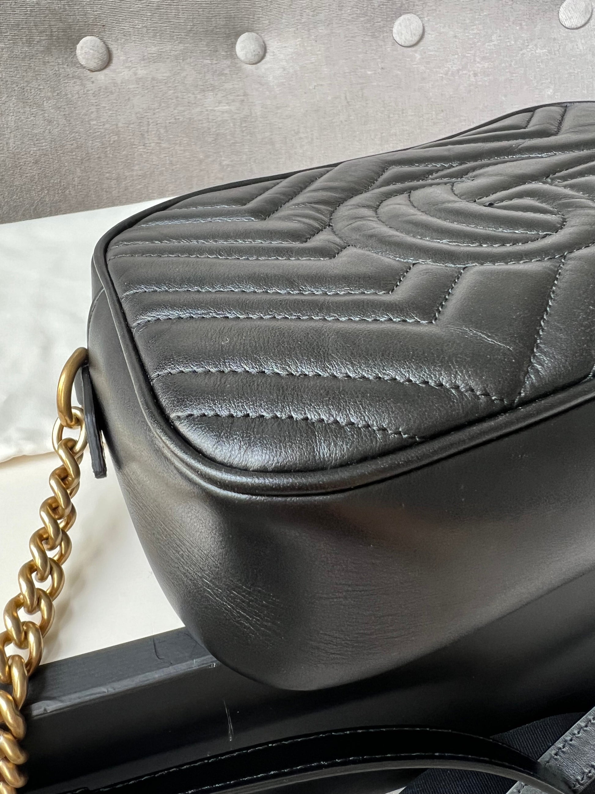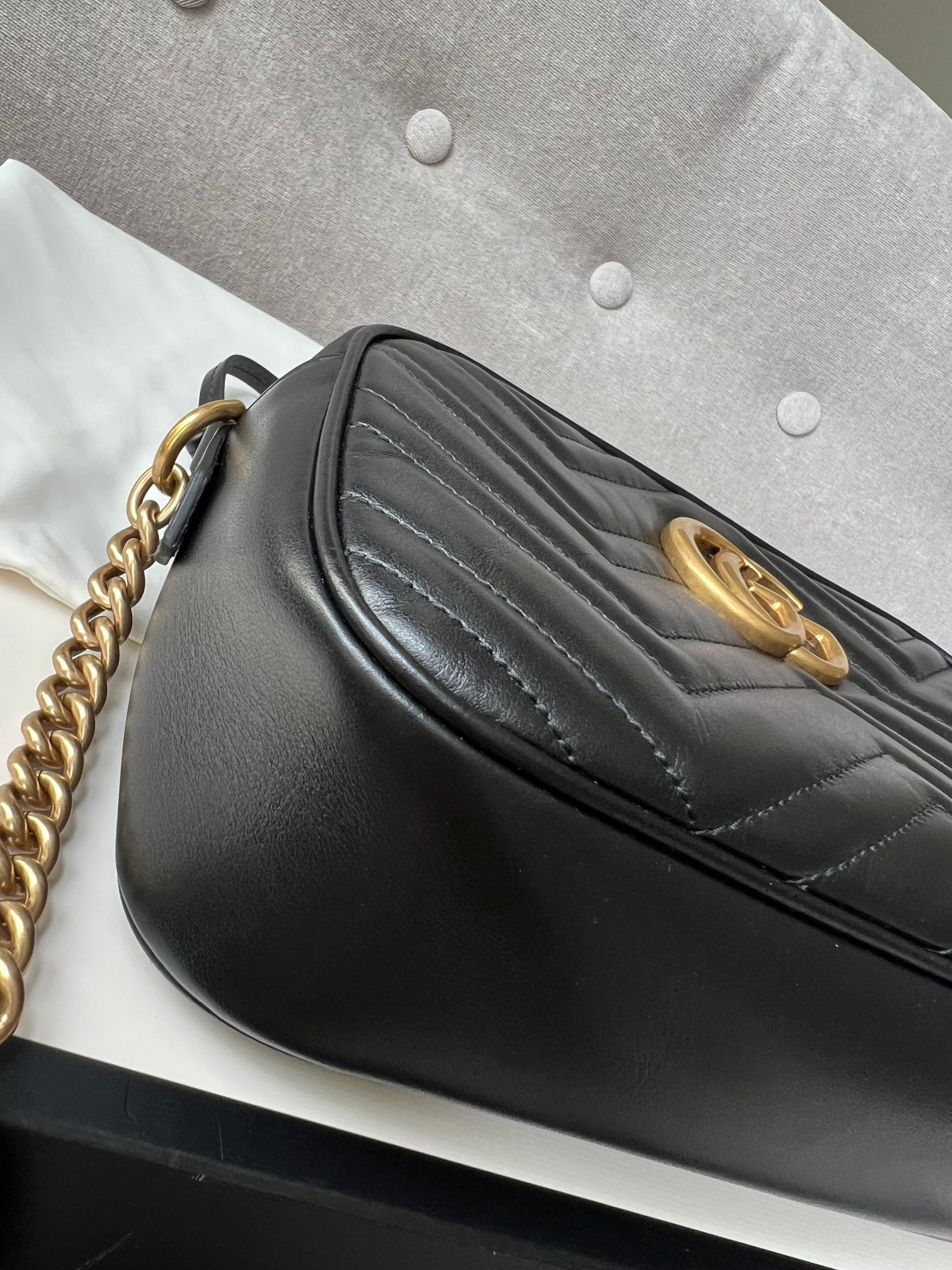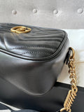Gucci GG Marmont small shoulder bag in black chevron matelassé leather with gold hardware. This small Marmont chain camera style bag has a softly structured shape and zip top closure. Effortlessly chic and sophisticated, this style can be both with a casual outfit or for evening wear. Suitable for both day to day or occasion wear and ideal for those who prefer a cross body option.