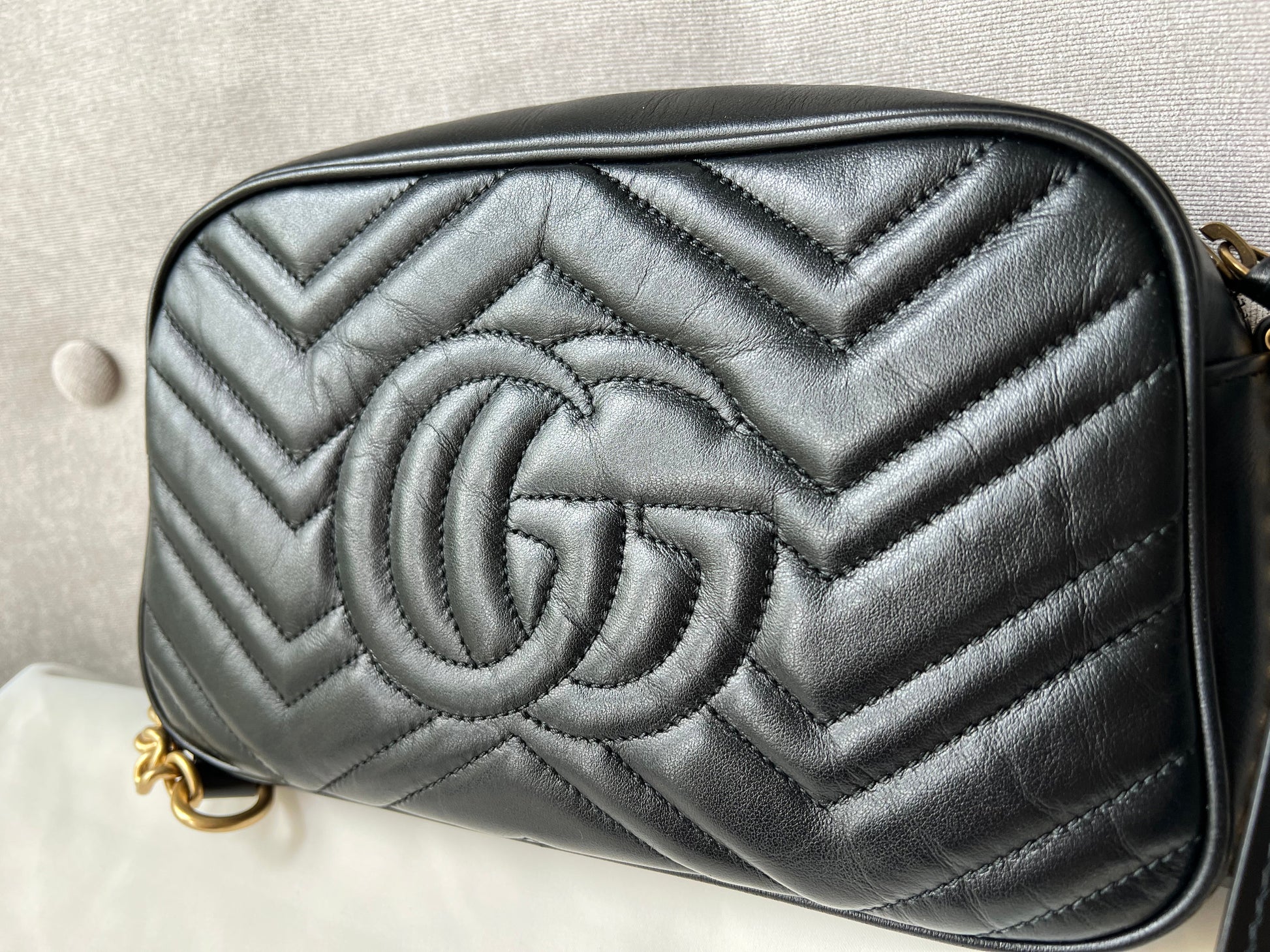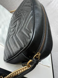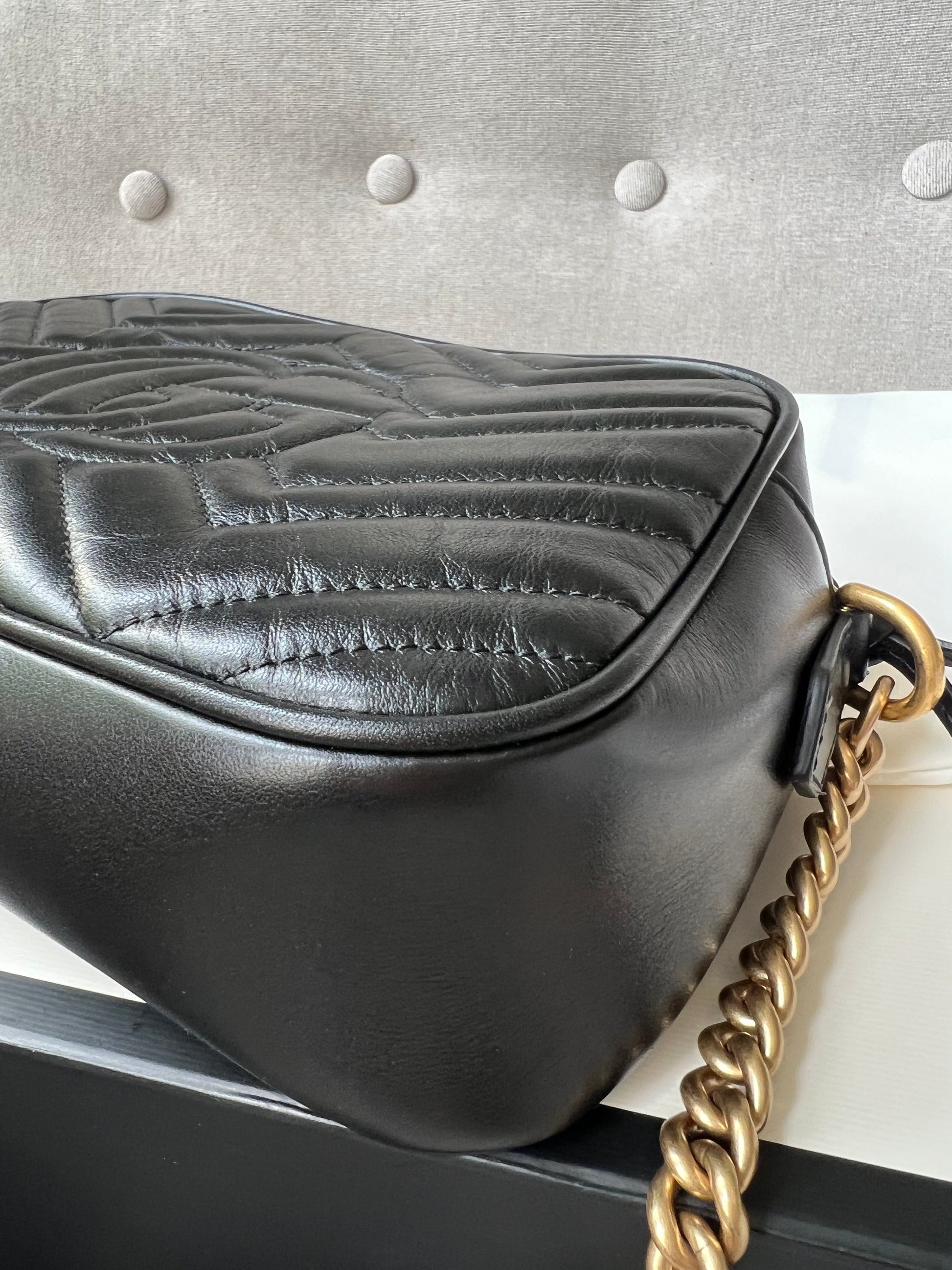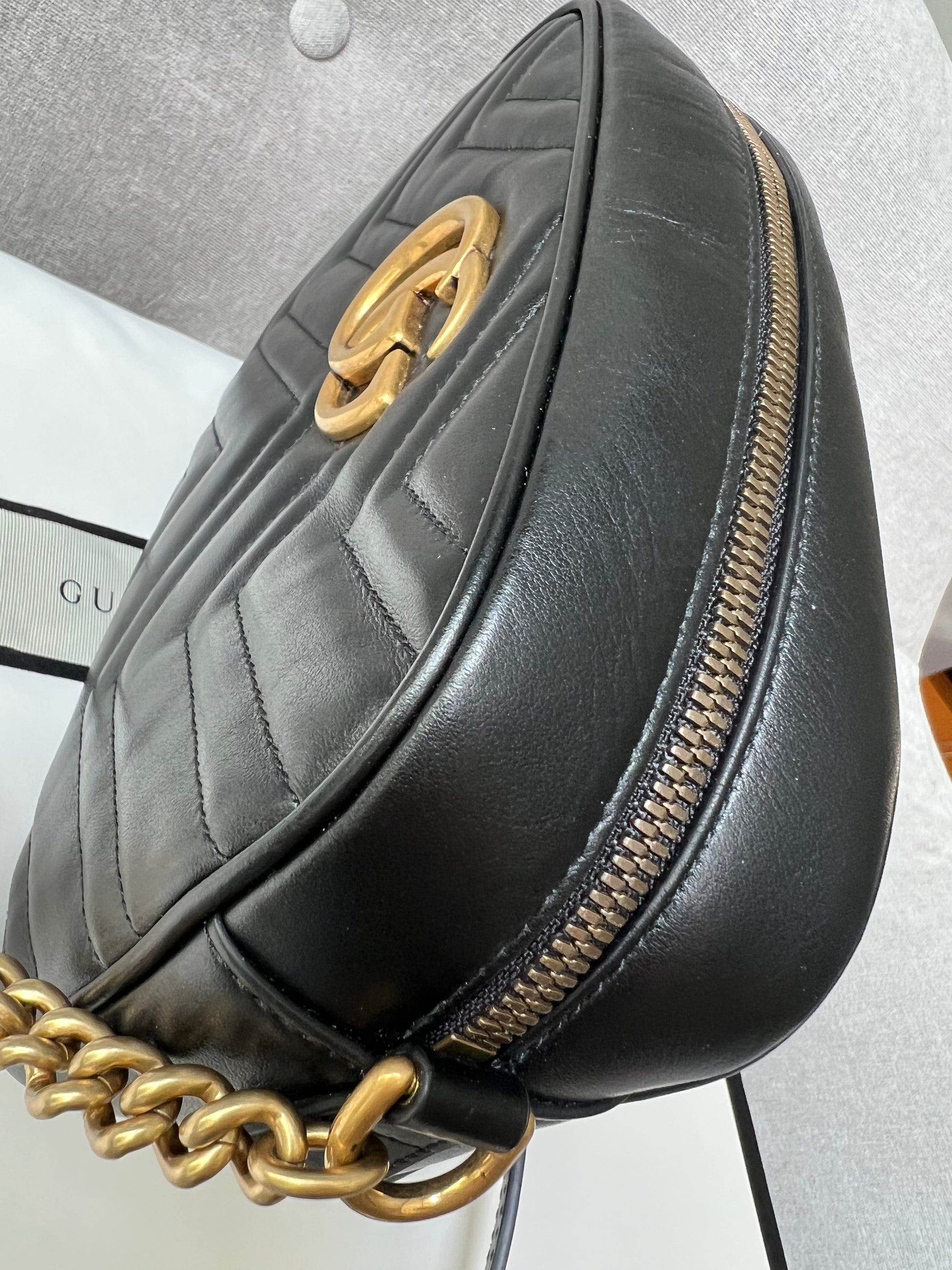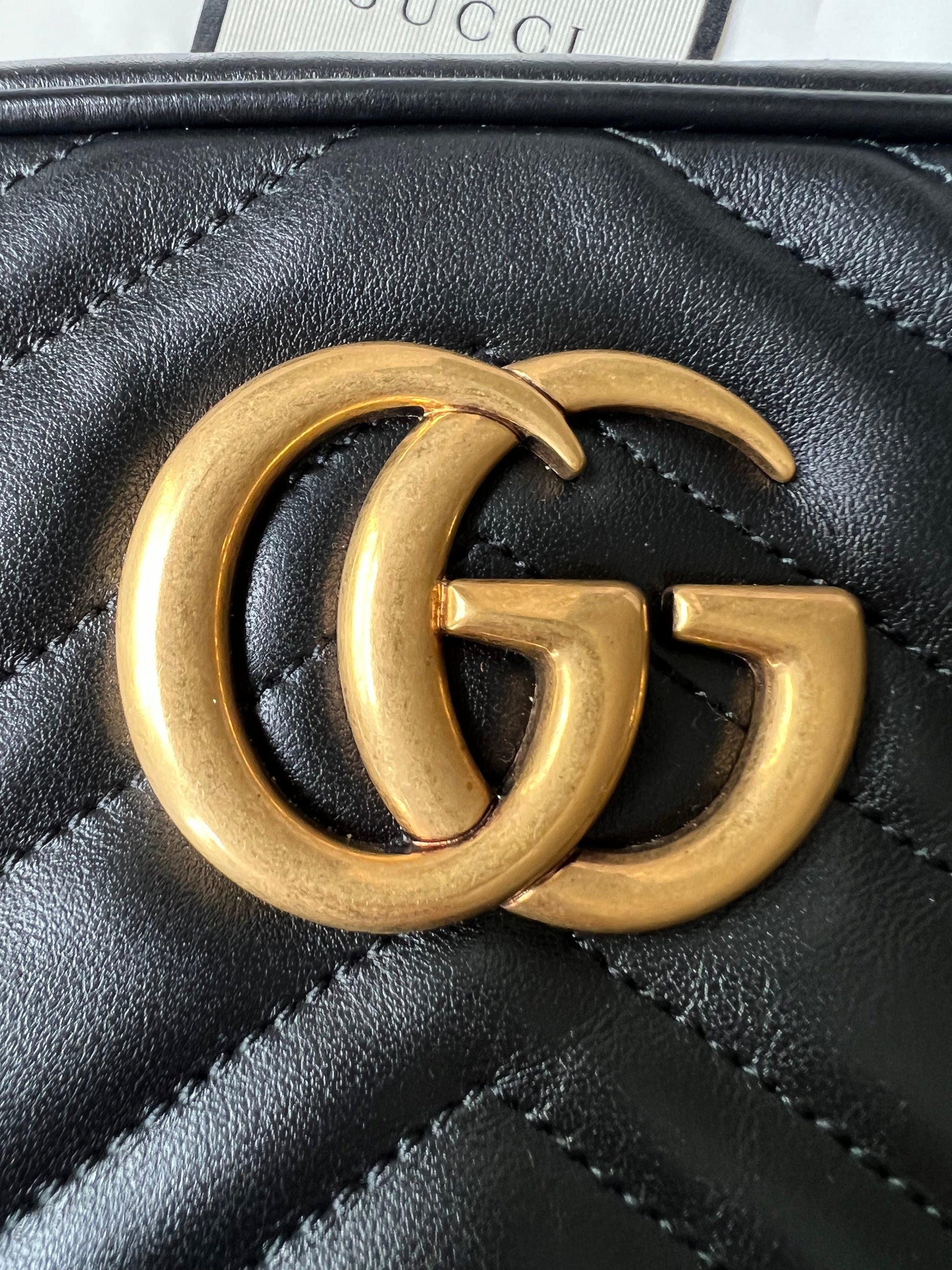 Gucci GG Marmont small shoulder bag in black chevron matelassé leather with gold hardware. This small Marmont chain camera style bag has a softly structured shape and zip top closure. Effortlessly chic and sophisticated, this style can be both with a casual outfit or for evening wear. Suitable for both day to day or occasion wear and ideal for those who prefer a cross body option.