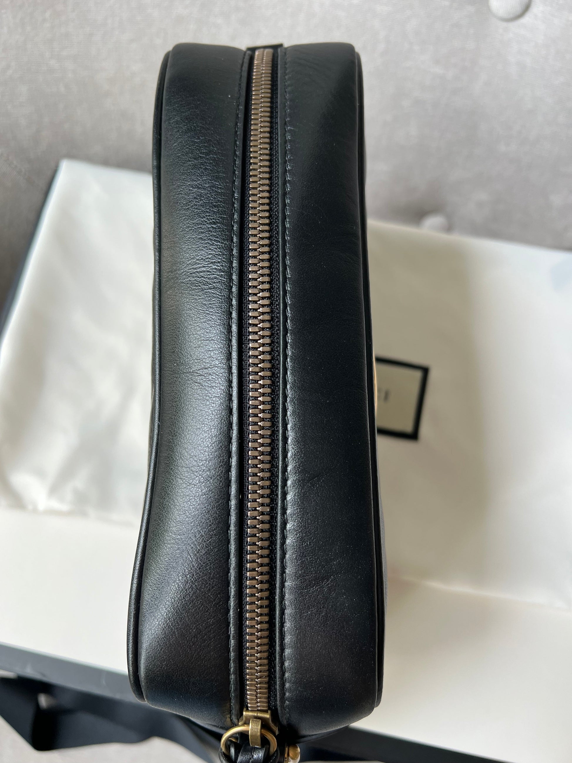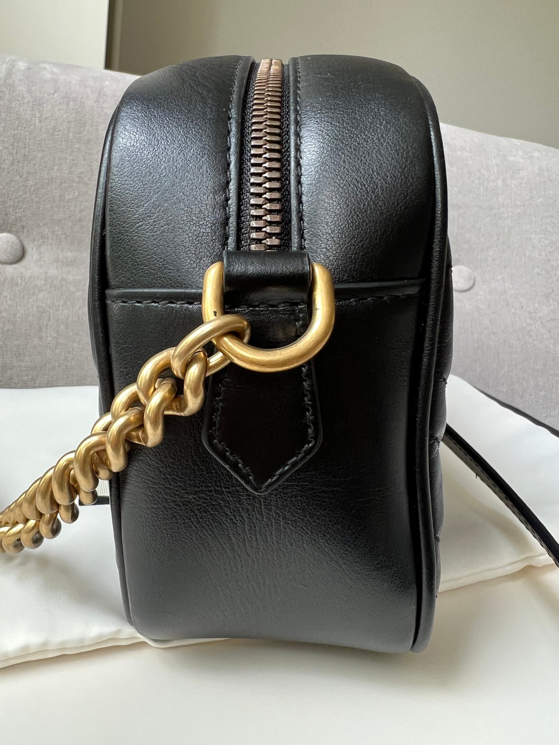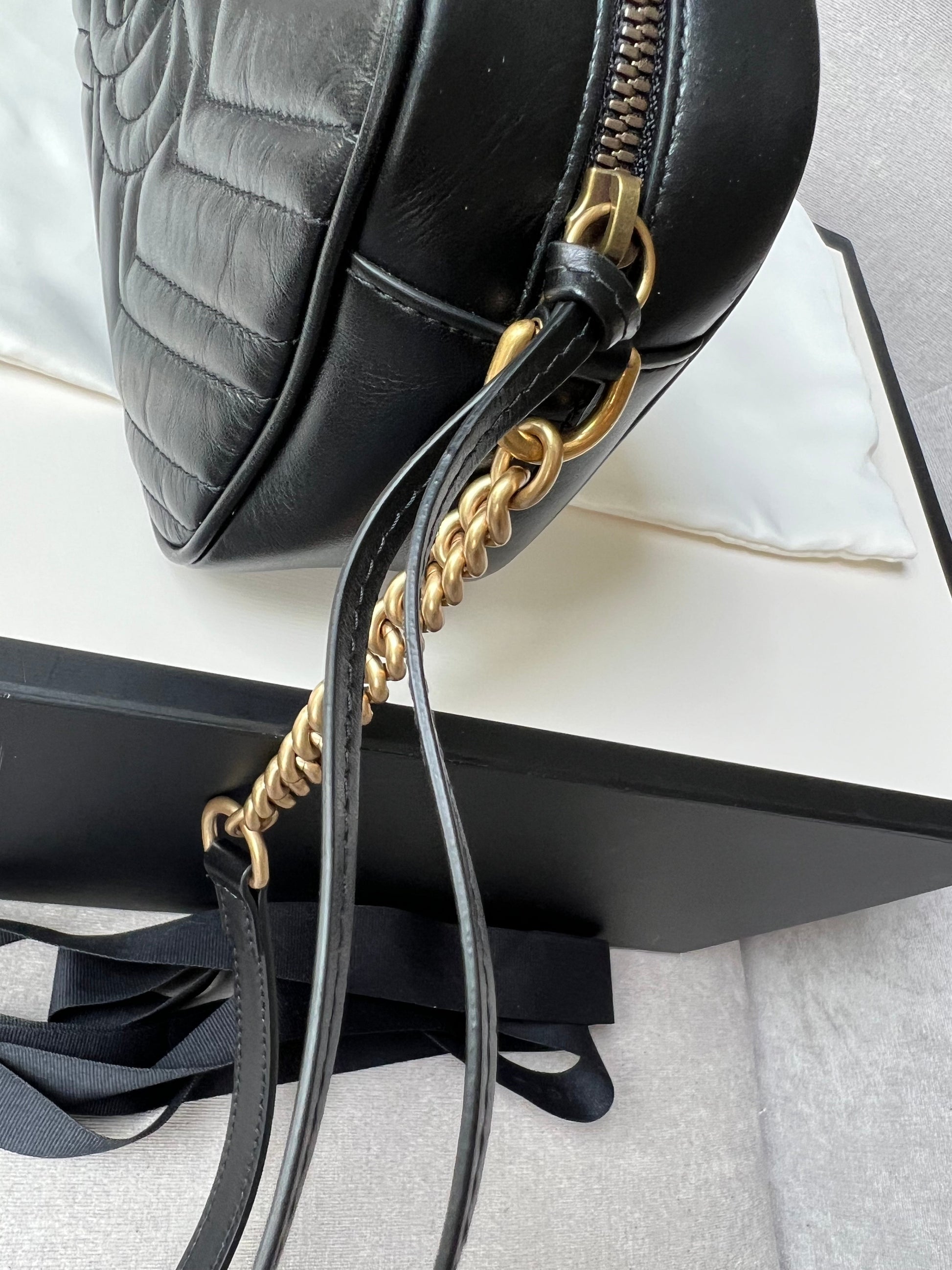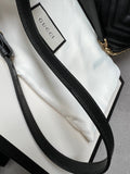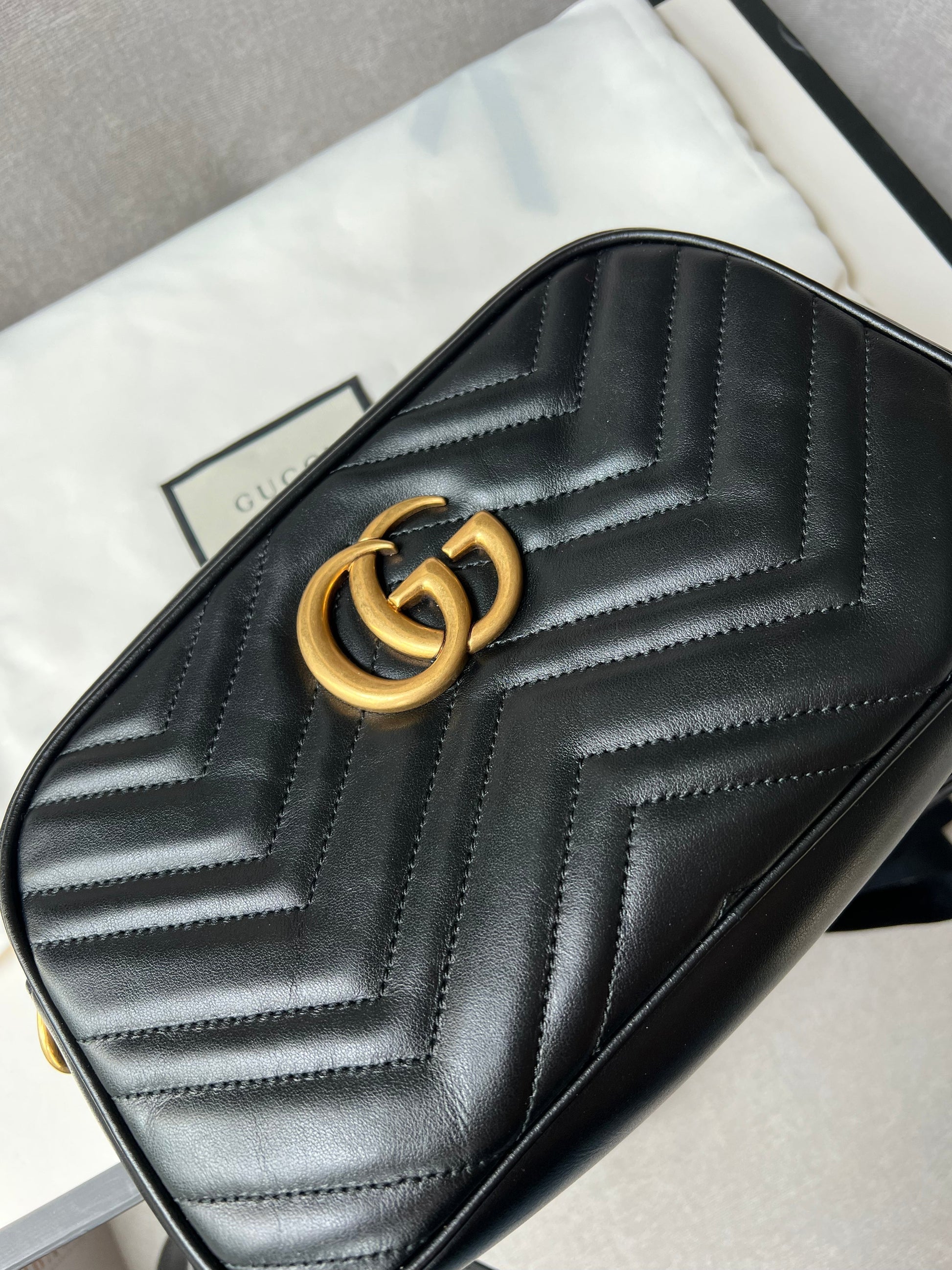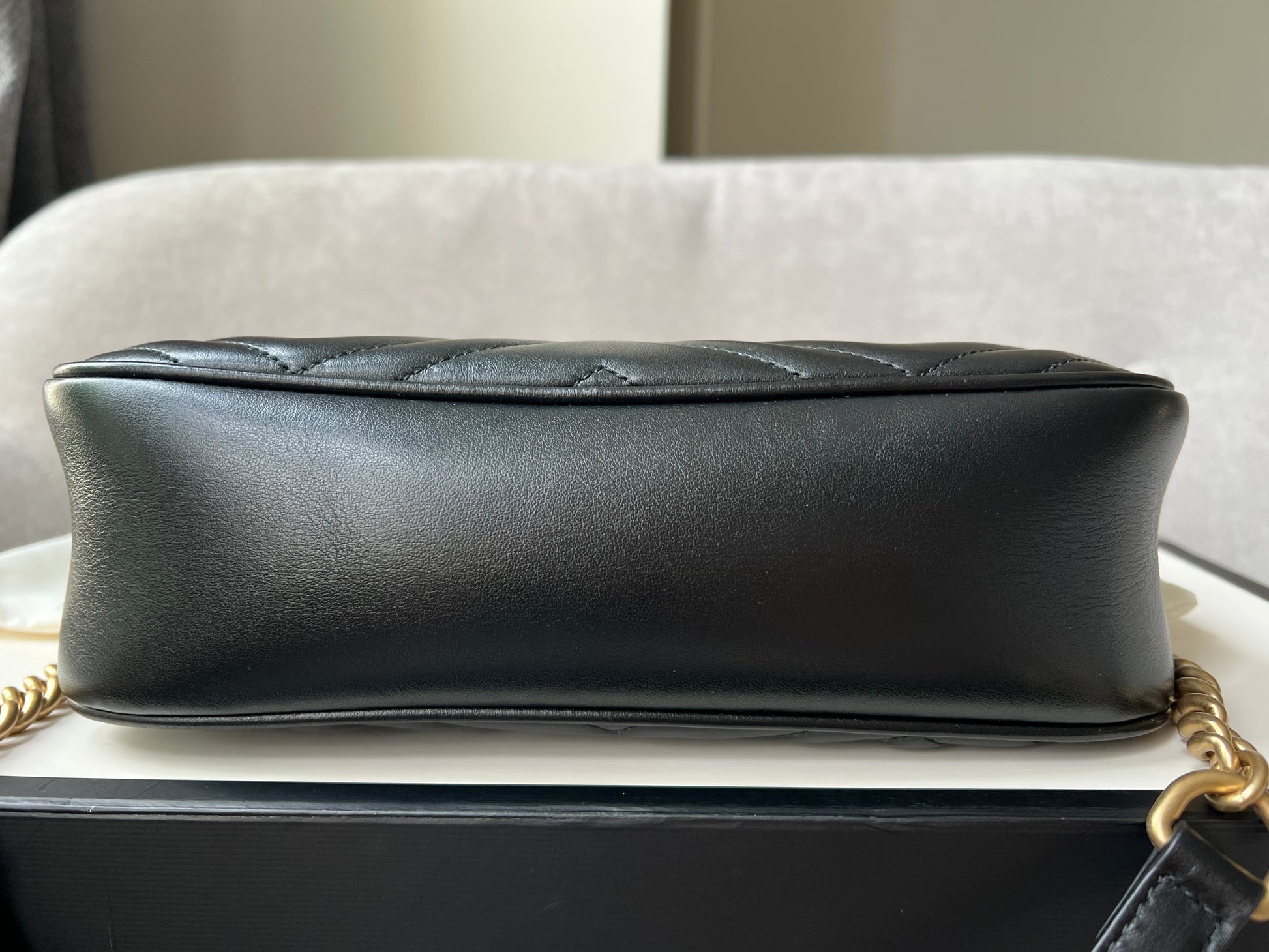 Gucci GG Marmont small shoulder bag in black chevron matelassé leather with gold hardware. This small Marmont chain camera style bag has a softly structured shape and zip top closure. Effortlessly chic and sophisticated, this style can be both with a casual outfit or for evening wear. Suitable for both day to day or occasion wear and ideal for those who prefer a cross body option.