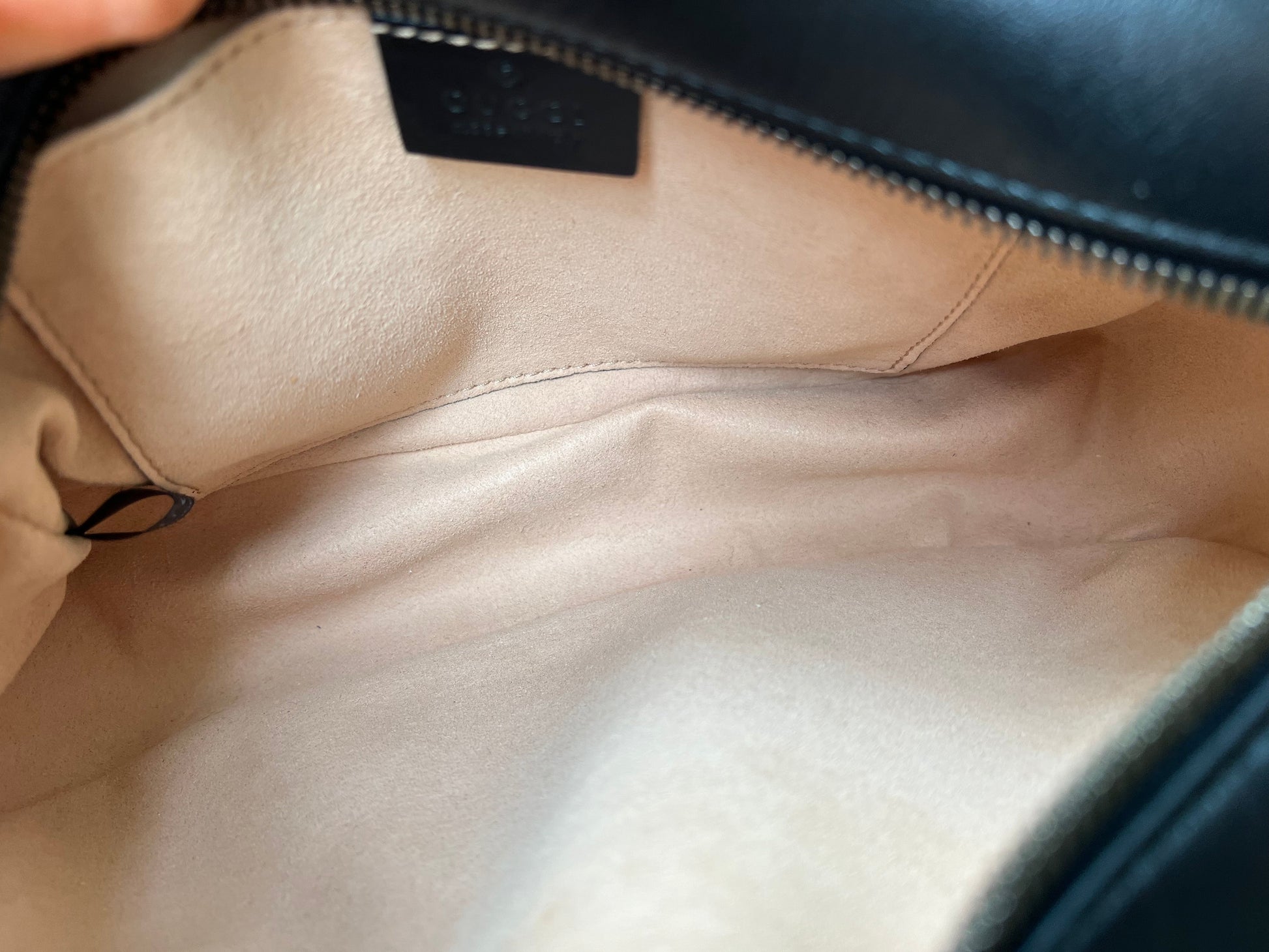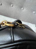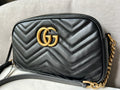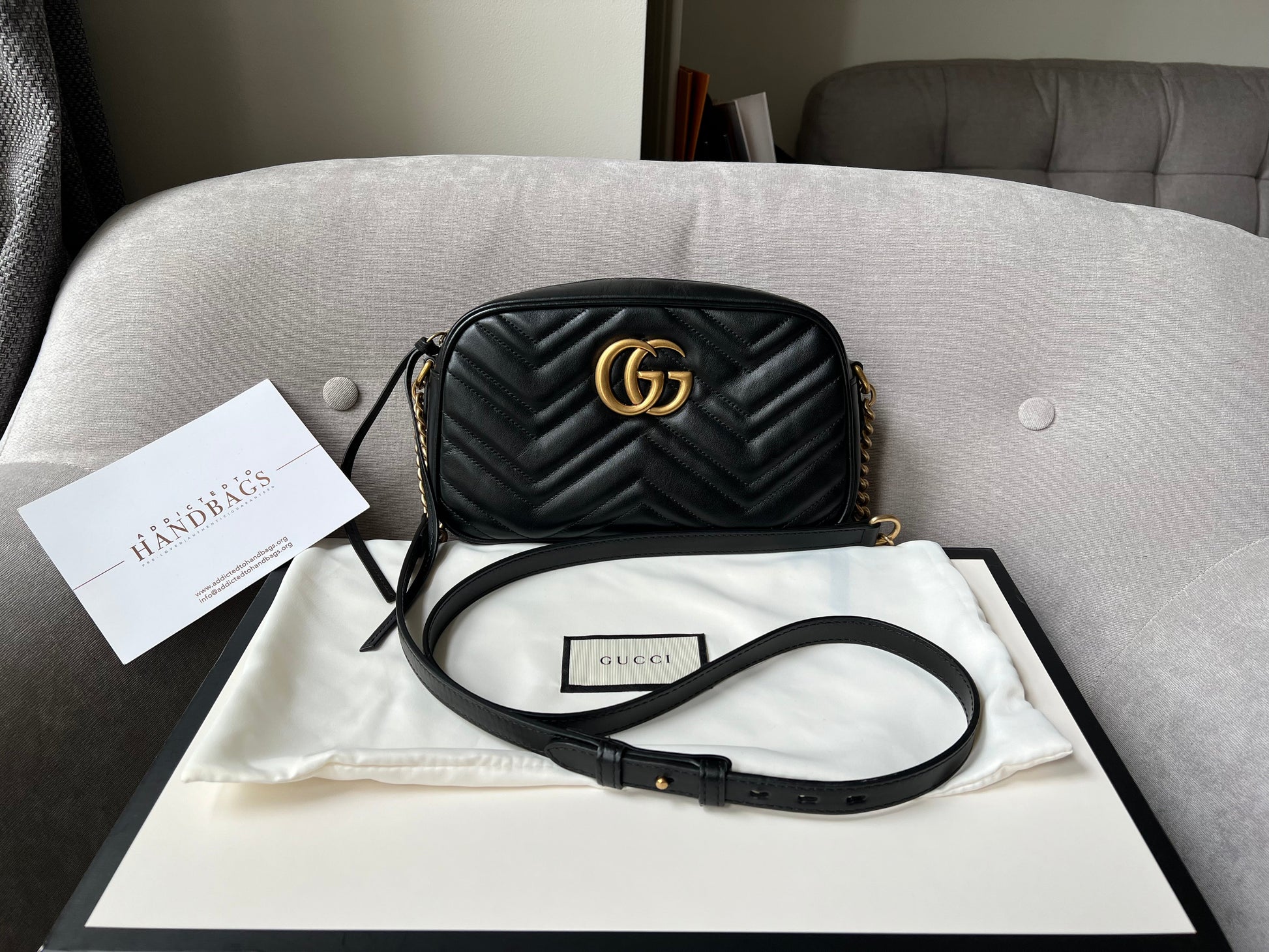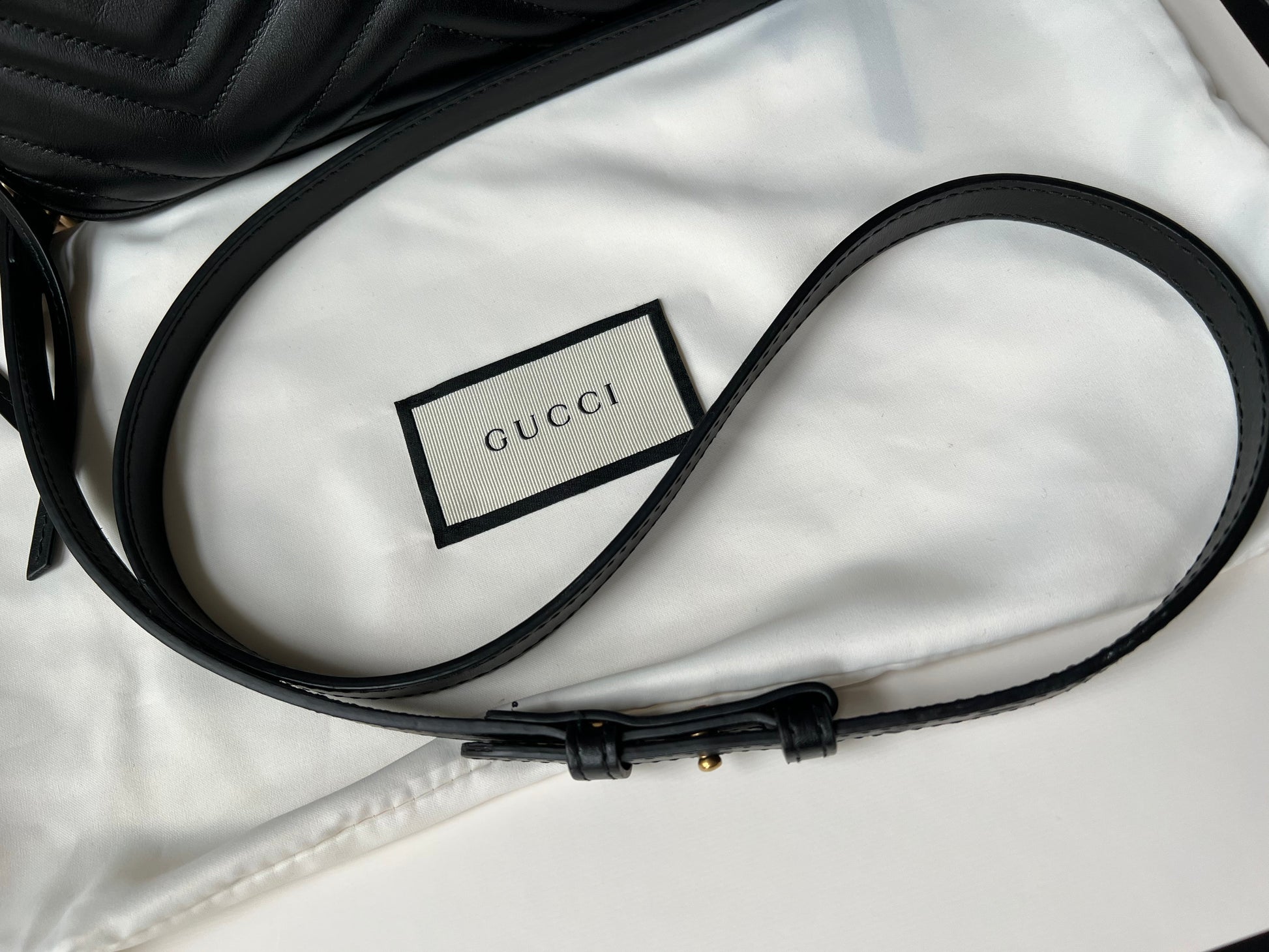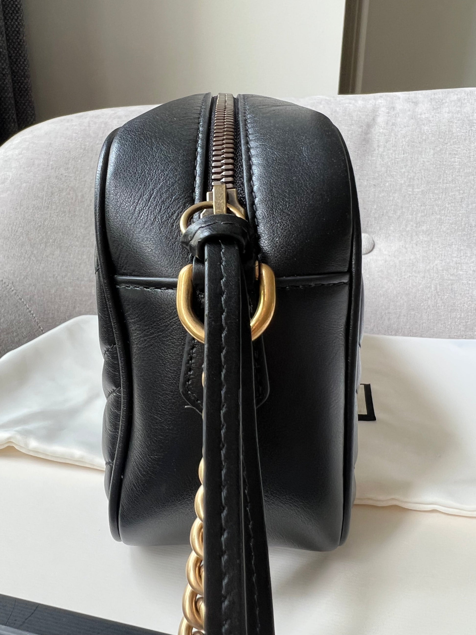 Gucci GG Marmont small shoulder bag in black chevron matelassé leather with gold hardware. This small Marmont chain camera style bag has a softly structured shape and zip top closure. Effortlessly chic and sophisticated, this style can be both with a casual outfit or for evening wear. Suitable for both day to day or occasion wear and ideal for those who prefer a cross body option.
