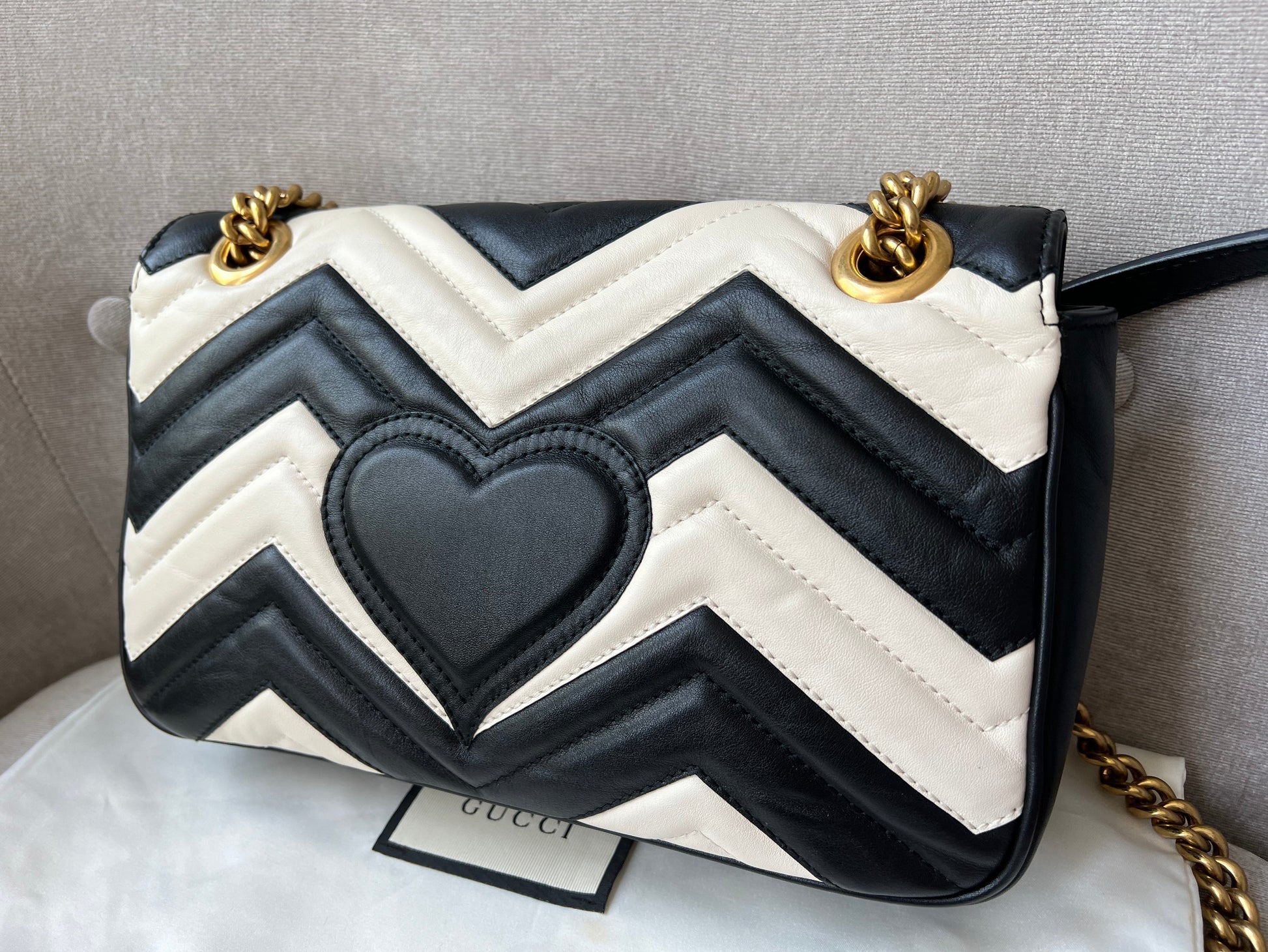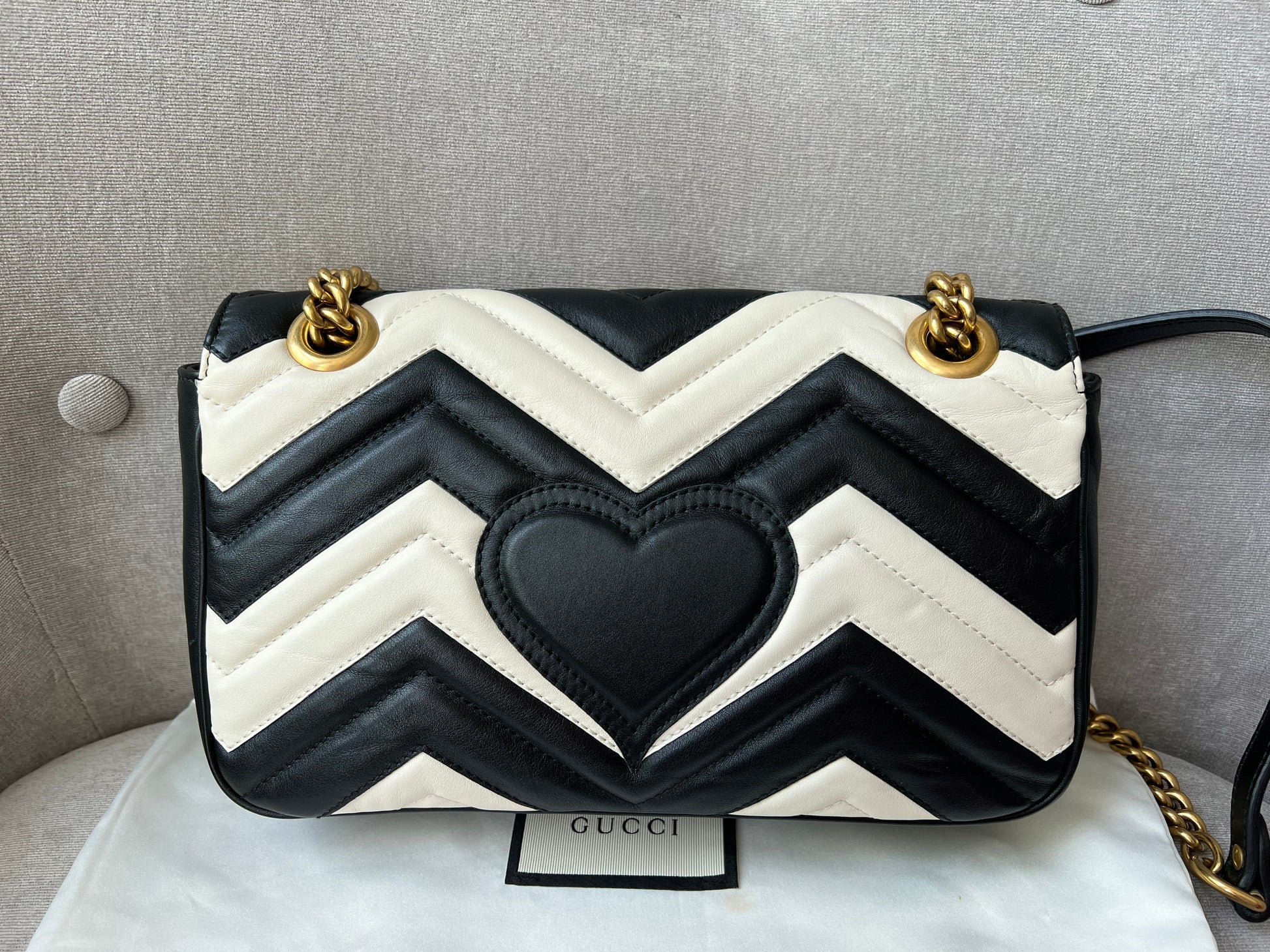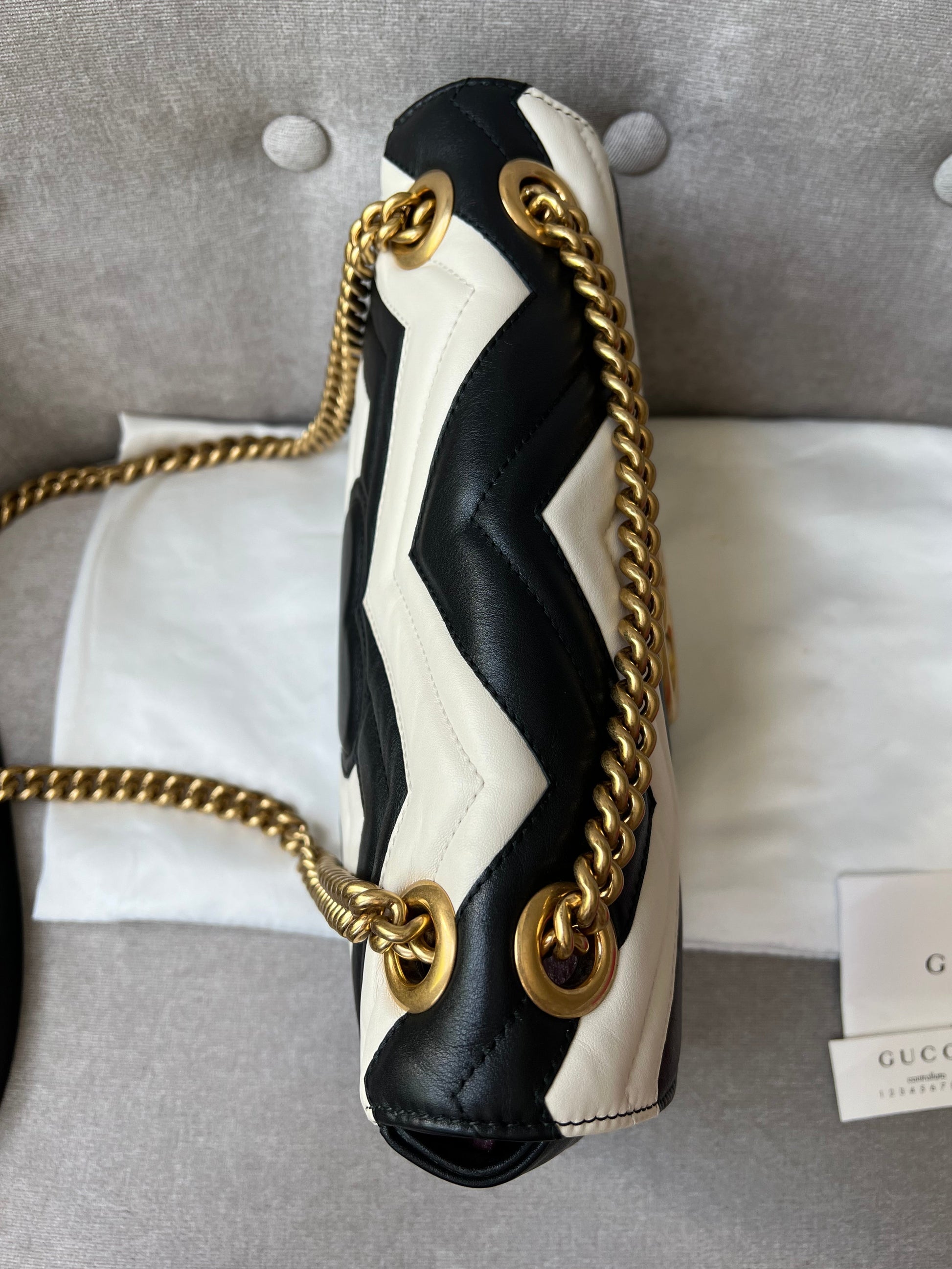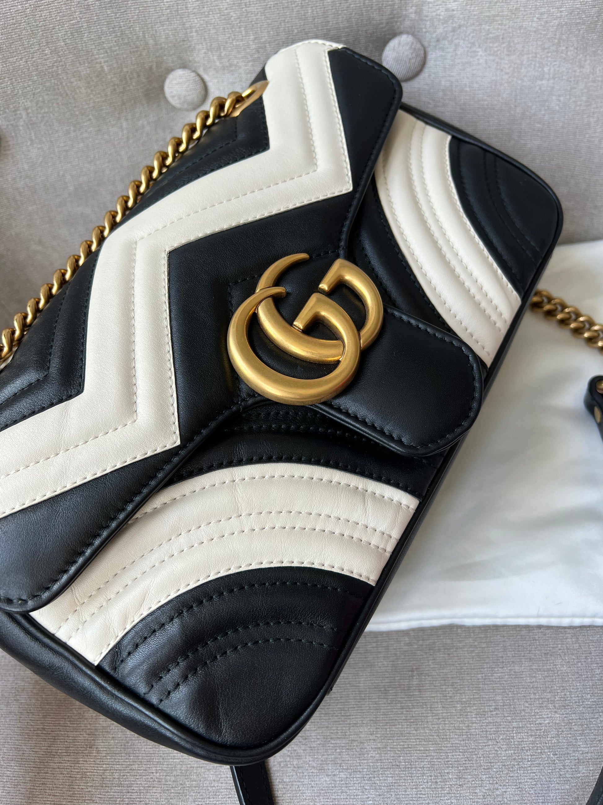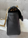 Gucci GG Marmont small shoulder bag in black and white matelasse leather with gold hardware. This small Marmont bag has a softly structured shape and an oversized flap with GG hardware and heart detail on the back. The sliding chain can be multiple ways either doubled up or lengthened. Effortlessly chic and sophisticated, this style can be both with a casual outfit or for evening wear. Suitable for both event or occasion wear and ideal for those who prefer a cross body option. This bicolour Marmont does not come up often . Note images 2 and 3 show black version for size reference.