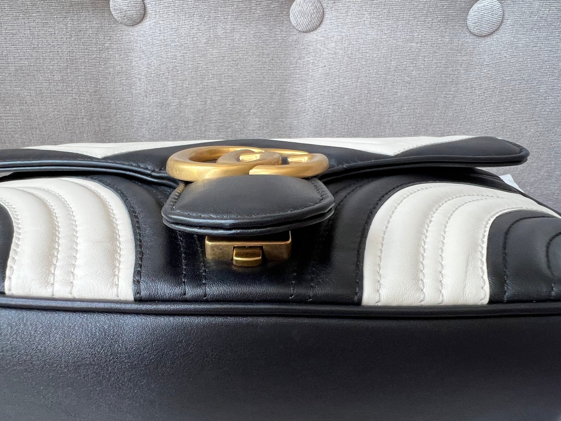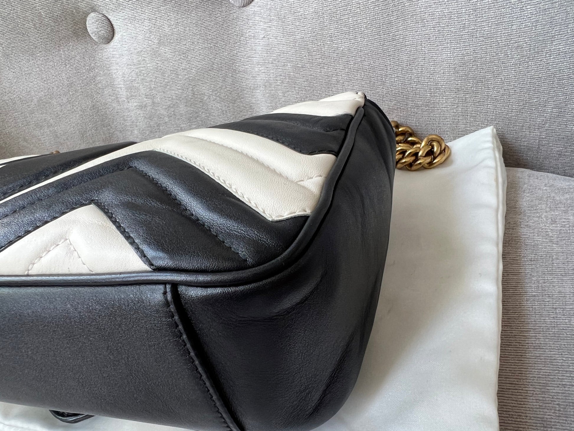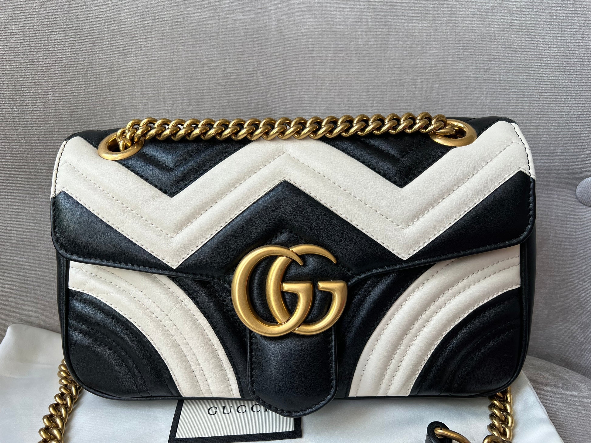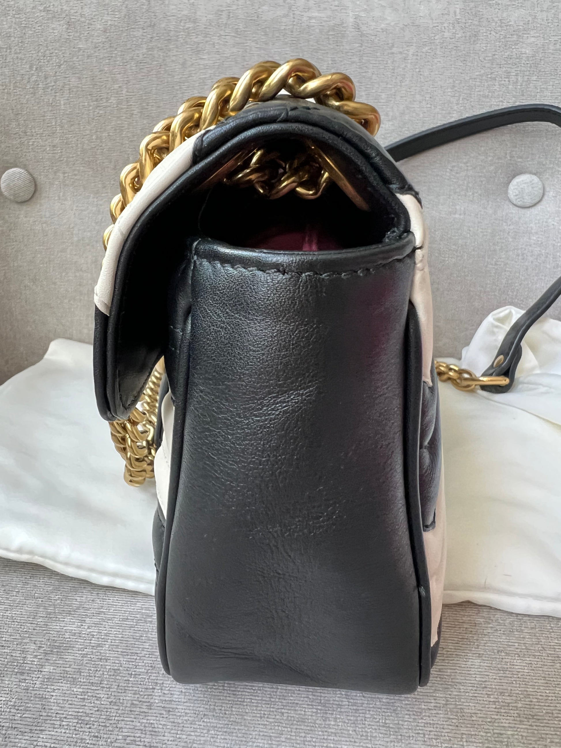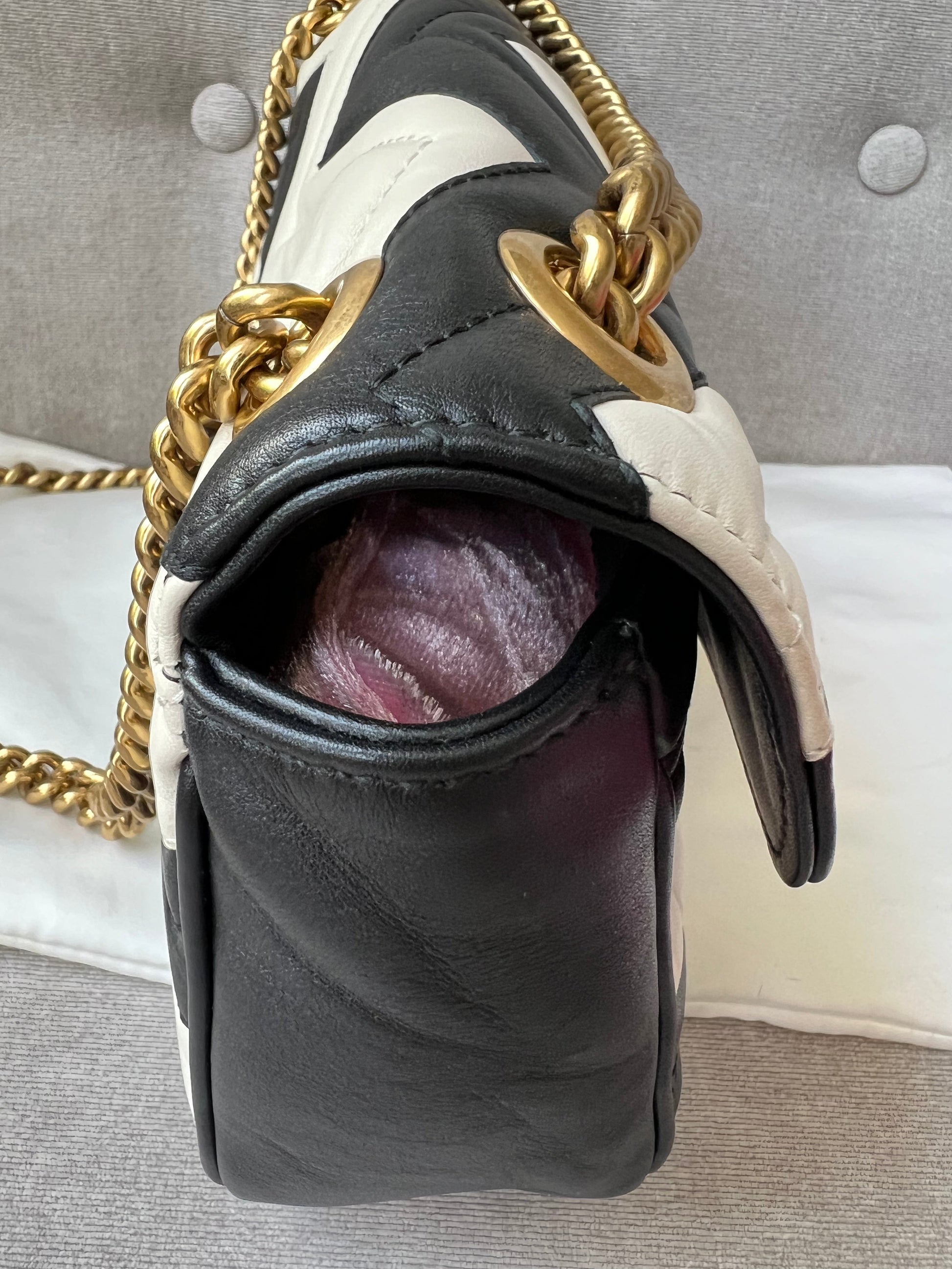 Gucci GG Marmont small shoulder bag in black and white matelasse leather with gold hardware. This small Marmont bag has a softly structured shape and an oversized flap with GG hardware and heart detail on the back. The sliding chain can be multiple ways either doubled up or lengthened. Effortlessly chic and sophisticated, this style can be both with a casual outfit or for evening wear. Suitable for both event or occasion wear and ideal for those who prefer a cross body option. This bicolour Marmont does not come up often . Note images 2 and 3 show black version for size reference.