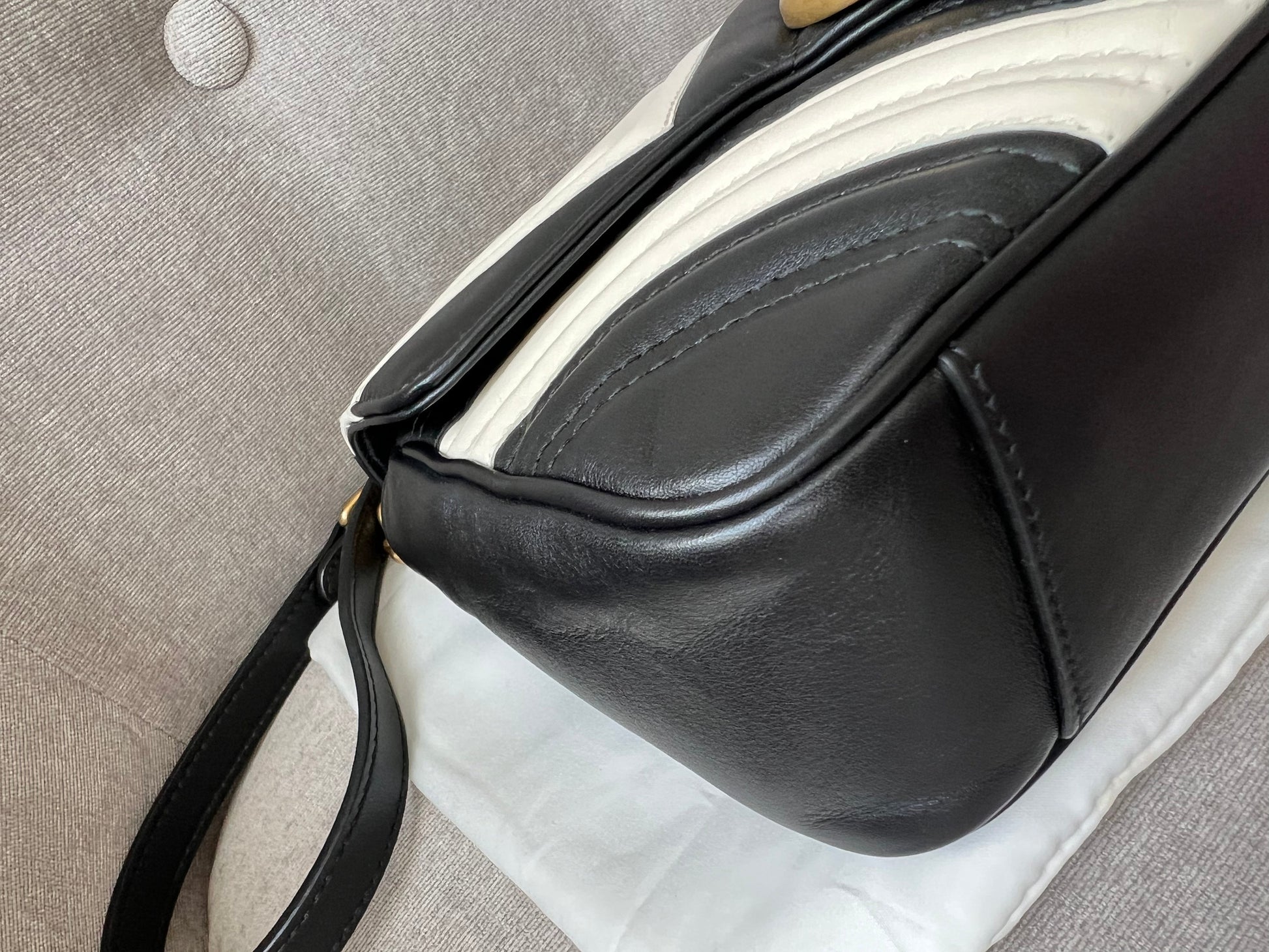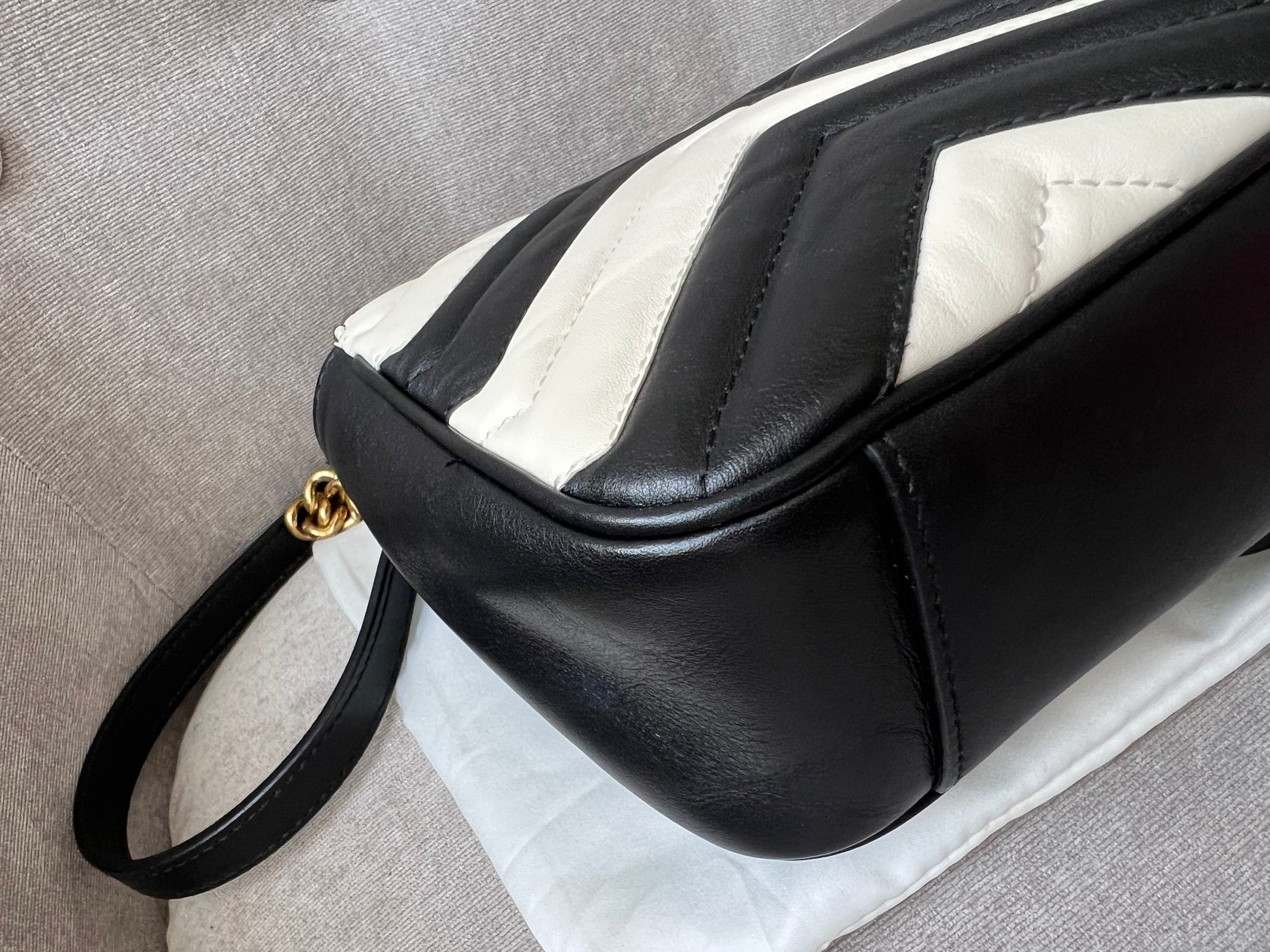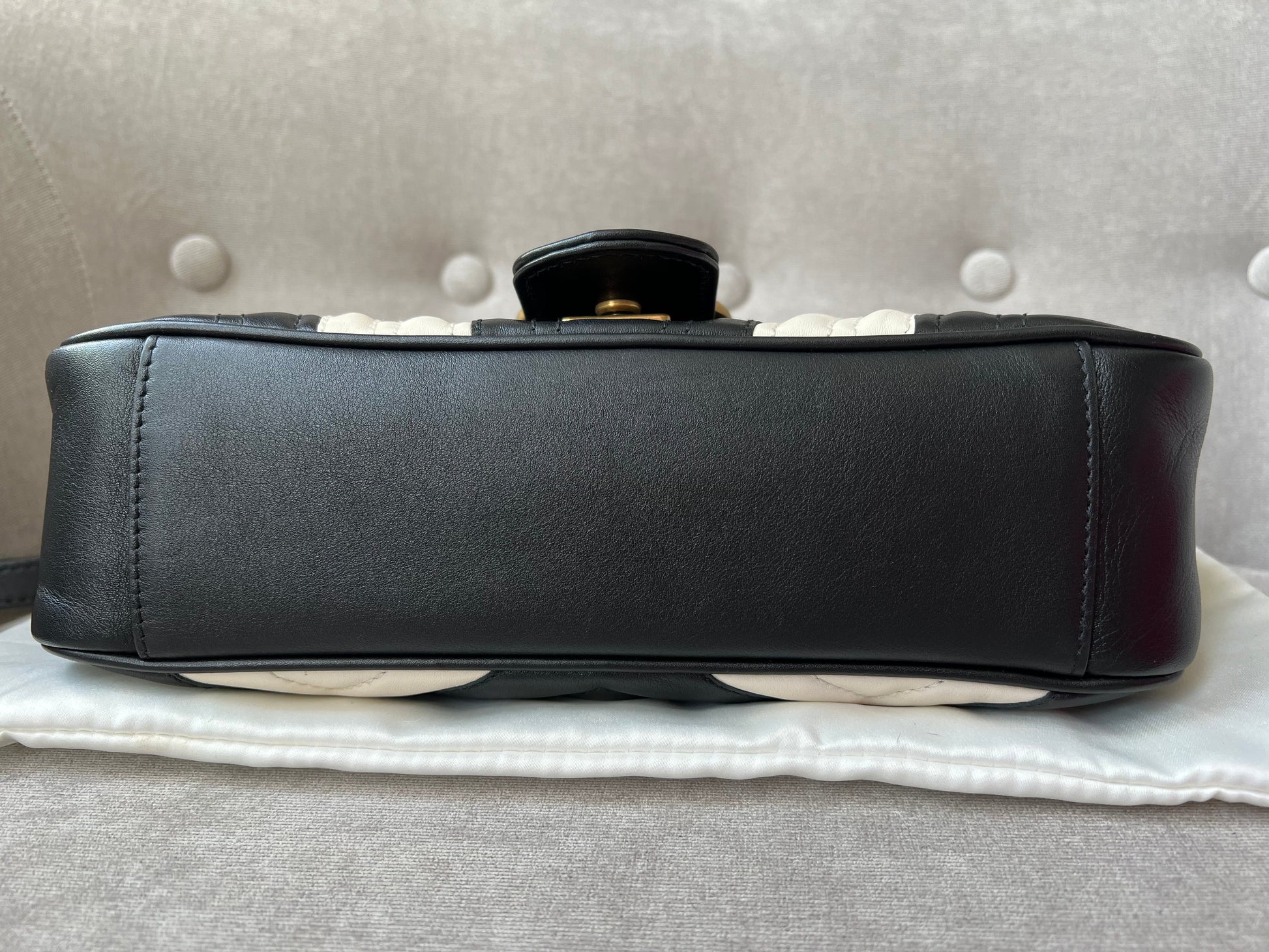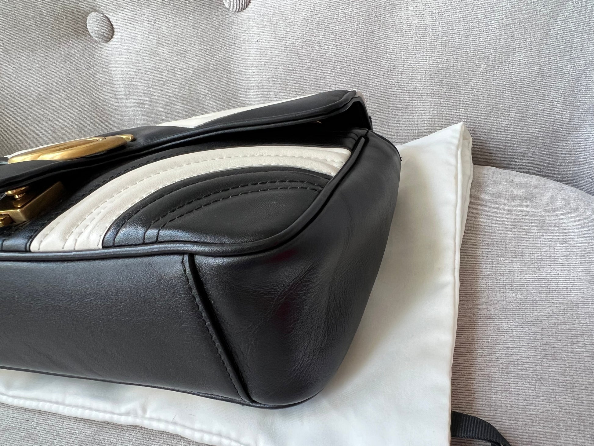 Gucci GG Marmont small shoulder bag in black and white matelasse leather with gold hardware. This small Marmont bag has a softly structured shape and an oversized flap with GG hardware and heart detail on the back. The sliding chain can be multiple ways either doubled up or lengthened. Effortlessly chic and sophisticated, this style can be both with a casual outfit or for evening wear. Suitable for both event or occasion wear and ideal for those who prefer a cross body option. This bicolour Marmont does not come up often . Note images 2 and 3 show black version for size reference.