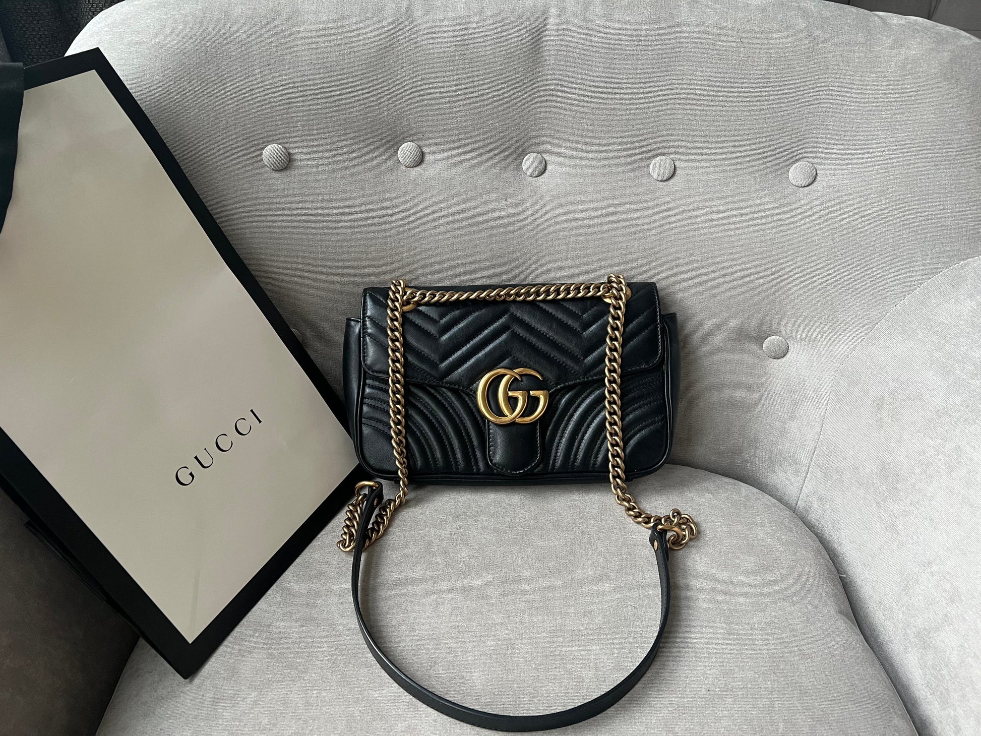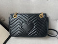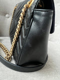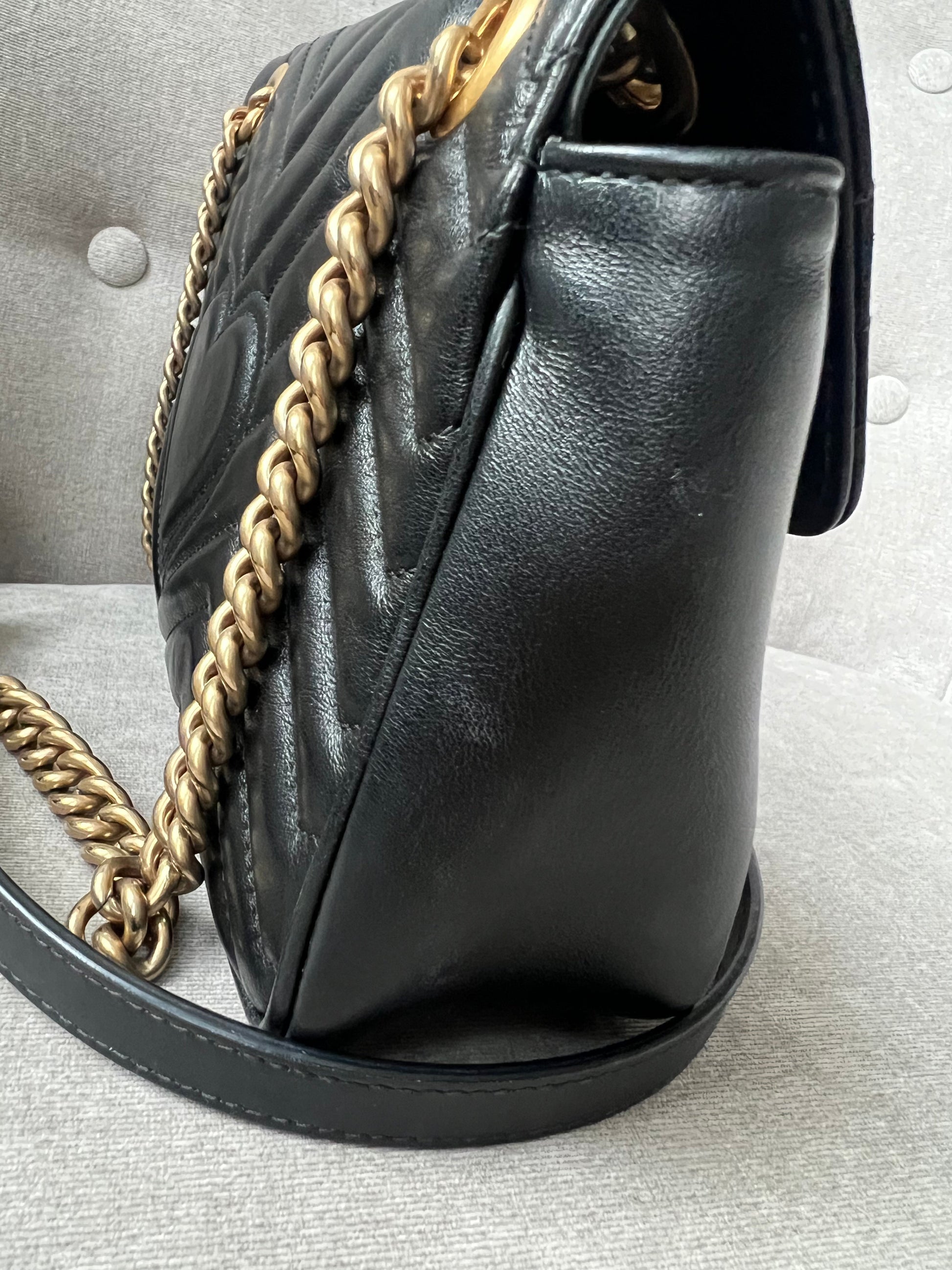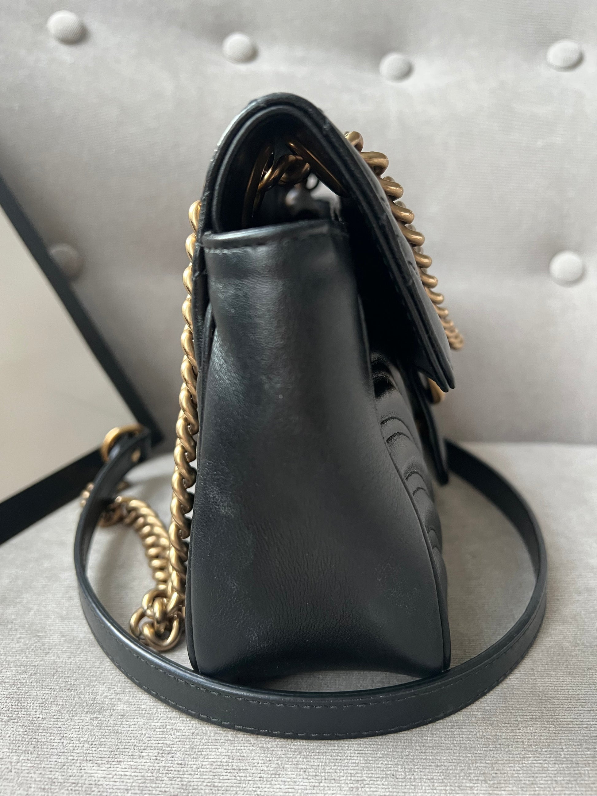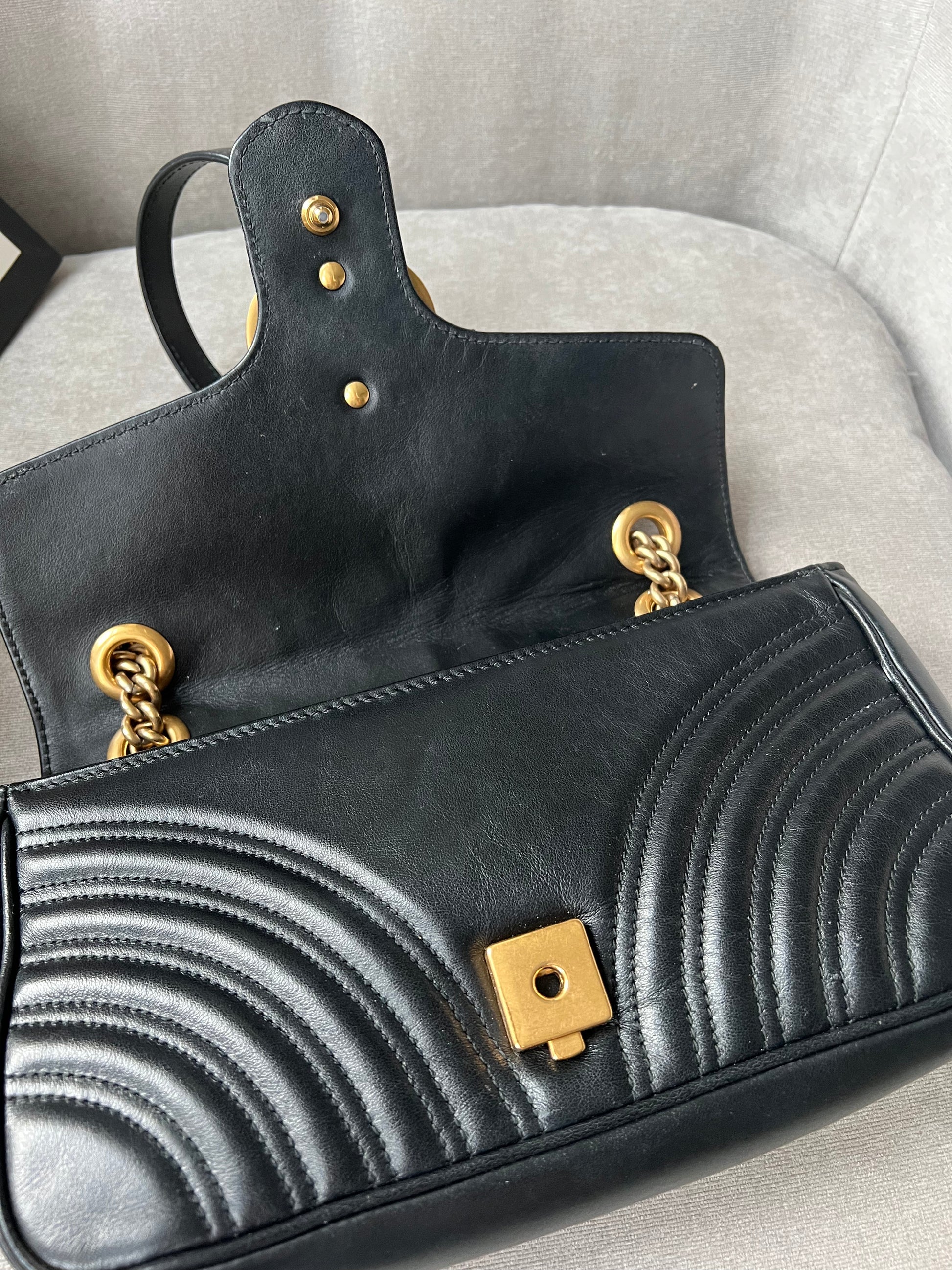 Gucci GG Marmont small shoulder bag in black matelasse leather with gold hardware. This small Marmont bag has a softly structured shape and an oversized flap with GG hardware and heart detail on the back. The sliding chain can be multiple ways either doubled up or lengthened. Effortlessly chic and sophisticated, this style can be both with a casual outfit or for evening wear. Suitable for both event or occasion wear and ideal for those who prefer a cross body option.