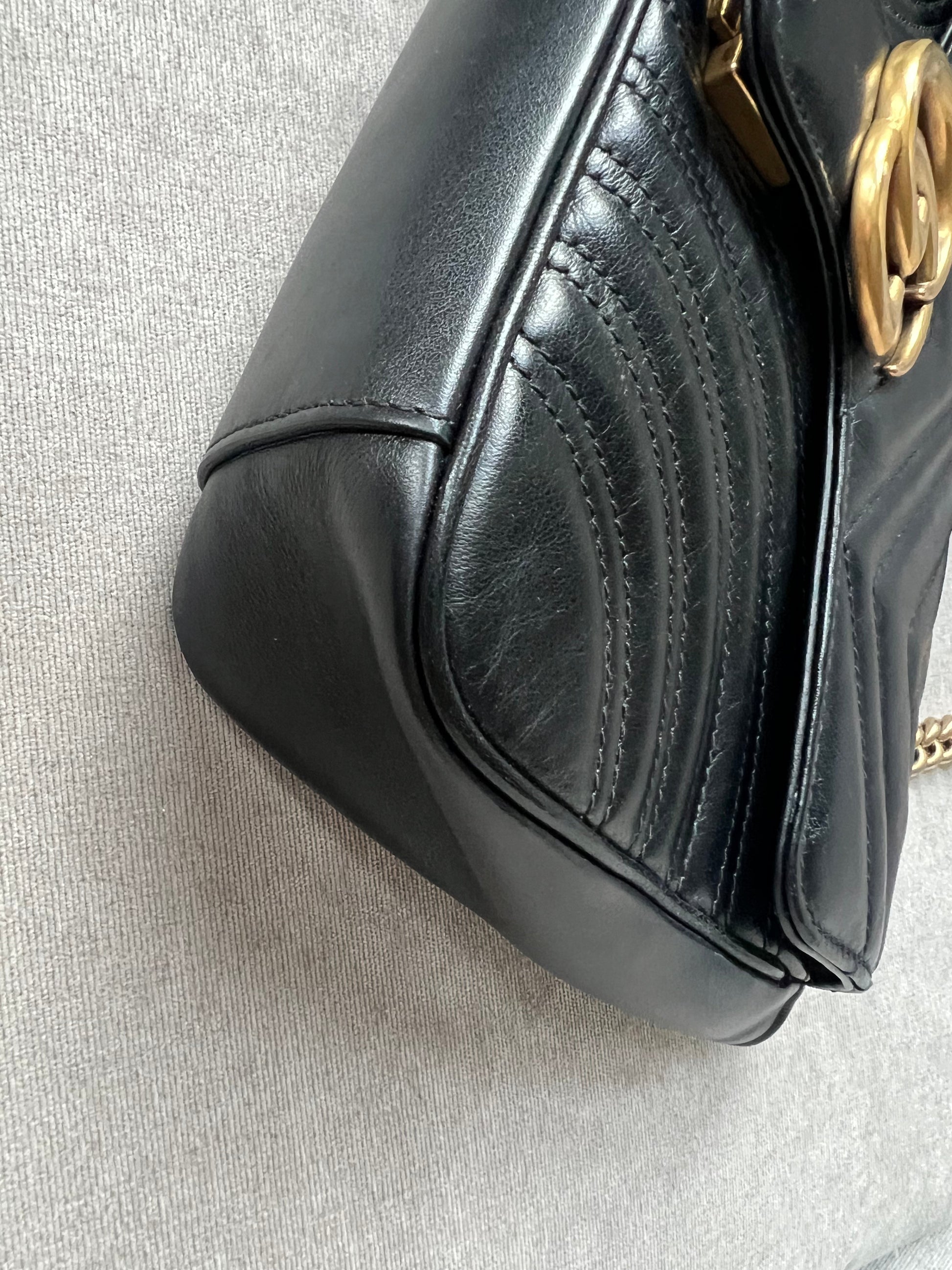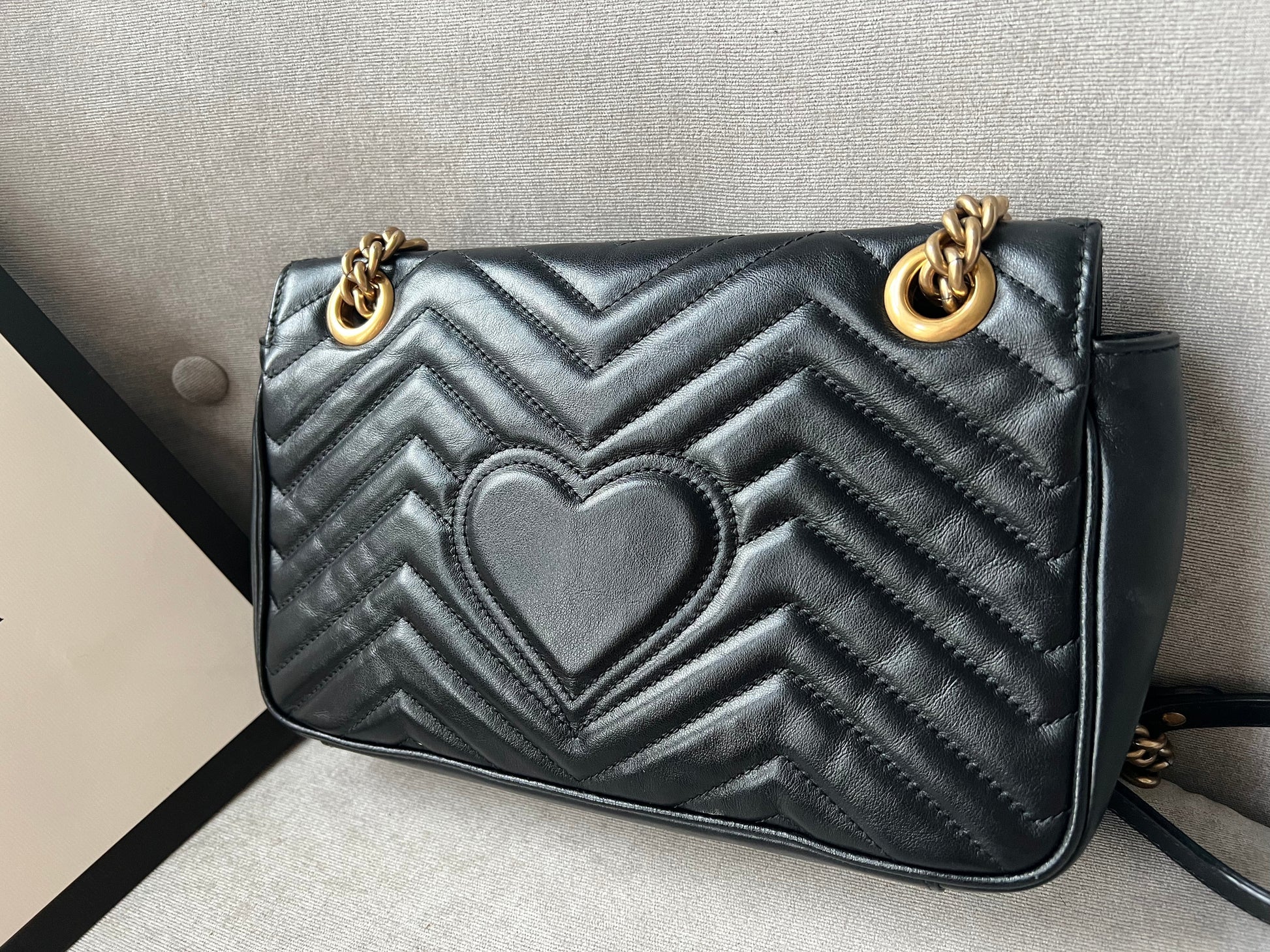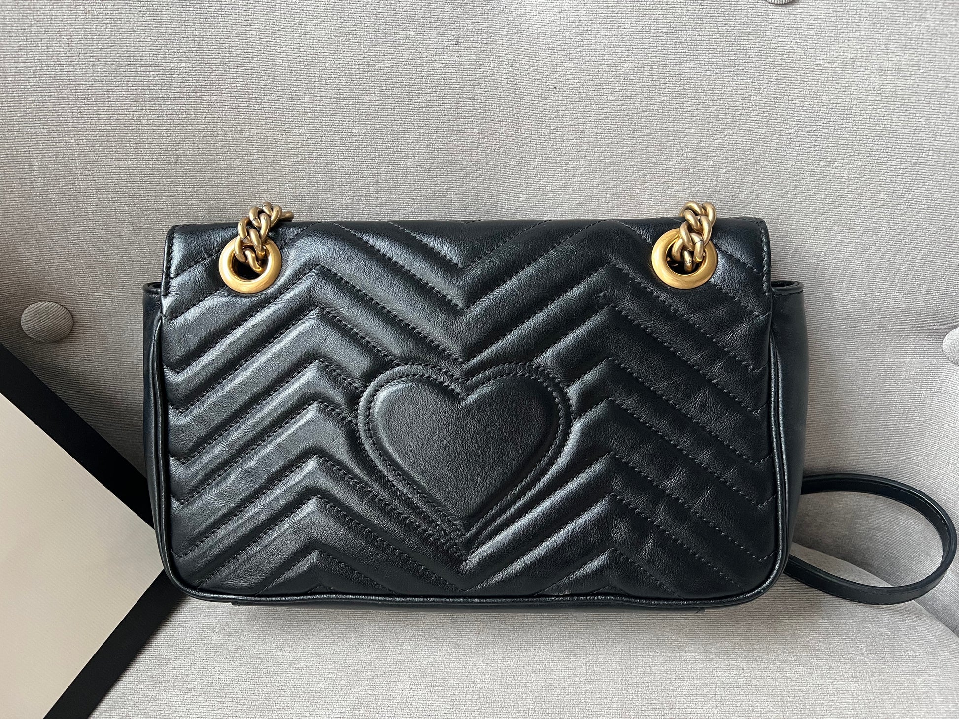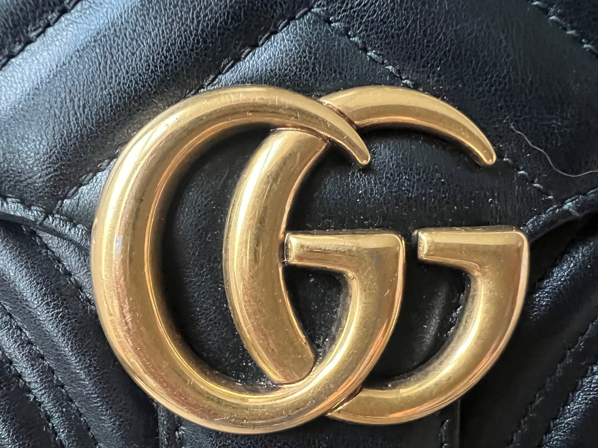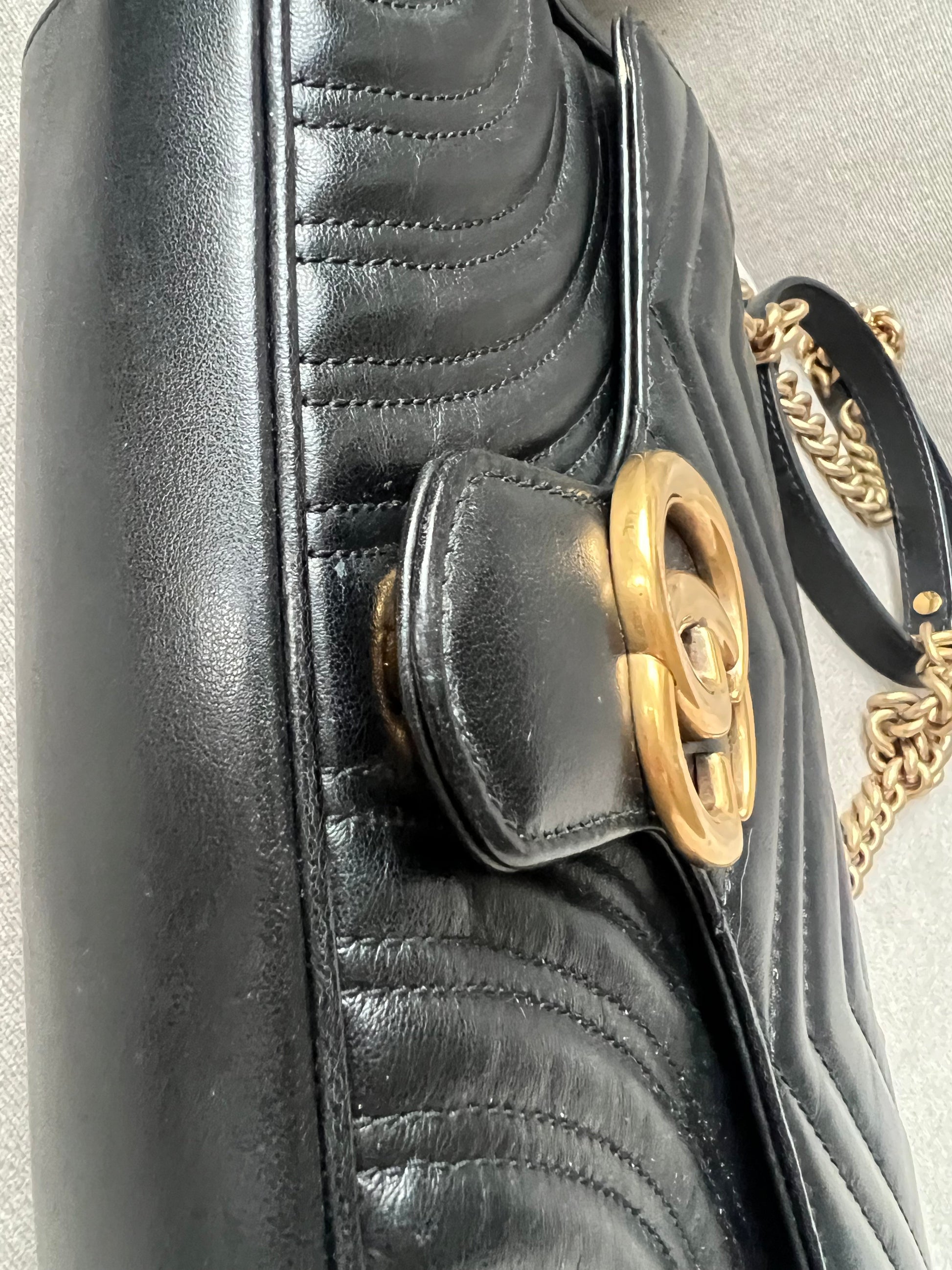 Gucci GG Marmont small shoulder bag in black matelasse leather with gold hardware. This small Marmont bag has a softly structured shape and an oversized flap with GG hardware and heart detail on the back. The sliding chain can be multiple ways either doubled up or lengthened. Effortlessly chic and sophisticated, this style can be both with a casual outfit or for evening wear. Suitable for both event or occasion wear and ideal for those who prefer a cross body option.