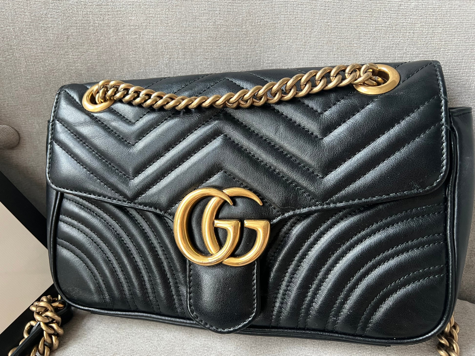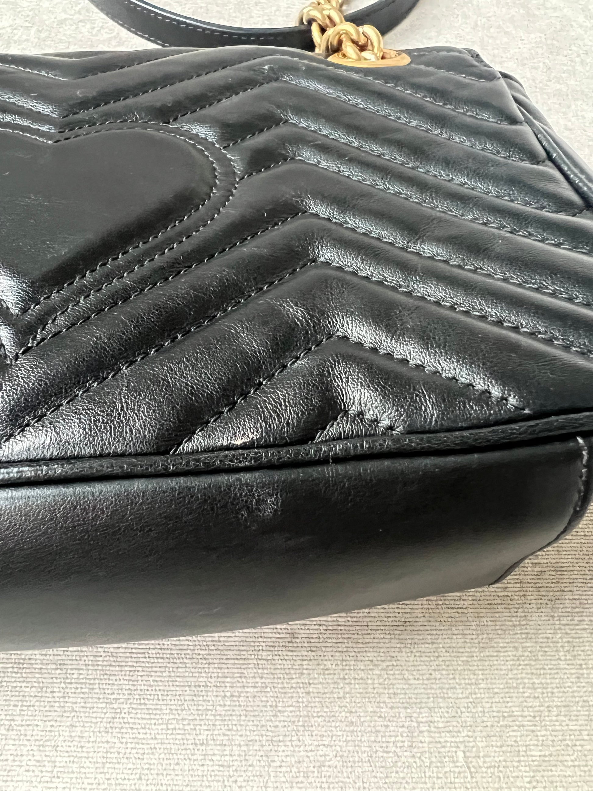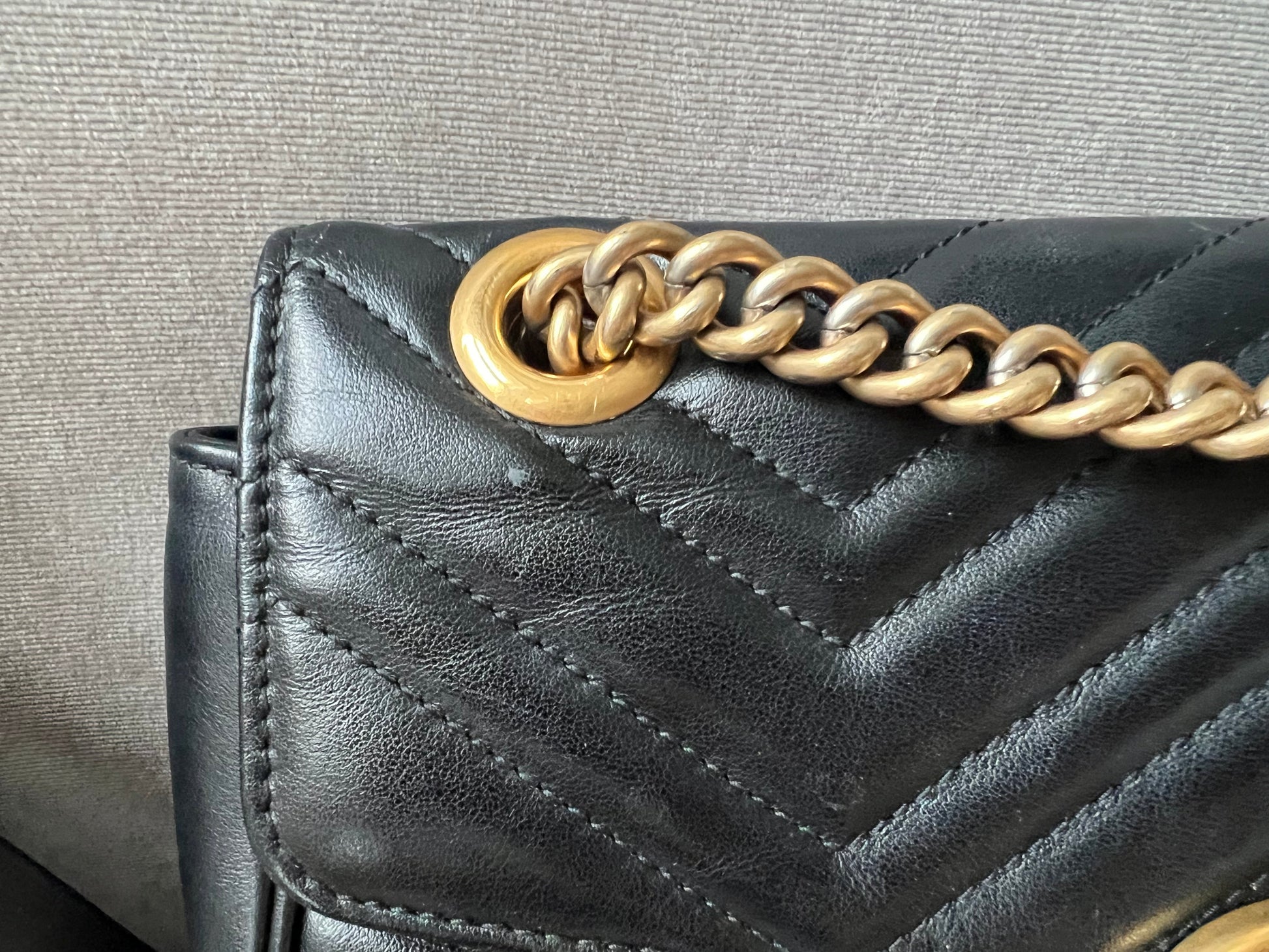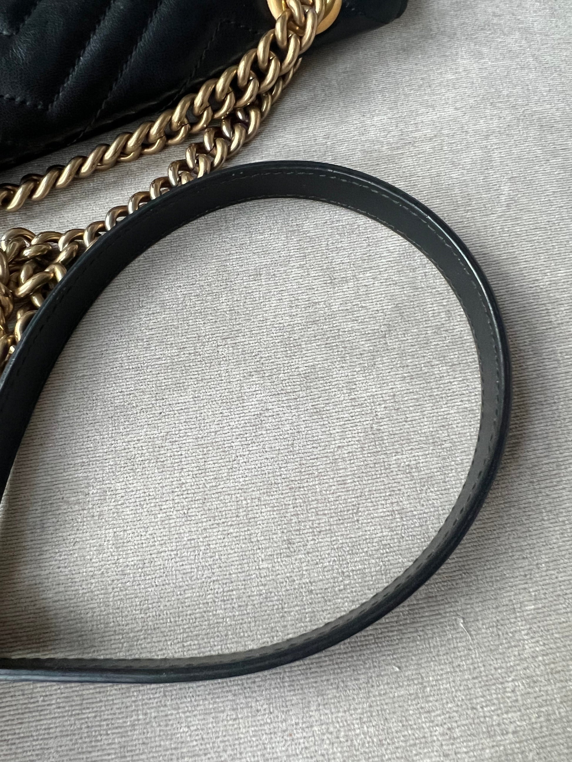 Gucci GG Marmont small shoulder bag in black matelasse leather with gold hardware. This small Marmont bag has a softly structured shape and an oversized flap with GG hardware and heart detail on the back. The sliding chain can be multiple ways either doubled up or lengthened. Effortlessly chic and sophisticated, this style can be both with a casual outfit or for evening wear. Suitable for both event or occasion wear and ideal for those who prefer a cross body option.