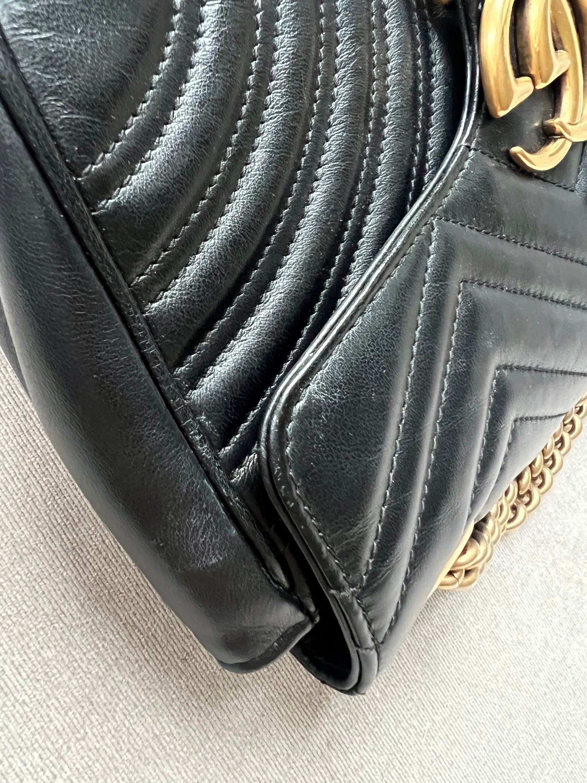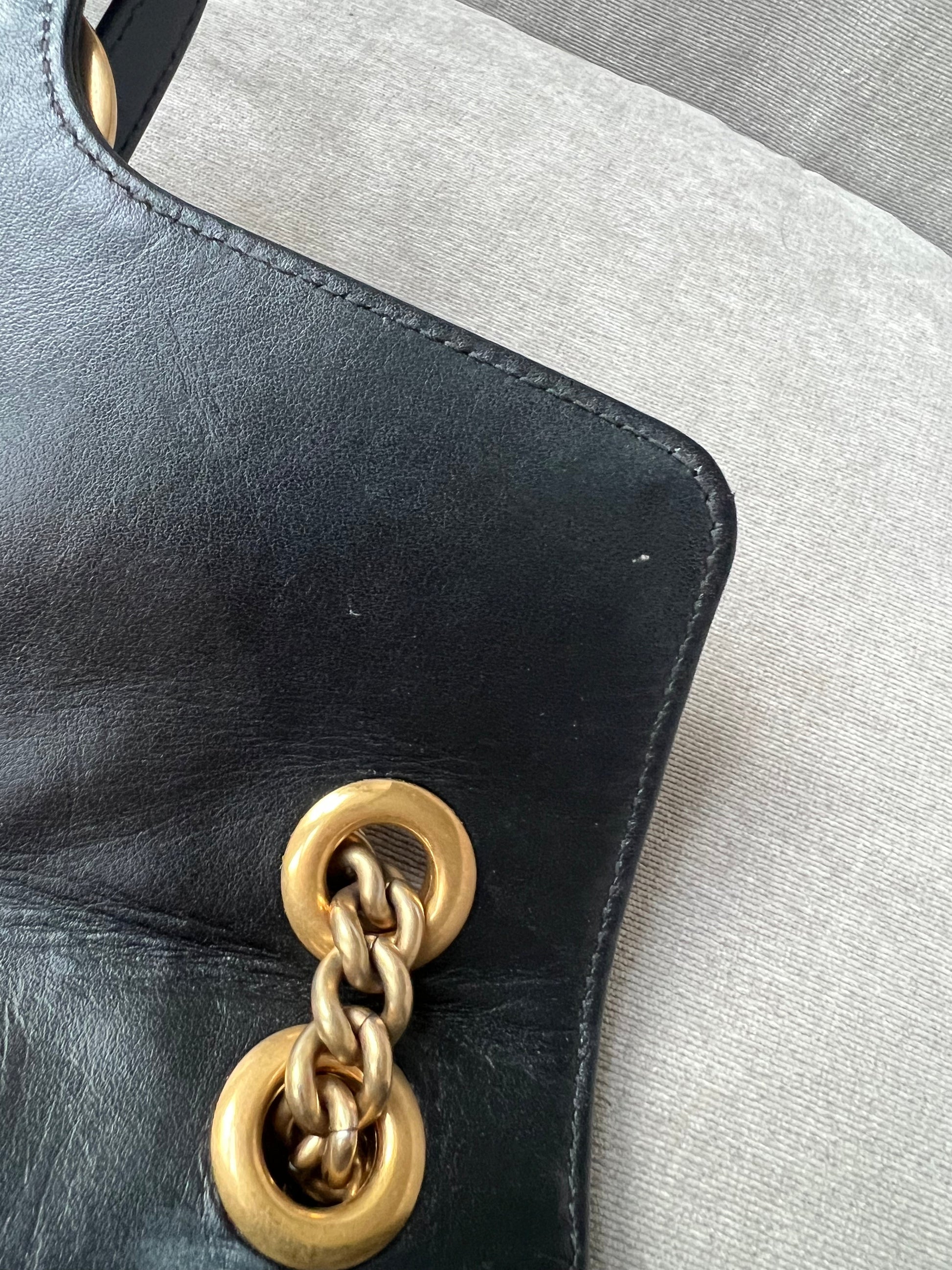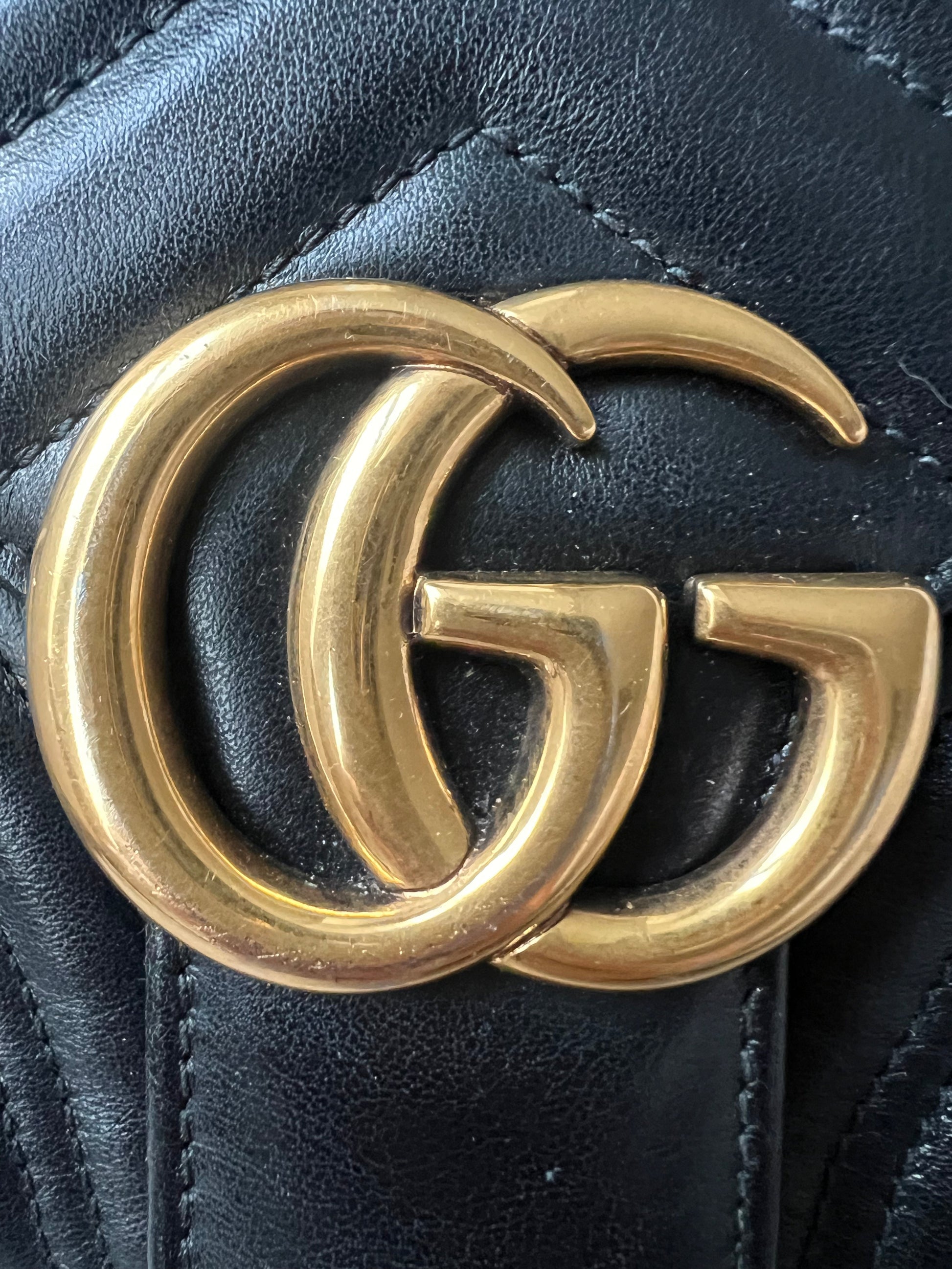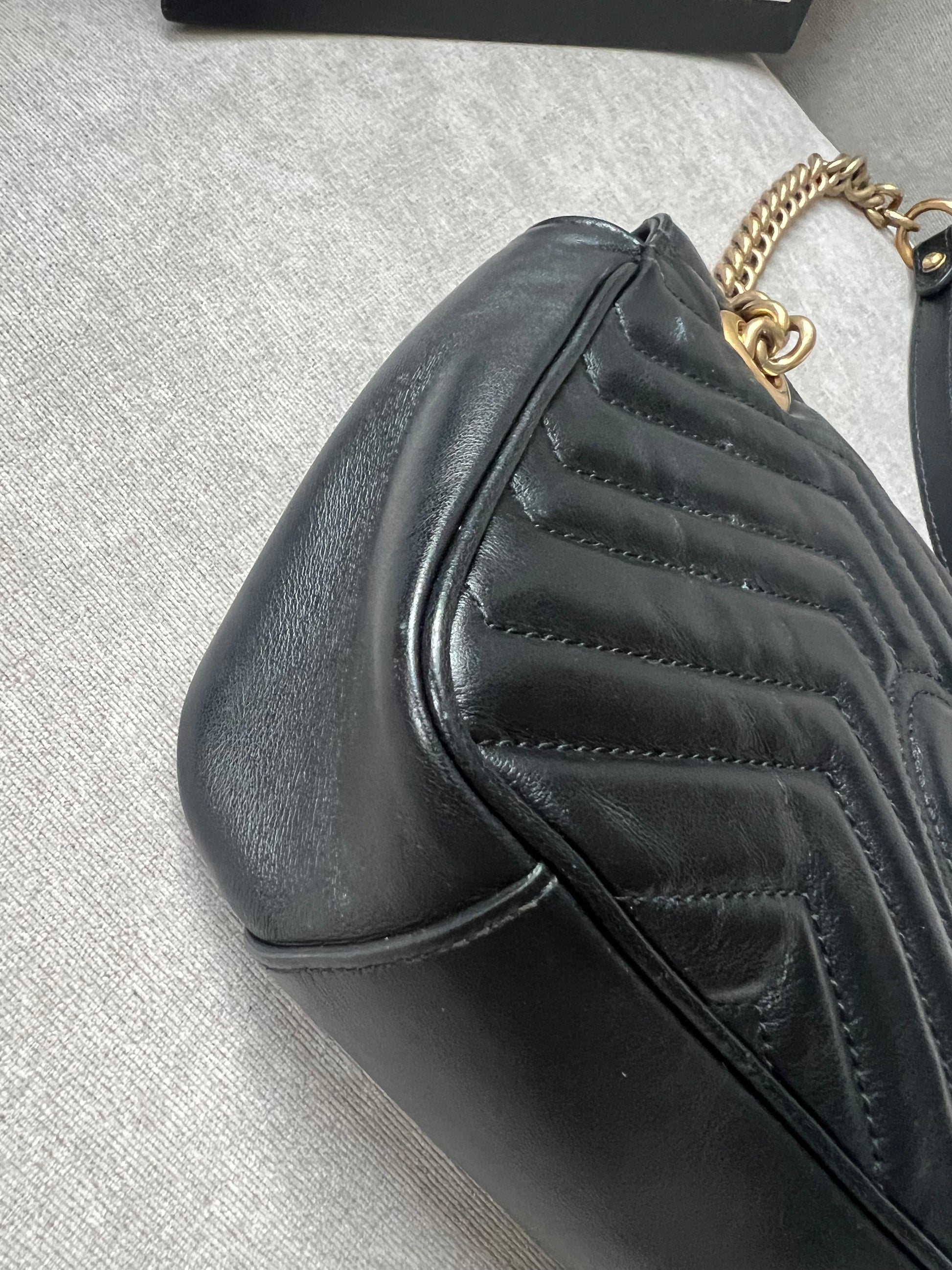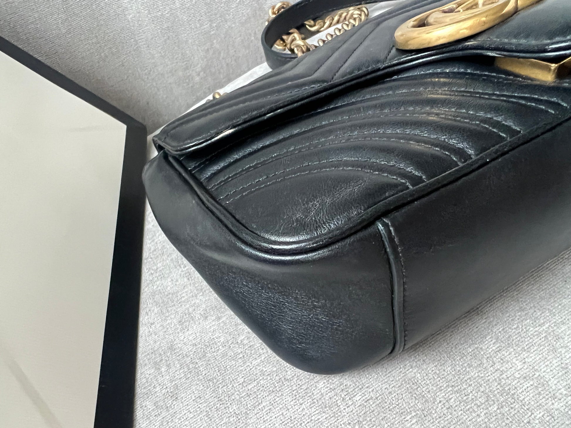 Gucci GG Marmont small shoulder bag in black matelasse leather with gold hardware. This small Marmont bag has a softly structured shape and an oversized flap with GG hardware and heart detail on the back. The sliding chain can be multiple ways either doubled up or lengthened. Effortlessly chic and sophisticated, this style can be both with a casual outfit or for evening wear. Suitable for both event or occasion wear and ideal for those who prefer a cross body option.