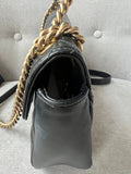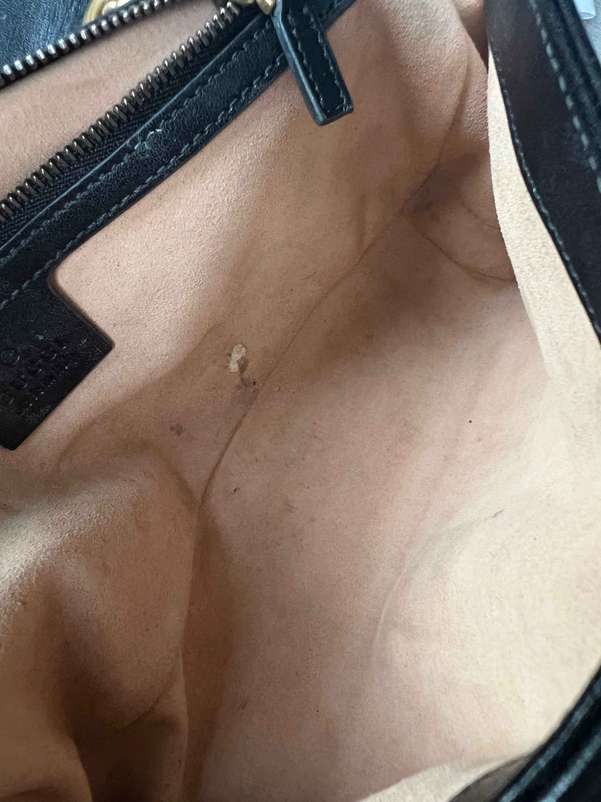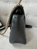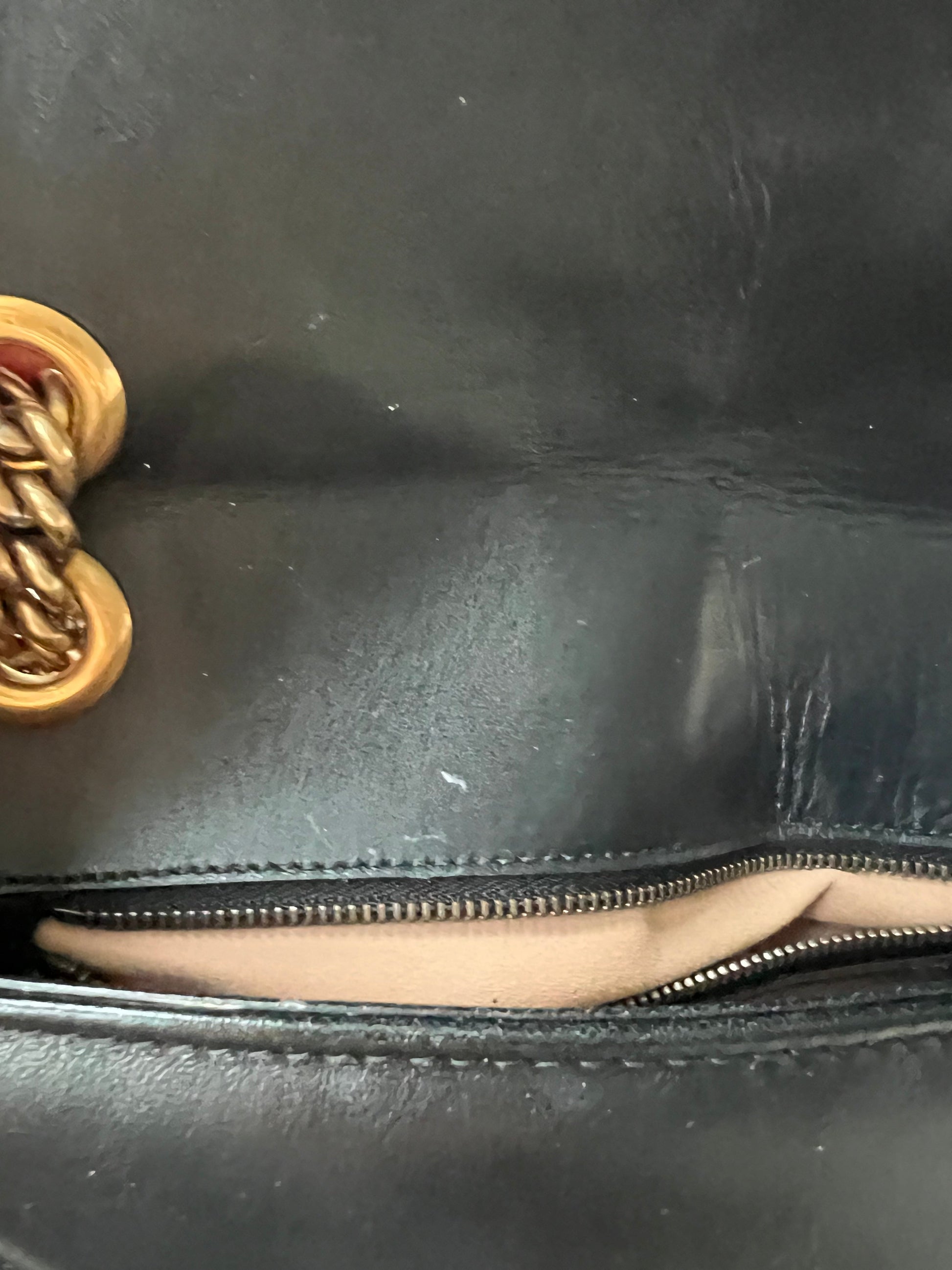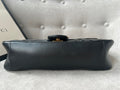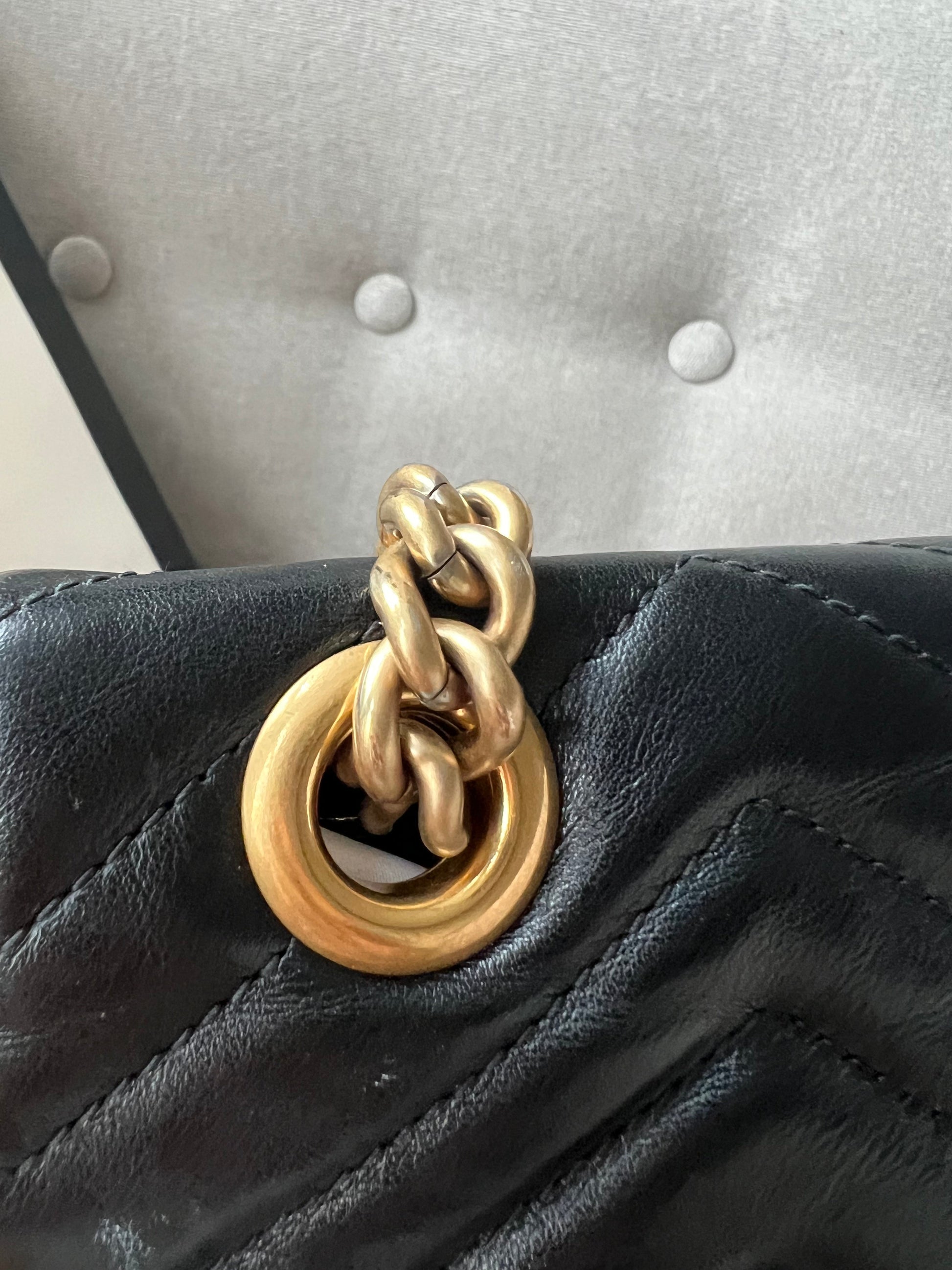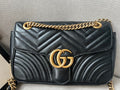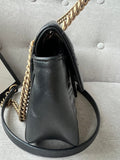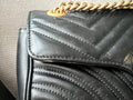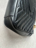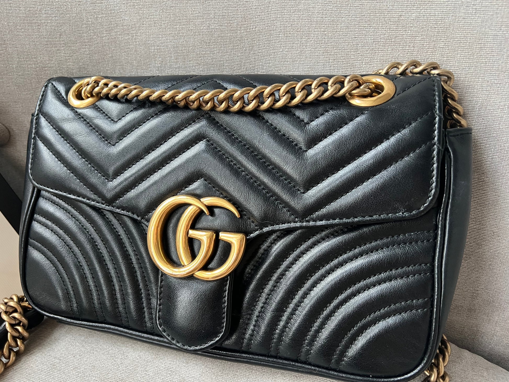 Gucci GG Marmont small shoulder bag in black matelasse leather with gold hardware. This small Marmont bag has a softly structured shape and an oversized flap with GG hardware and heart detail on the back. The sliding chain can be multiple ways either doubled up or lengthened. Effortlessly chic and sophisticated, this style can be both with a casual outfit or for evening wear. Suitable for both event or occasion wear and ideal for those who prefer a cross body option.