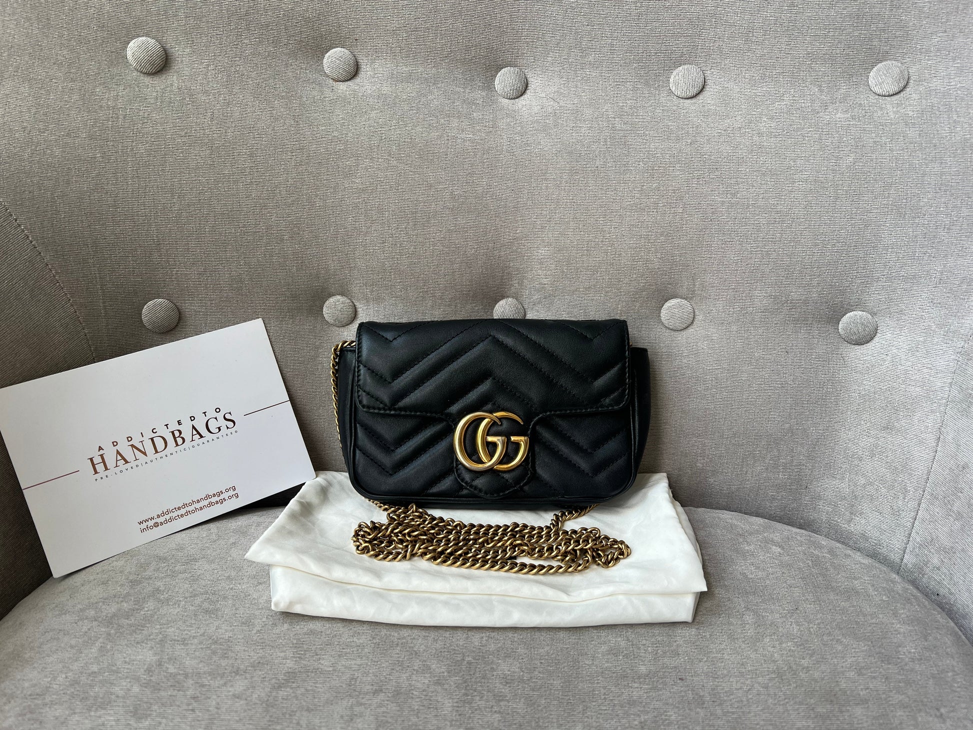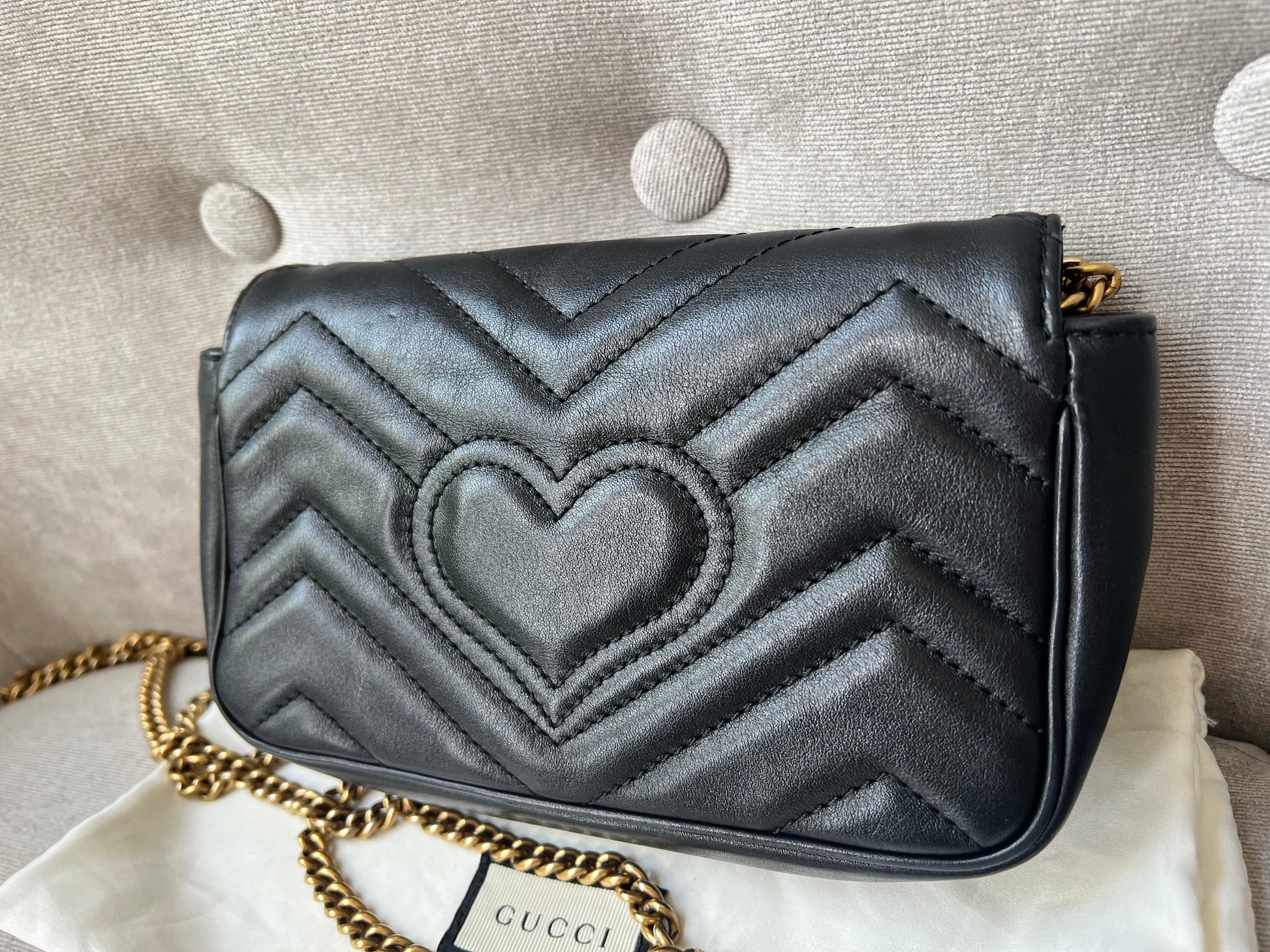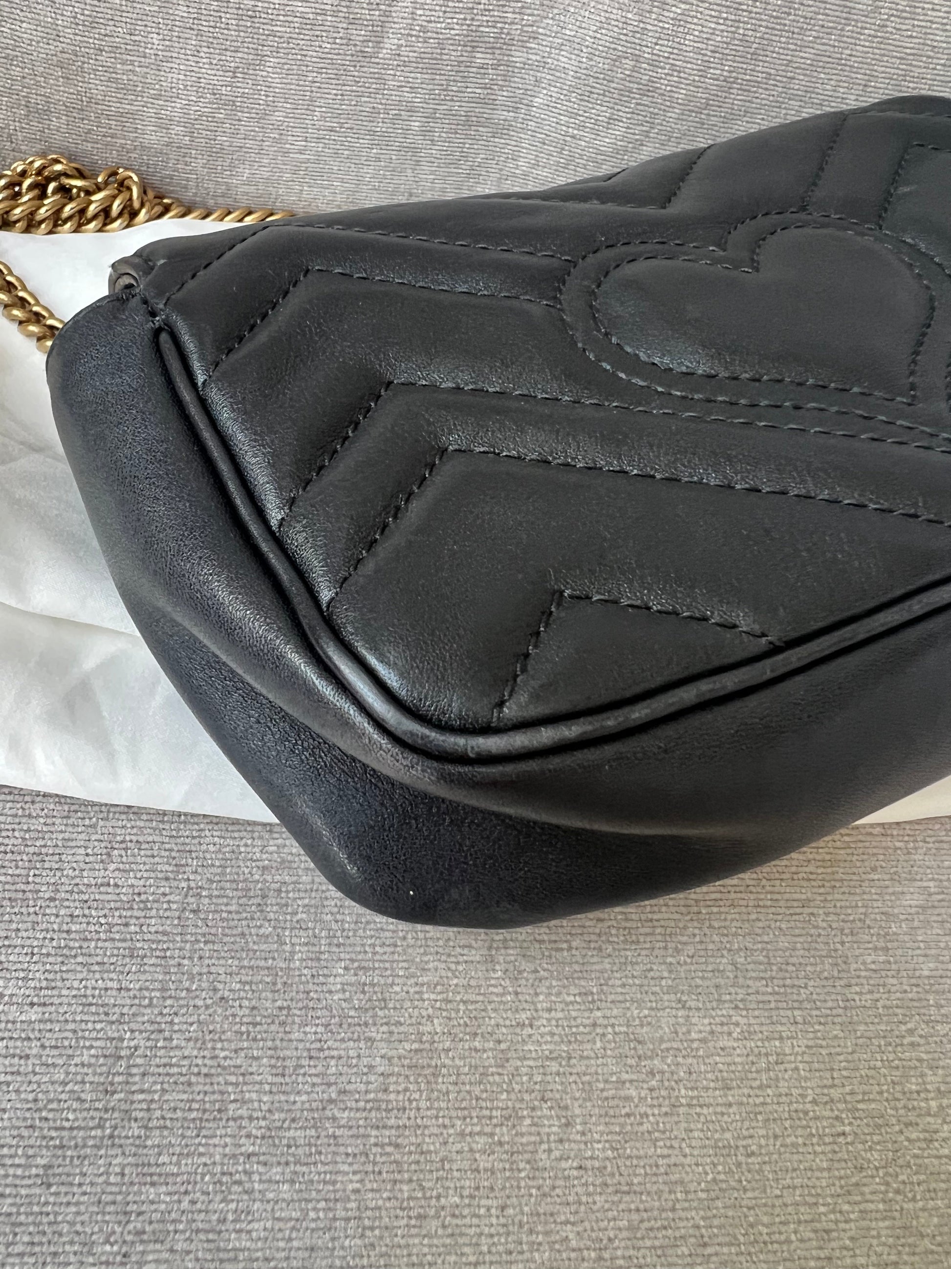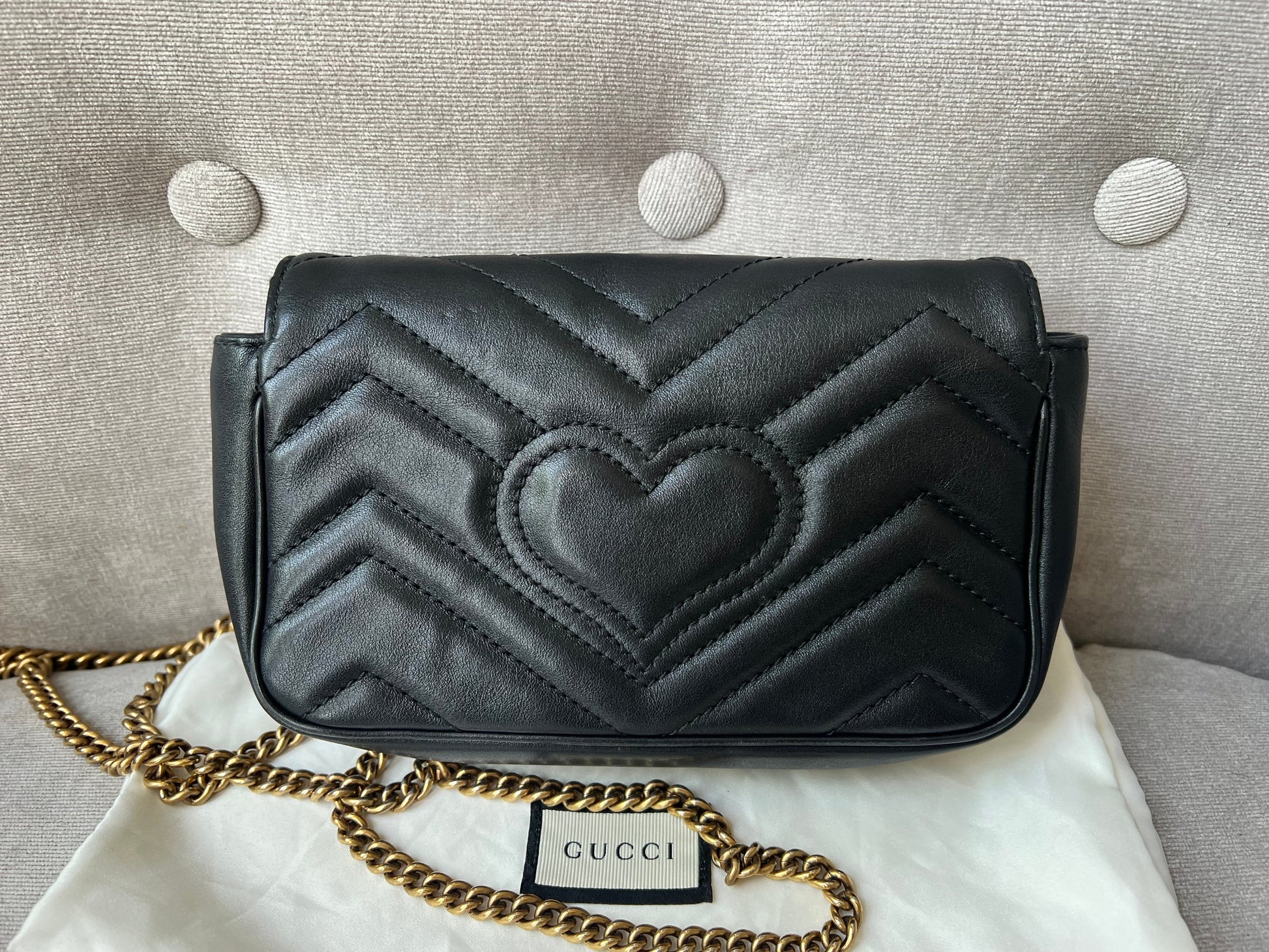 Gucci GG Marmont super mini shoulder bag in black matelasse chevron leather with gold hardware. This super mini Marmont bag has a softly structured shape and a flap with GG hardware and heart detail on the back. Effortlessly chic and sophisticated, this style can be both with a casual outfit or for evening wear. Suitable for both day to day or occasion wear and ideal for those who prefer smaller sized bags only to carry the essentials. Chain is removable to can be carried as a handheld clutch as well as a shoulder / cross body bag.