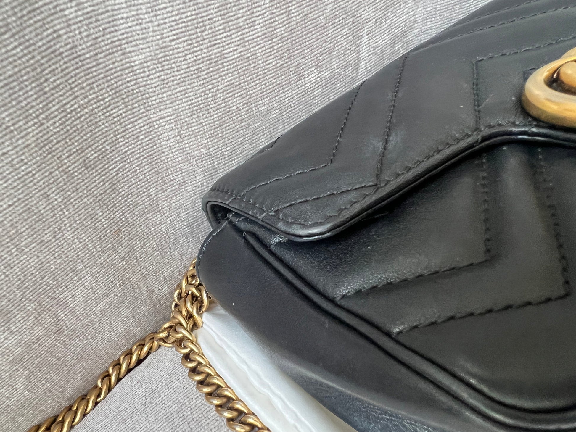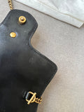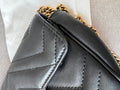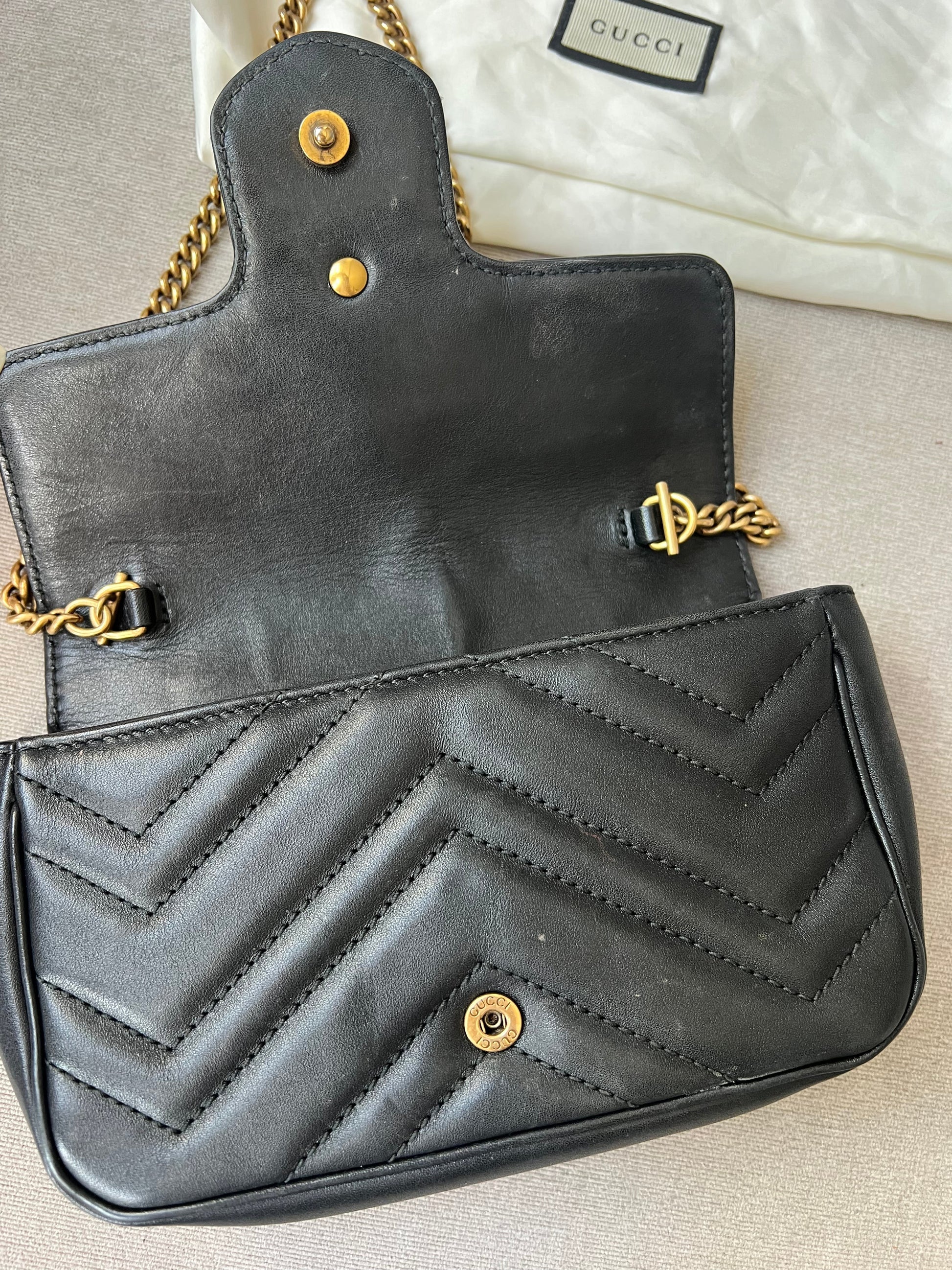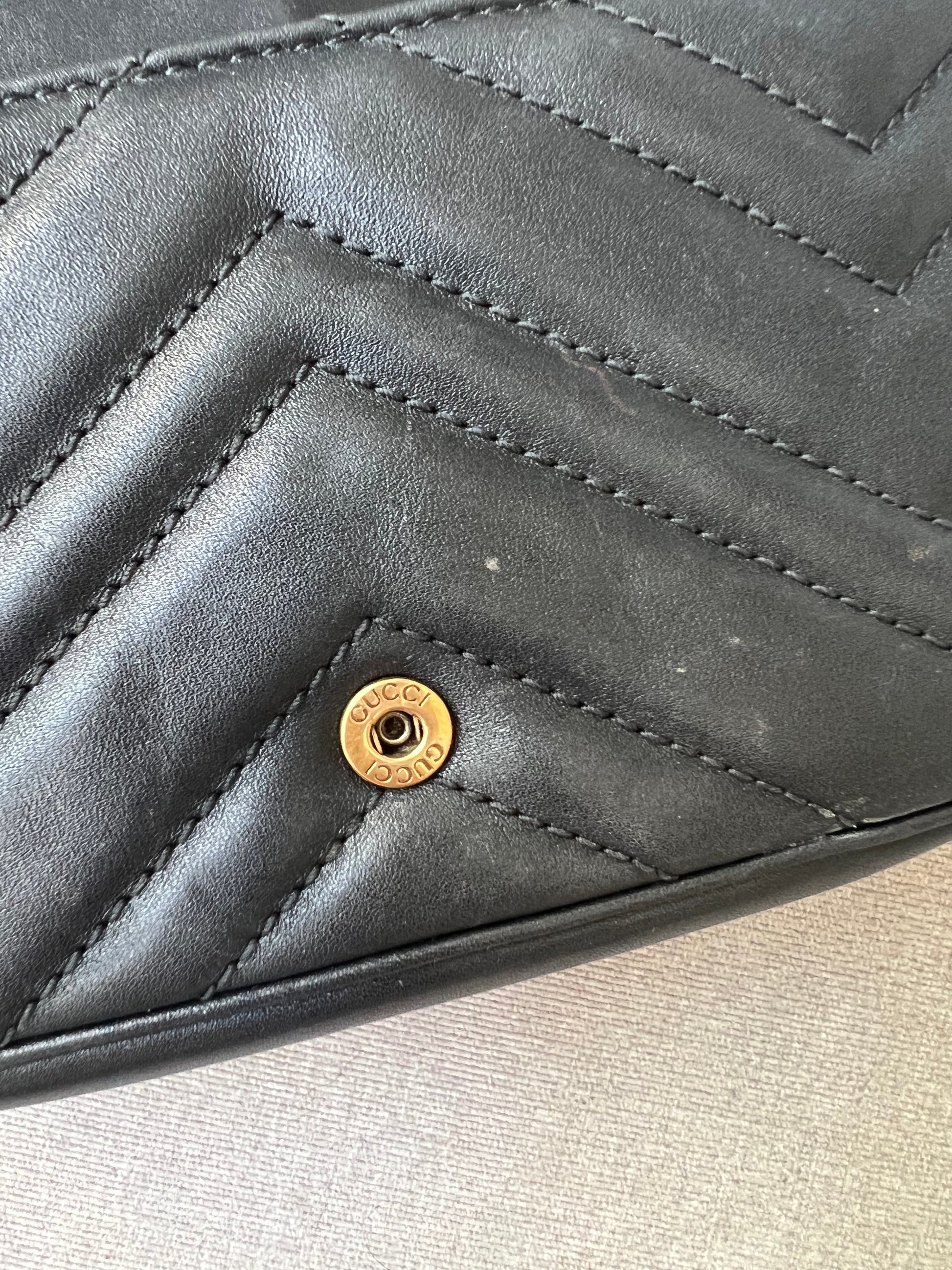 Gucci GG Marmont super mini shoulder bag in black matelasse chevron leather with gold hardware. This super mini Marmont bag has a softly structured shape and a flap with GG hardware and heart detail on the back. Effortlessly chic and sophisticated, this style can be both with a casual outfit or for evening wear. Suitable for both day to day or occasion wear and ideal for those who prefer smaller sized bags only to carry the essentials. Chain is removable to can be carried as a handheld clutch as well as a shoulder / cross body bag.