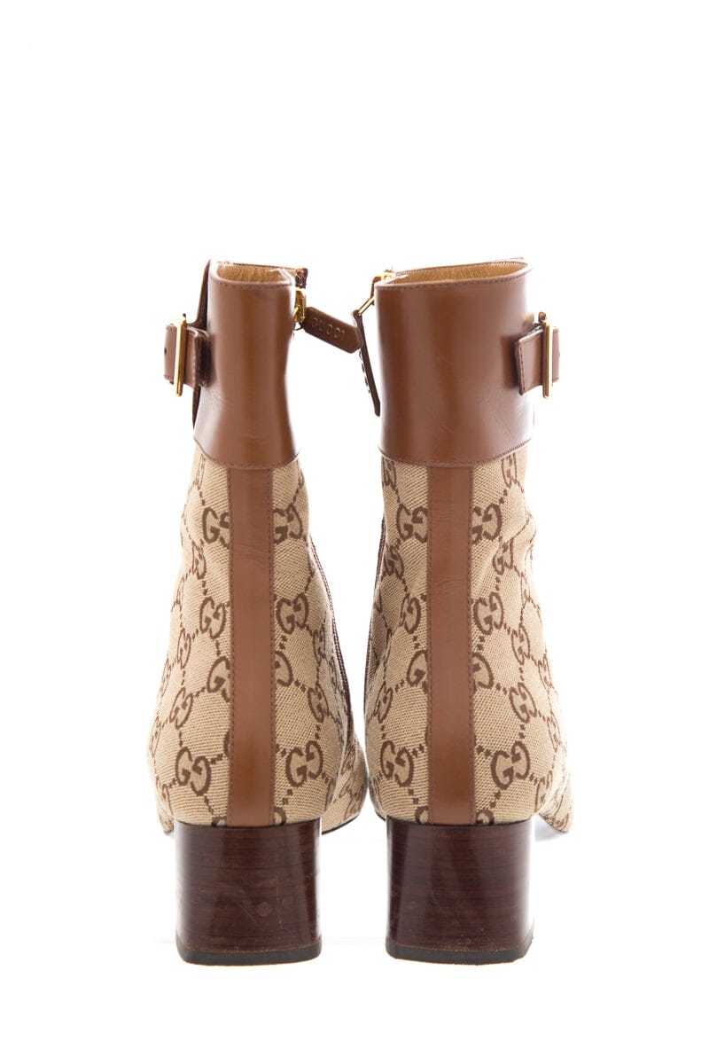 Gucci GG Canvas Brown Leather Ankle Boots with Logo Gold Buckle Detail. This item is in good condition; some wear on bottoms and some scratching on heels.