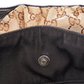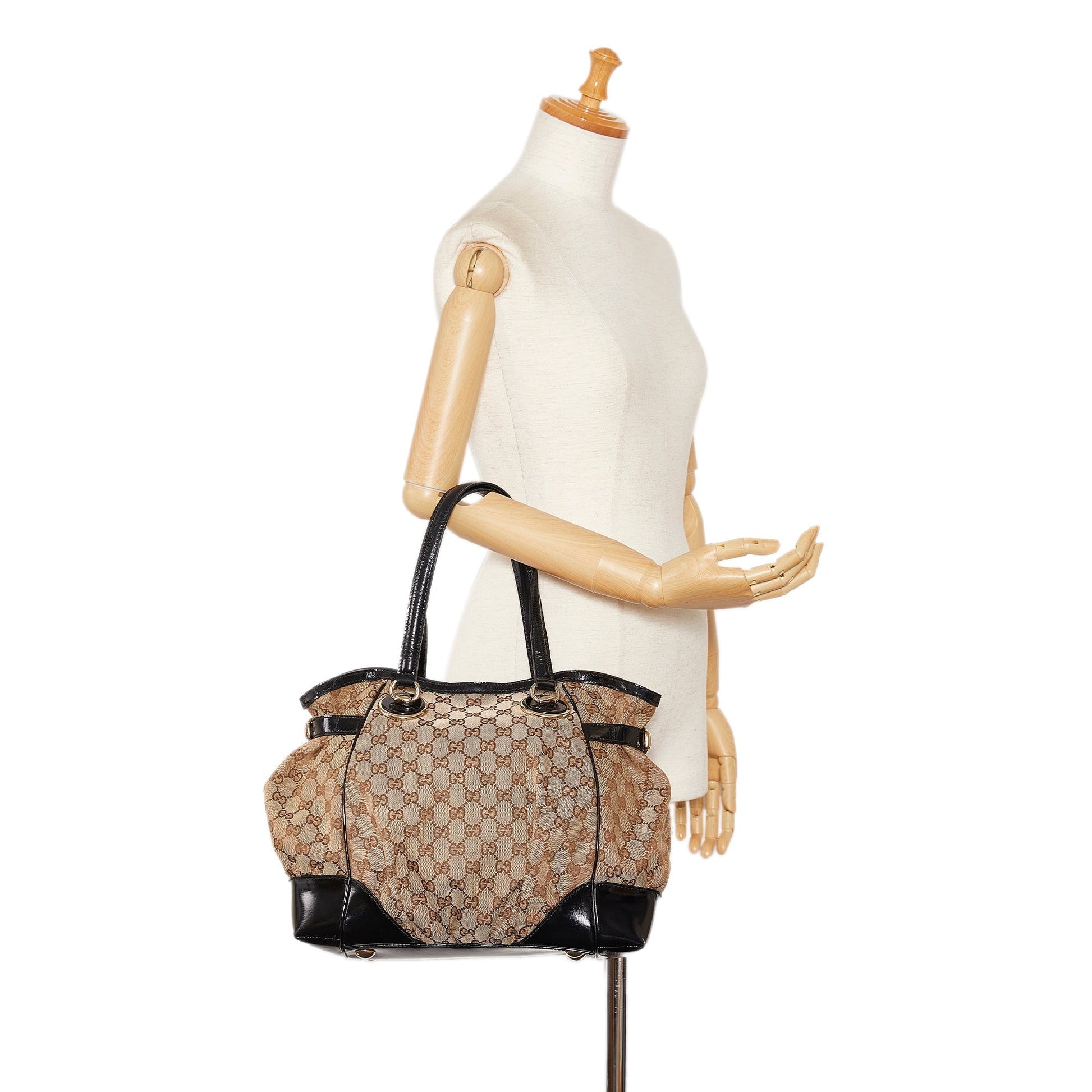 The Full Moon tote bag features a canvas body with leather trim, flat leather straps, an open top with a magnetic snap button closure, and interior zip and slip pockets.