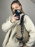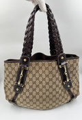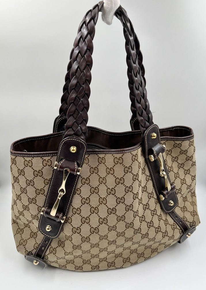 A Gucci GG canvas tote with braided brown leather handles and horse-bit hardware. The perfect go anywhere, chuck it all in tote. The bag is lined with a brown cotton lining and there is an interior zipped pocket for valuables.