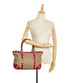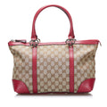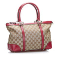 This tote bag features a canvas body with leather trim, rolled leather handles, a top zip closure, and interior zip and slip pockets.