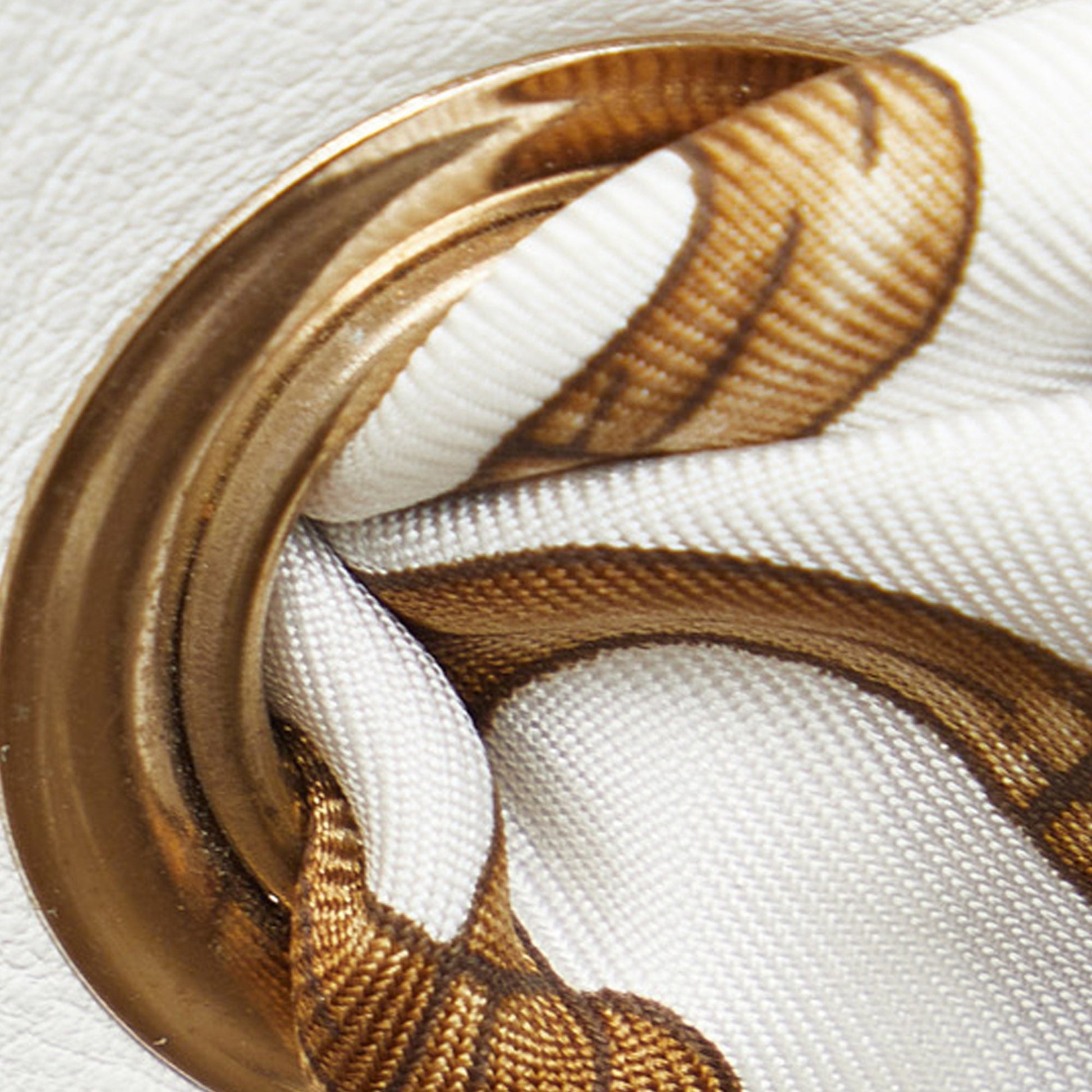 The Positano bag features a canvas body with leather trim, a flat strap, an open top with a silk scarf, and an interior zip pocket.