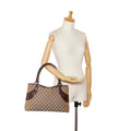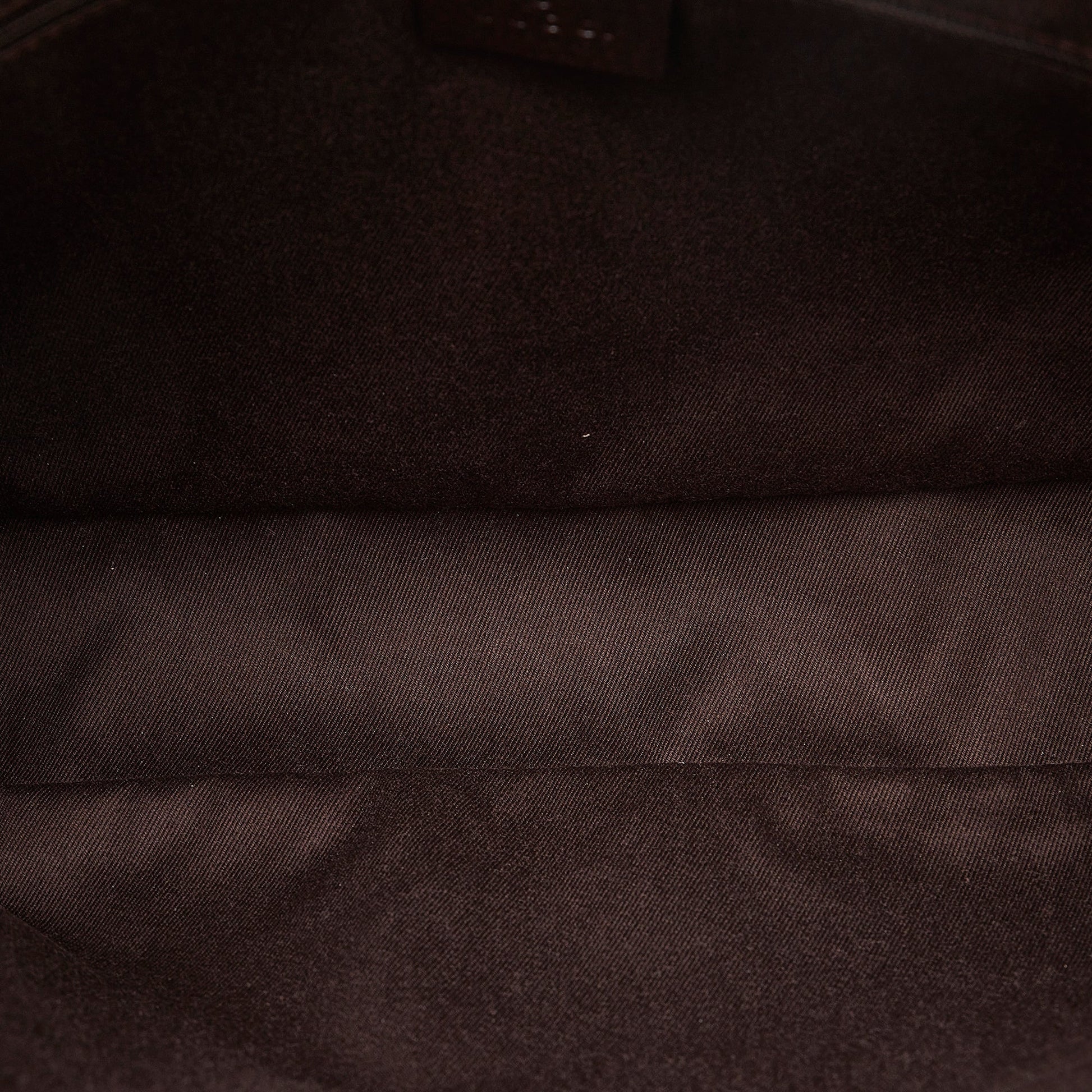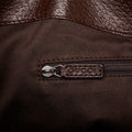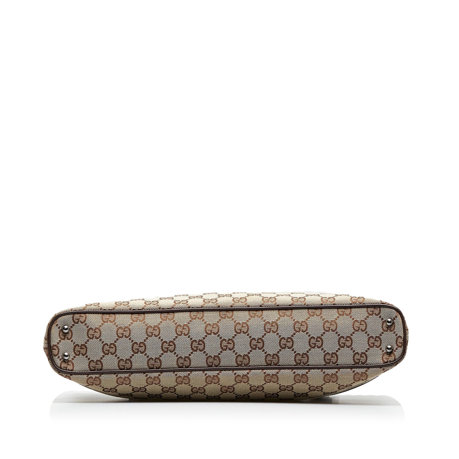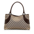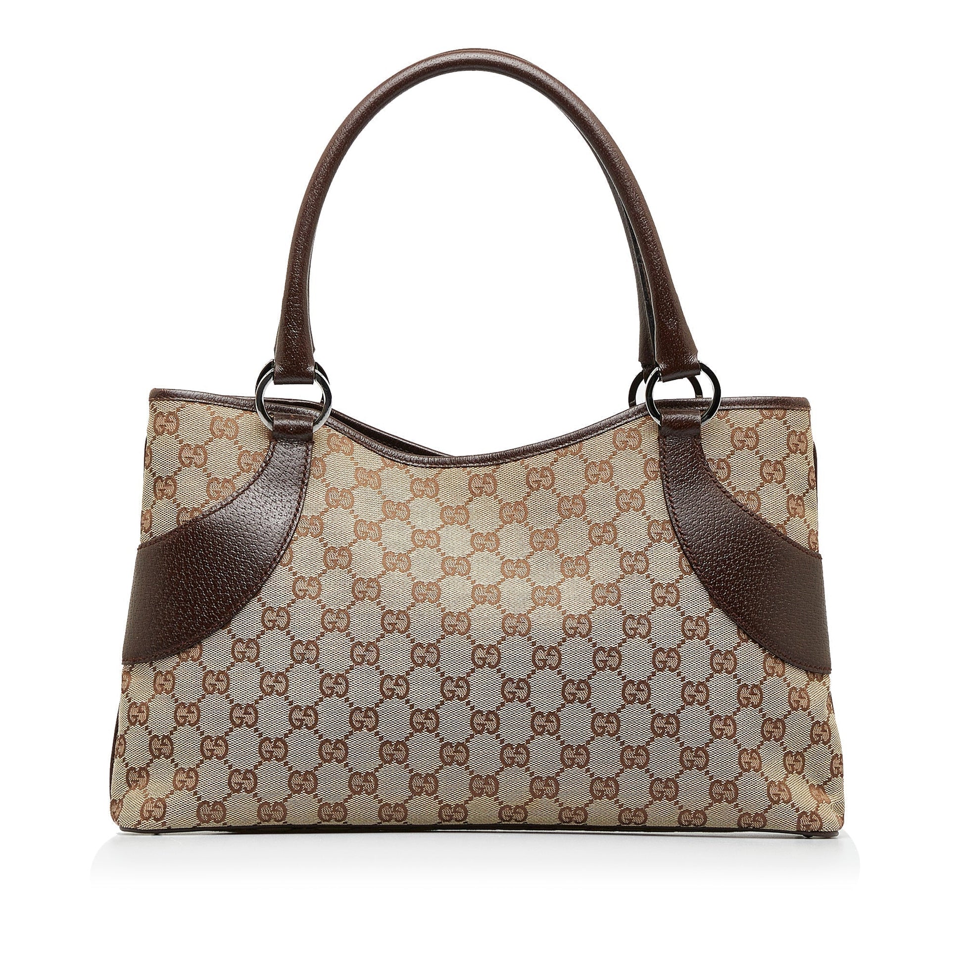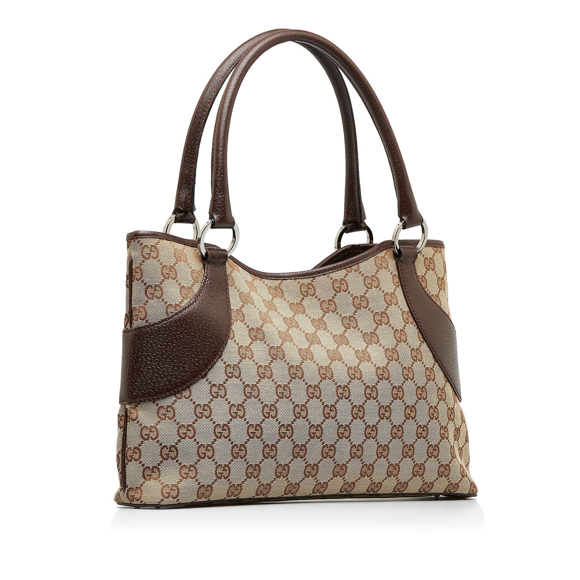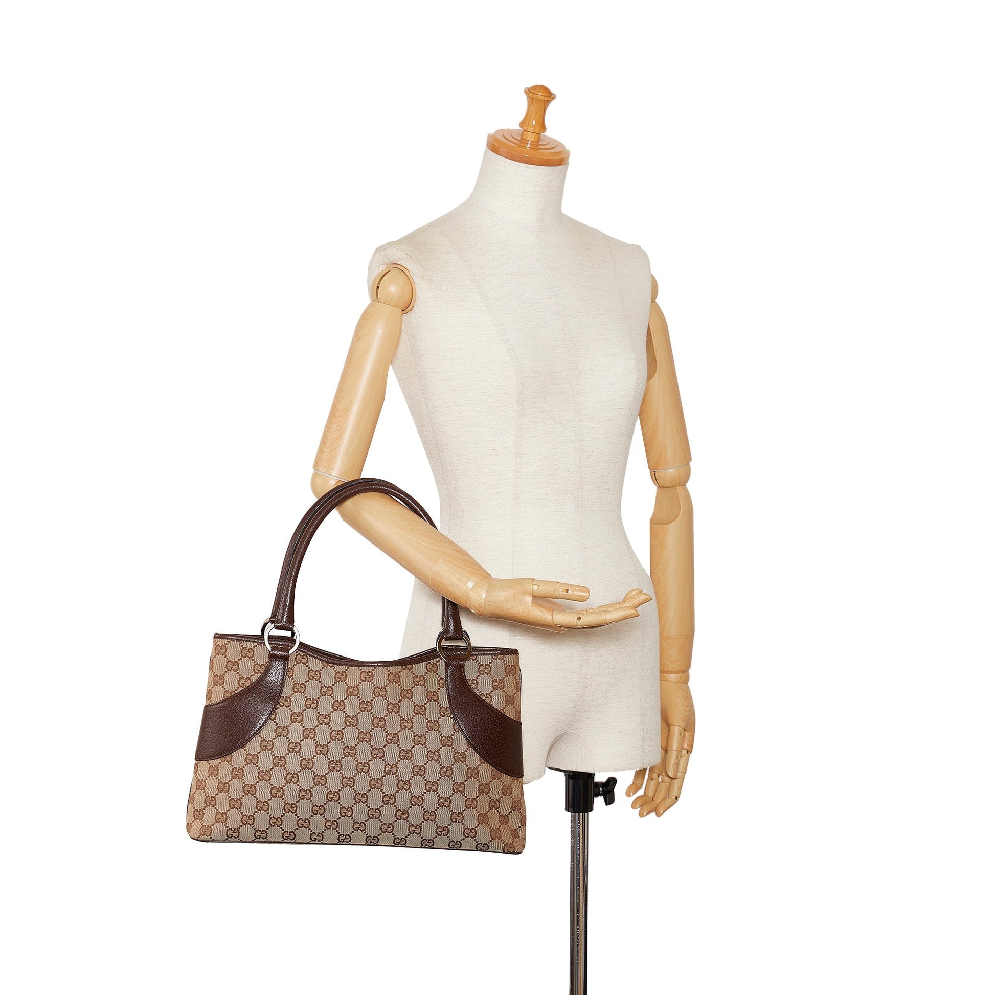 This tote bag features a canvas body with leather trim, rolled leather straps, an open top with a magnetic closure, and an interior zip pocket.