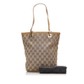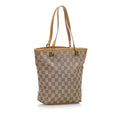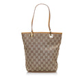 This tote bag features a canvas body, flat leather handles, an open top, and an interior zip pocket. Comes with dust bag