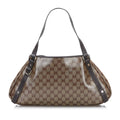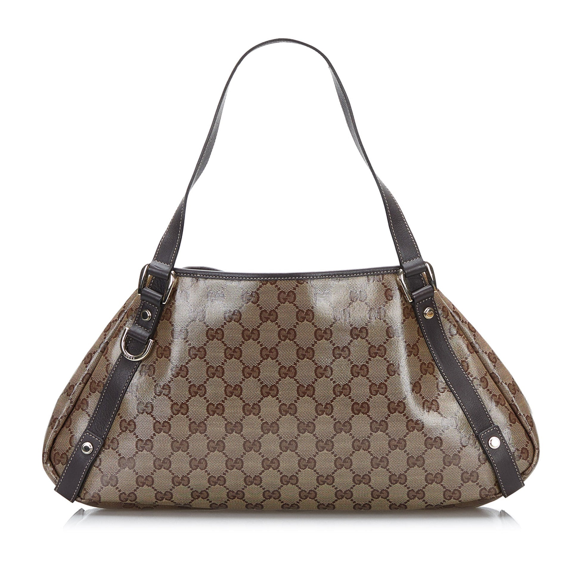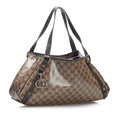 The Pelham tote bag features a vinyl body with leather trim, flat leather straps, an open top, and interior zip and slip pockets. Comes with dust bag