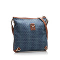 This crossbody bag features a denim body, a flat leather shoulder strap, a top zip closure, and interior zip and slip pockets. Comes with dust bag