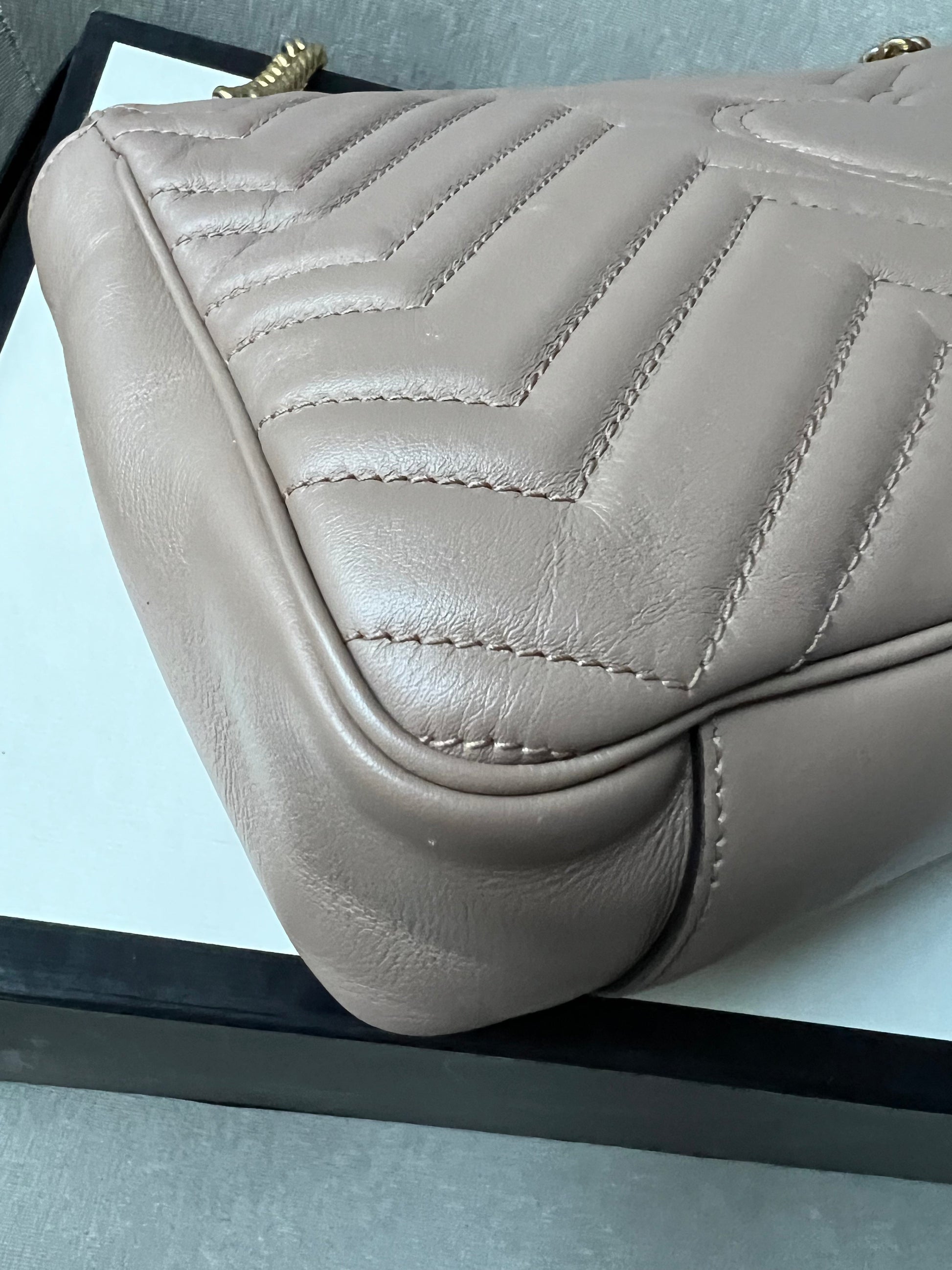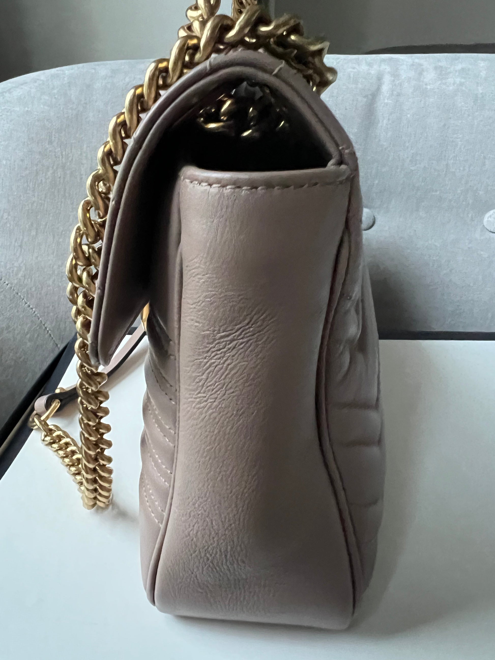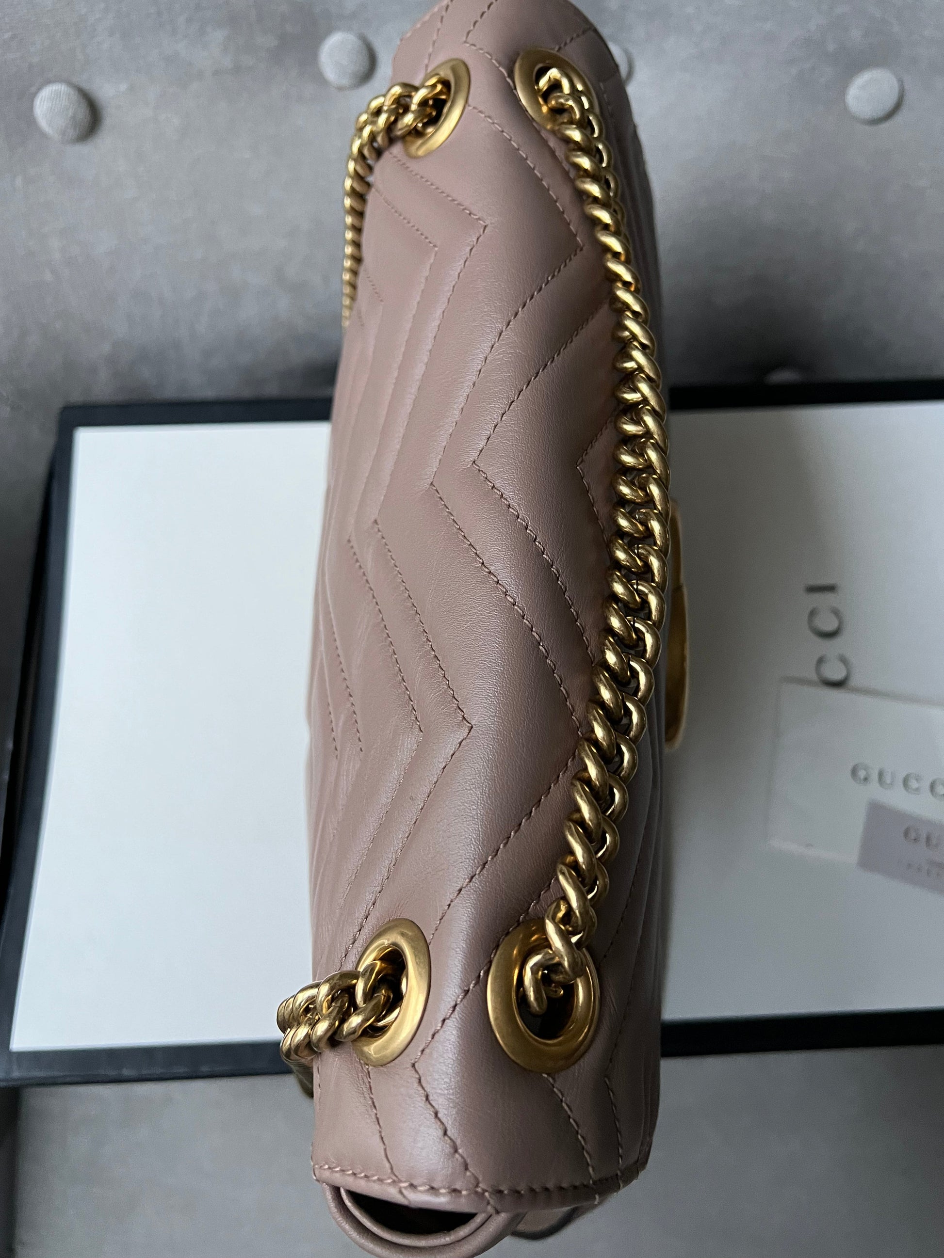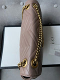 Gucci GG Marmont medium shoulder bag in dusty pink matelasse chevron leather with gold hardware. This medium Marmont bag has a softly structured shape and an oversized flap with GG hardware and heart detail on the back. The sliding chain can be multiple ways either doubled up or lengthened. Effortlessly chic and sophisticated, this style can be both with a casual outfit or for evening wear. Suitable for both day to day or occasion wear and ideal for those who prefer a cross body option.