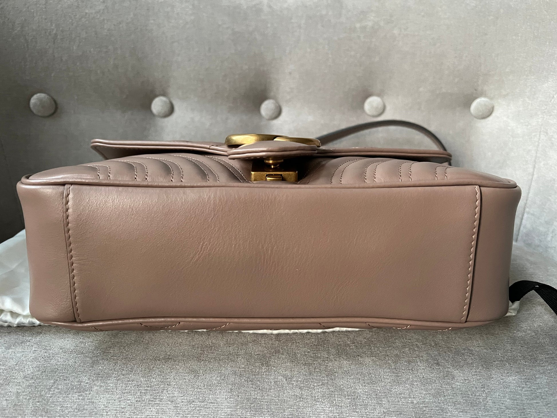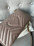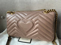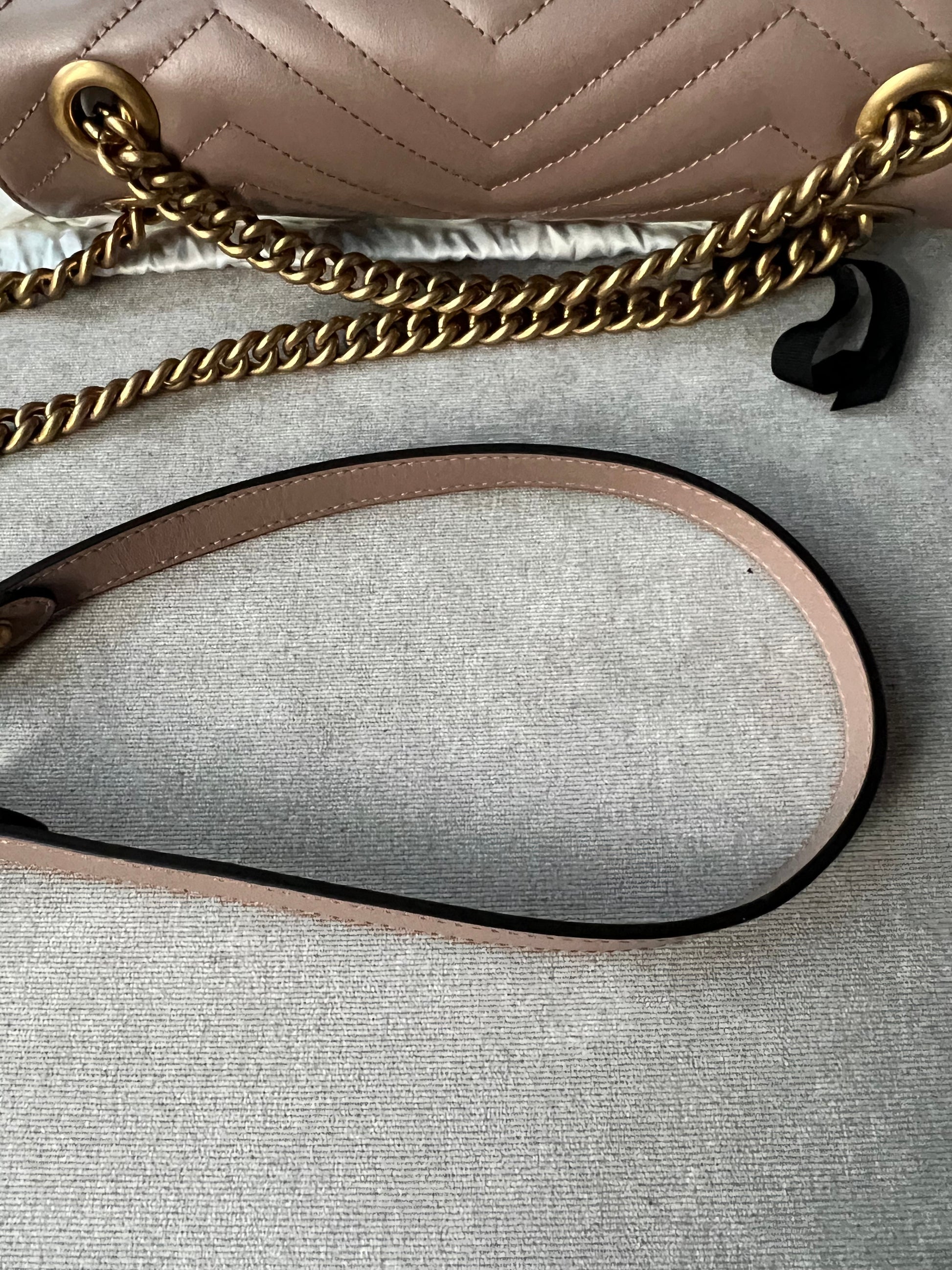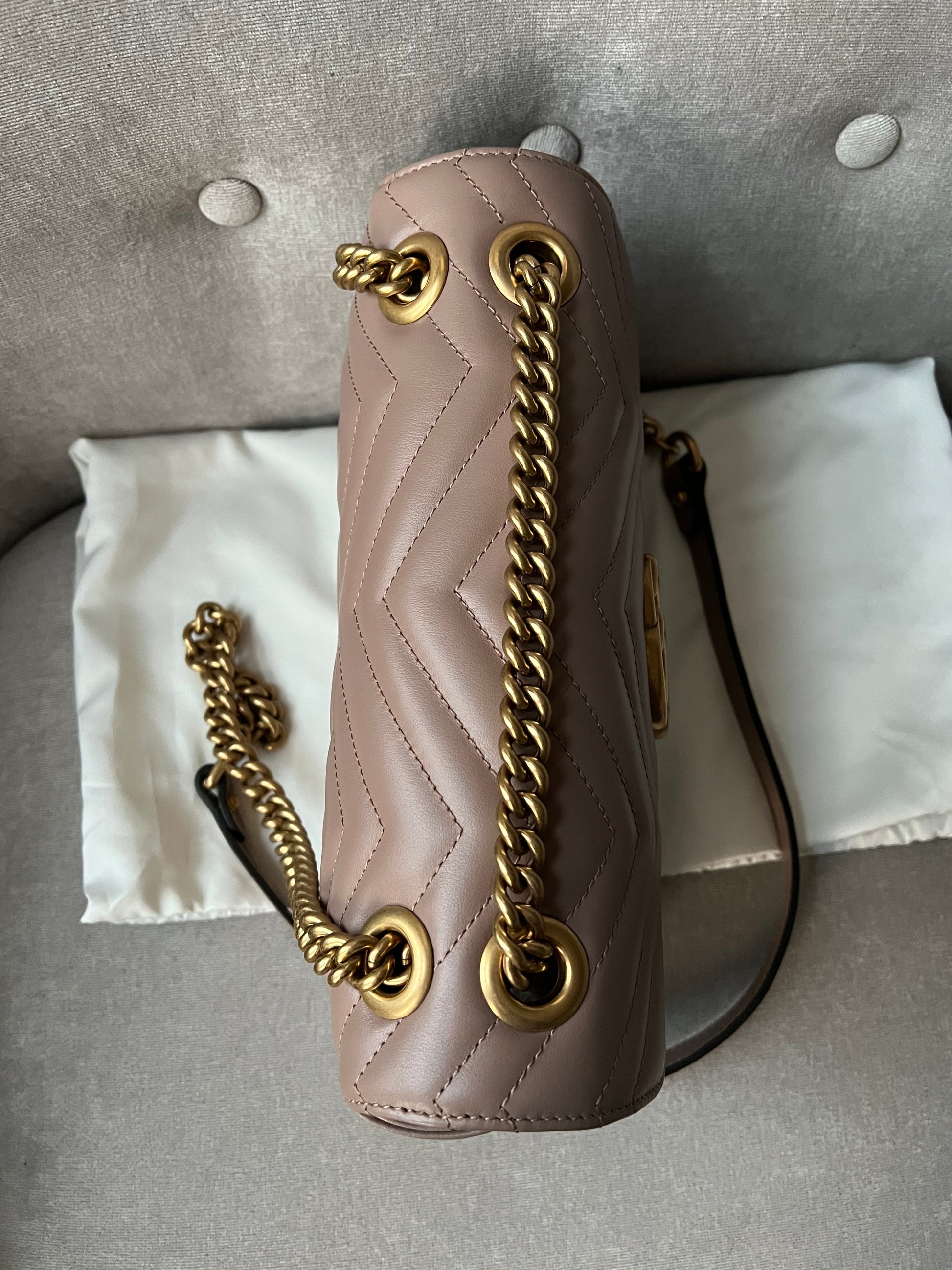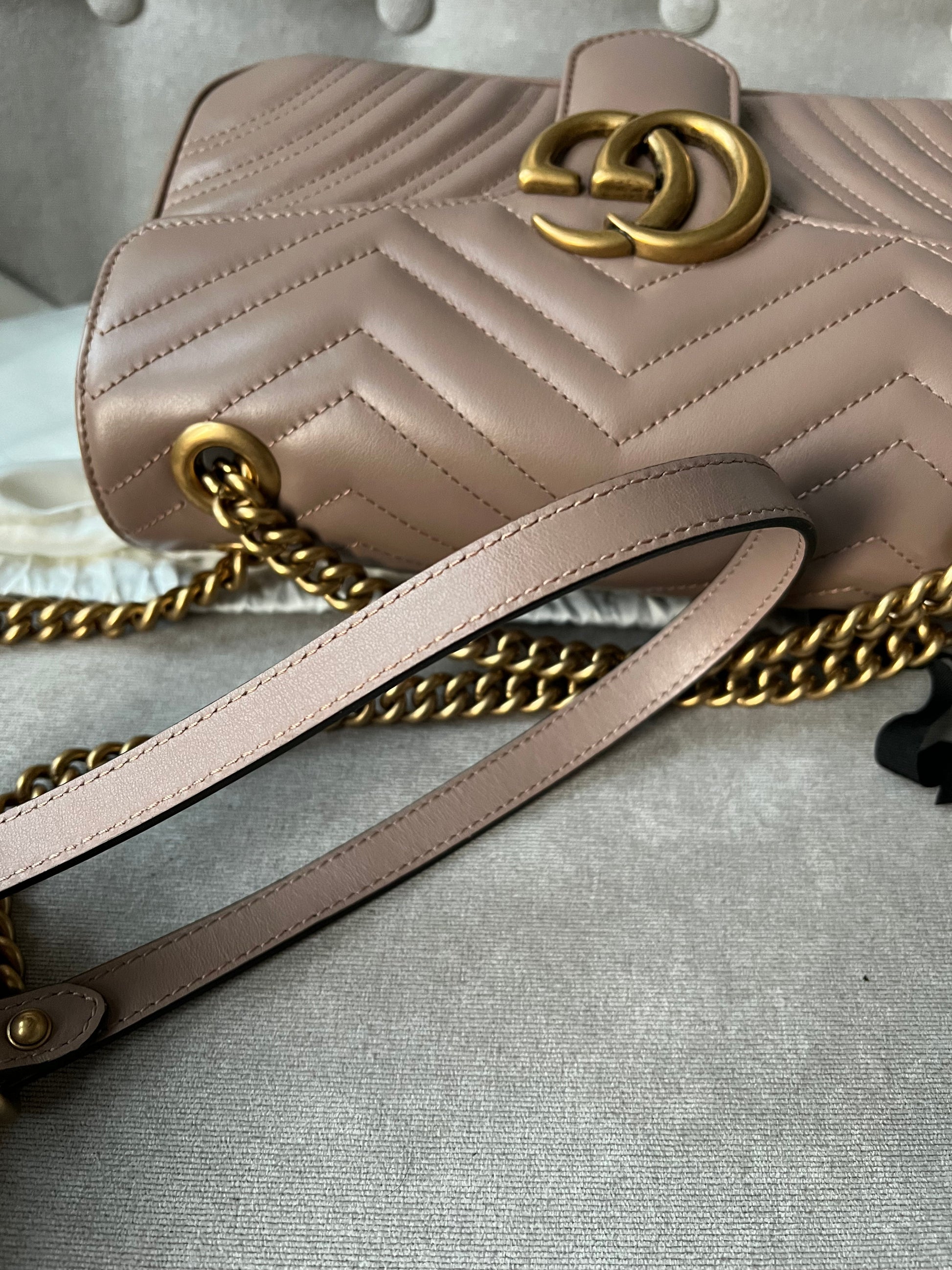 Gucci GG Marmont small shoulder bag in dusty pink matelasse leather with gold hardware. This small Marmont bag has a softly structured shape and an oversized flap with GG hardware and heart detail on the back. The sliding chain can be multiple ways either doubled up or lengthened. Effortlessly chic and sophisticated, this style can be both with a casual outfit or for evening wear. Suitable for both event or occasion wear and ideal for those who prefer a cross body option.