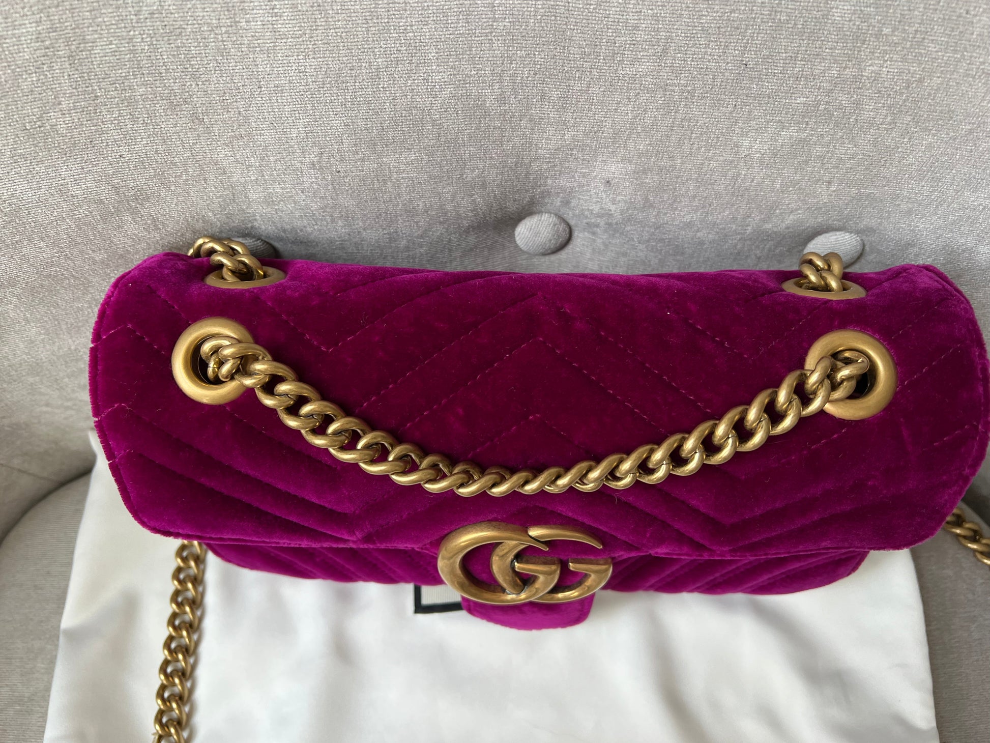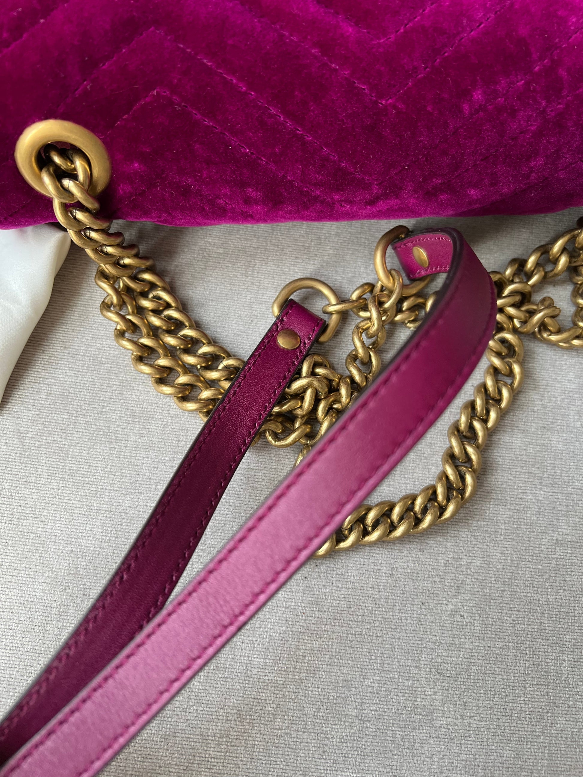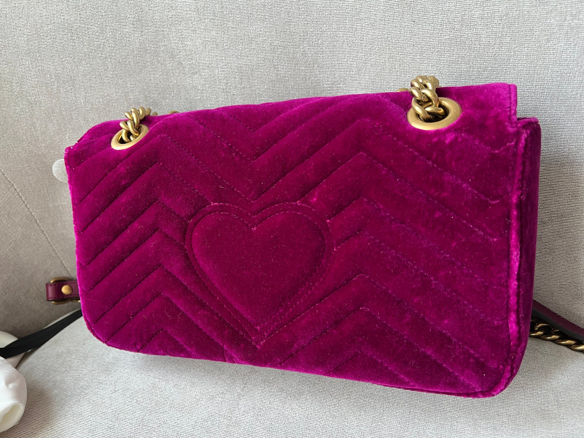 Gucci GG Marmont small shoulder bag in Fuschia velvet with gold hardware. This small Marmont bag has a softly structured shape and an oversized flap with GG hardware and heart detail on the back. The sliding chain can be multiple ways either doubled up or lengthened. Effortlessly chic and sophisticated, this style can be both with a casual outfit or for evening wear. Suitable for both event or occasion wear and ideal for those who prefer a cross body option.