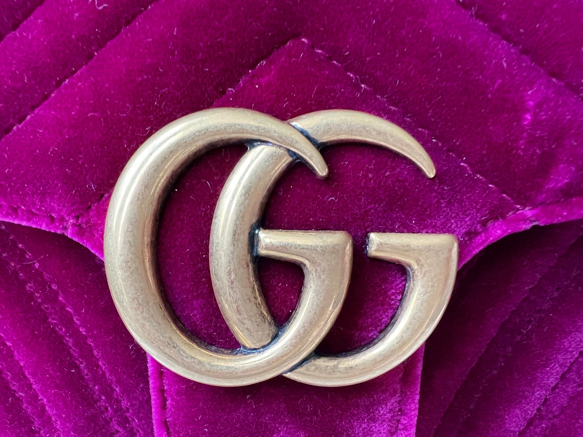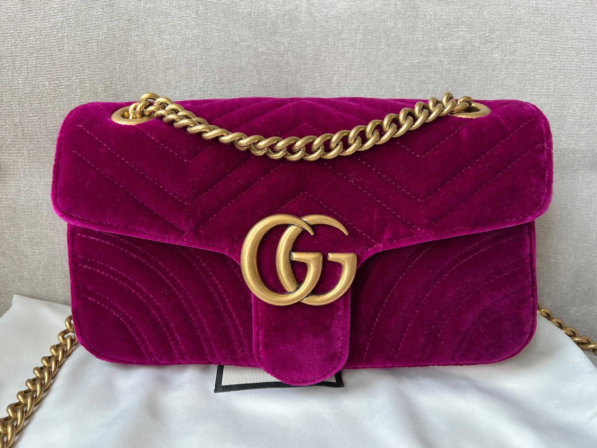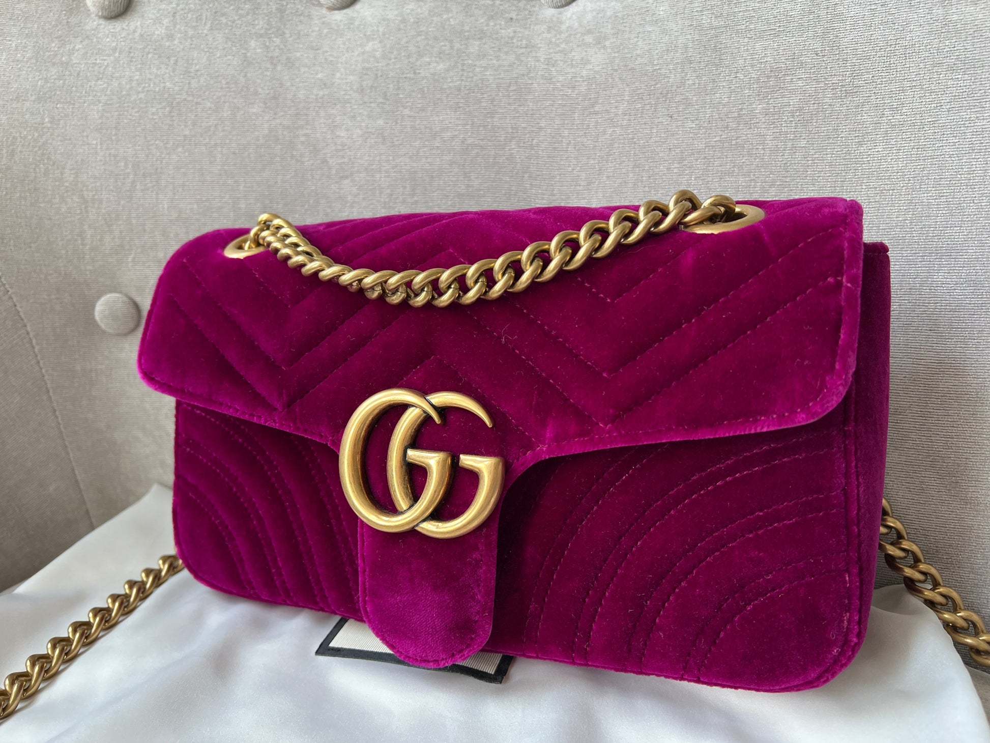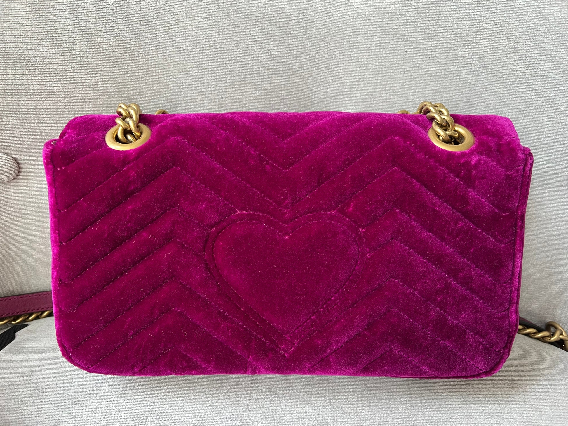 Gucci GG Marmont small shoulder bag in Fuschia velvet with gold hardware. This small Marmont bag has a softly structured shape and an oversized flap with GG hardware and heart detail on the back. The sliding chain can be multiple ways either doubled up or lengthened. Effortlessly chic and sophisticated, this style can be both with a casual outfit or for evening wear. Suitable for both event or occasion wear and ideal for those who prefer a cross body option.