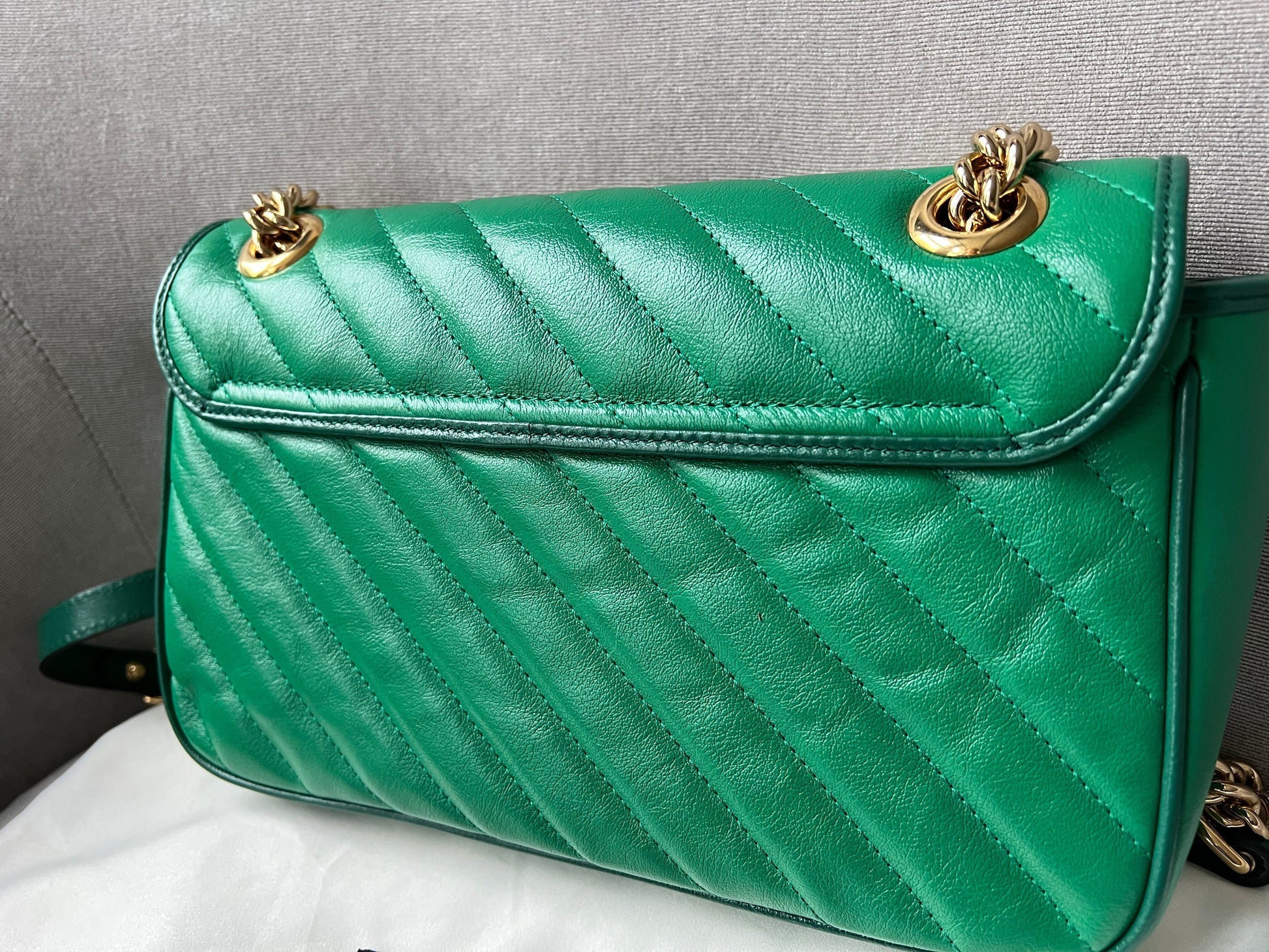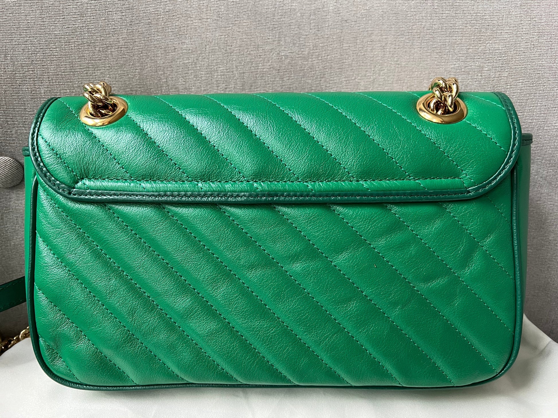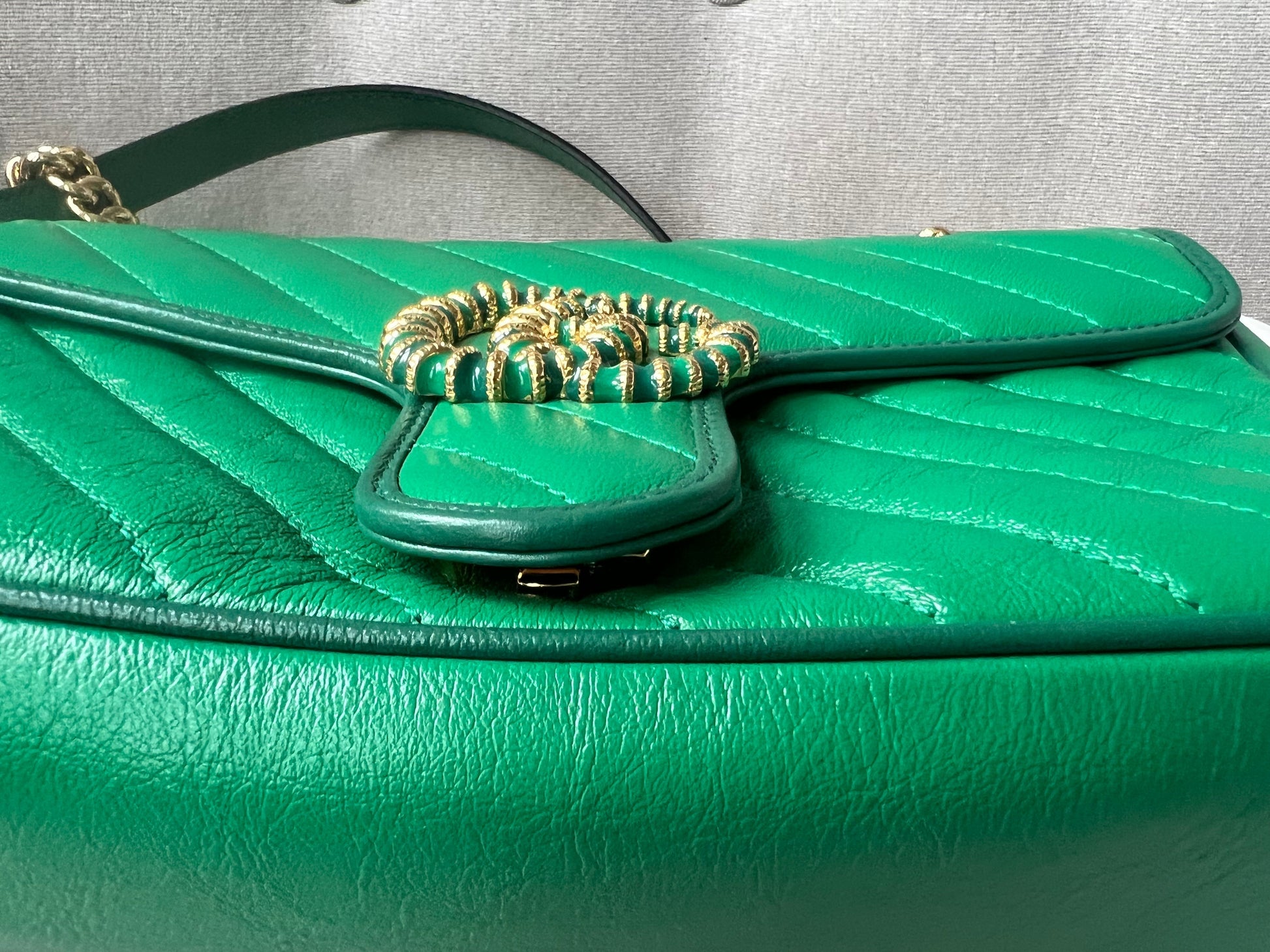 Gucci GG Marmont small shoulder bag in green chevron glazed matelasse leather with torchon gold hardware. This small Marmont bag has a softly structured shape and an oversized flap with GG hardware and heart detail on the back. The sliding chain can be multiple ways either doubled up or lengthened. Effortlessly chic and sophisticated, this style can be both with a casual outfit or for evening wear. Suitable for both event or occasion wear and ideal for those who prefer a cross body option. This colour combination is now discontinued. Note images 2 and 3 show black version for size reference.