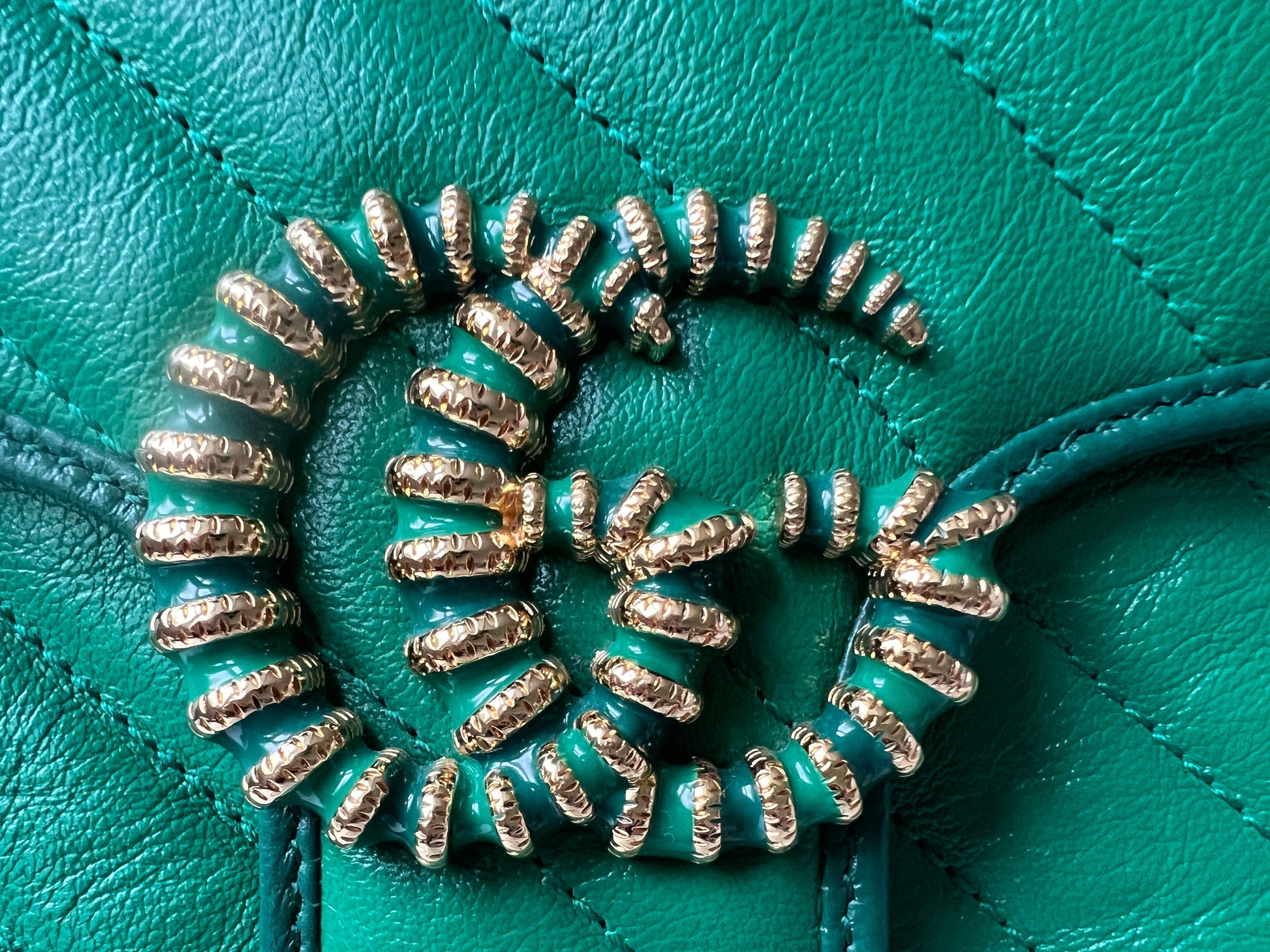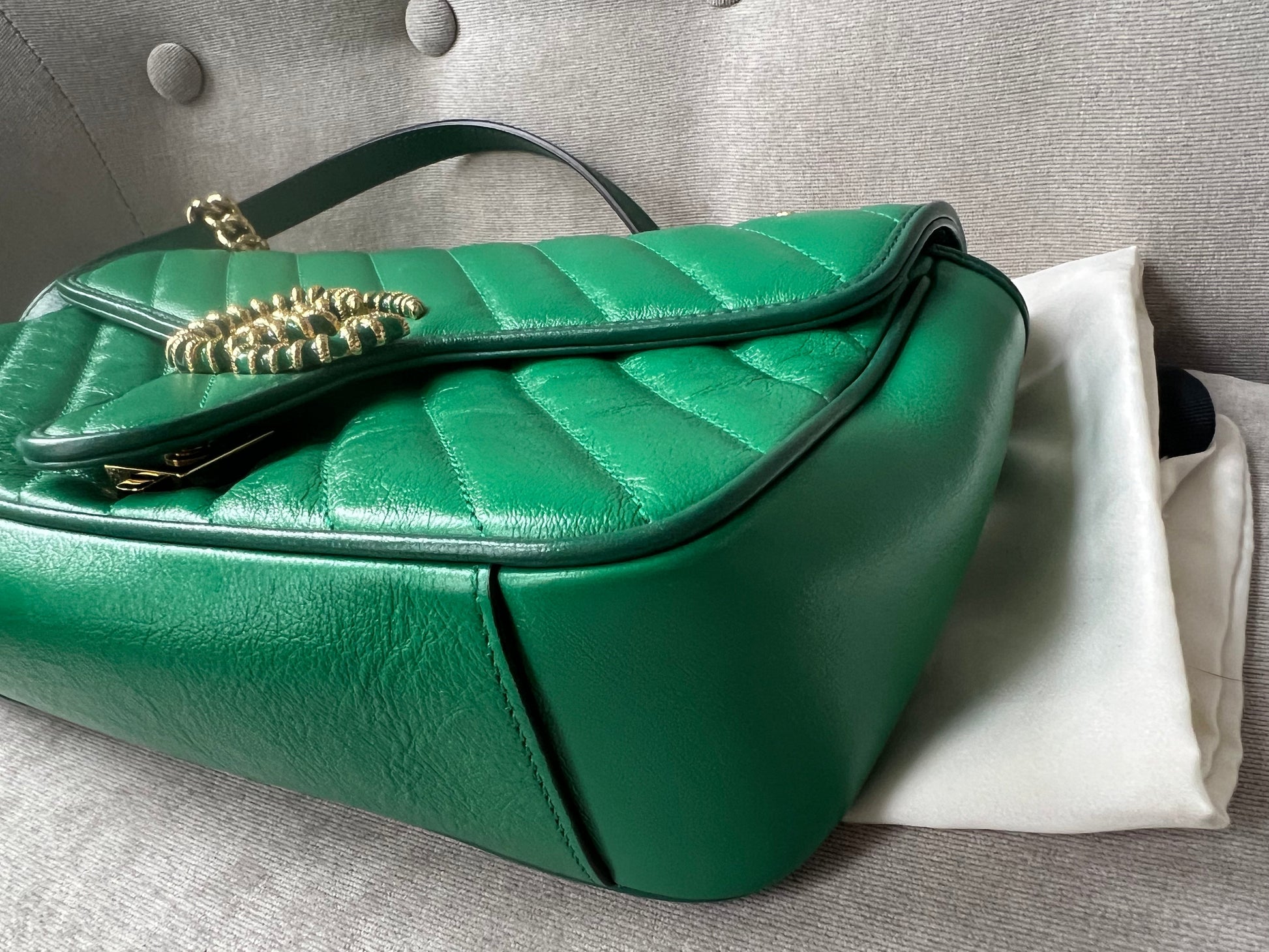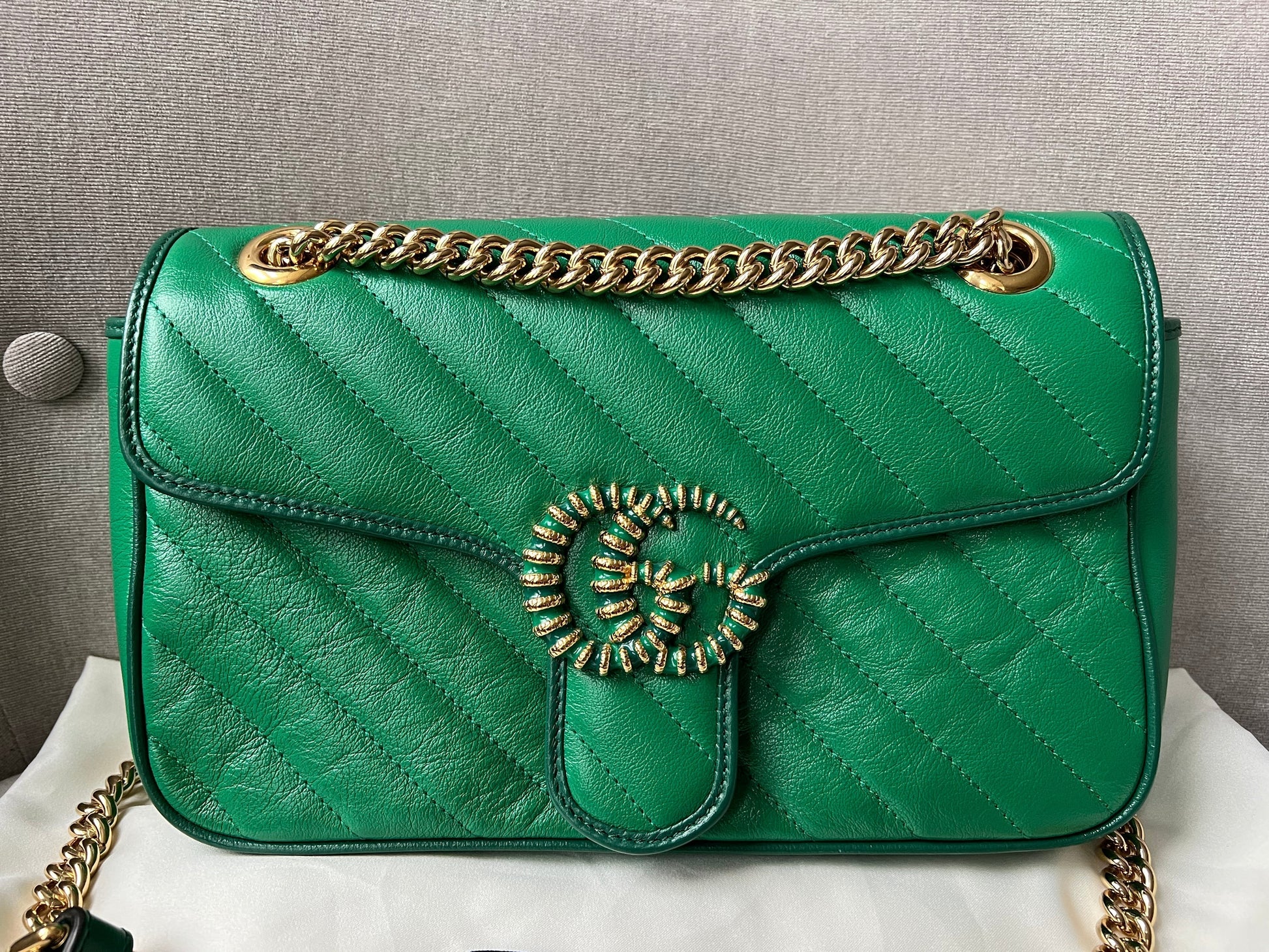 Gucci GG Marmont small shoulder bag in green chevron glazed matelasse leather with torchon gold hardware. This small Marmont bag has a softly structured shape and an oversized flap with GG hardware and heart detail on the back. The sliding chain can be multiple ways either doubled up or lengthened. Effortlessly chic and sophisticated, this style can be both with a casual outfit or for evening wear. Suitable for both event or occasion wear and ideal for those who prefer a cross body option. This colour combination is now discontinued. Note images 2 and 3 show black version for size reference.