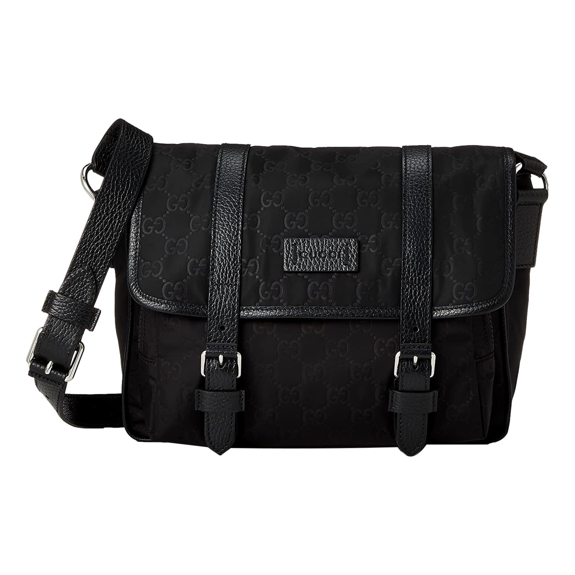 This nylon Gucci GG logo messenger bag is a sleek and sporty tote to add to your wardrobe. The color and design makes it easy to match with everyday styles, while the GG logo makes the classic Gucci statement. This bag features a durable nylon material with leather trim and leather Gucci tags. The interior of the bag features two slip pockets and two larger zip closure pockets. This bag is a great casual look for everyday wear - only from Gucci.